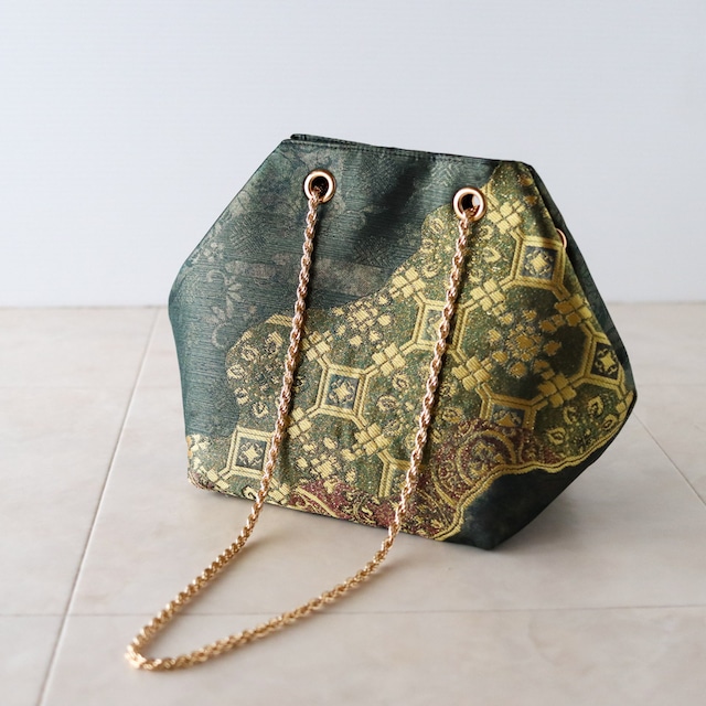 Obi Drawstring Bag Cube / 巾着チェーンバッグ キューブ型 袋帯からリメイクしました。 ダークグリーンの箔が美しく、さらにゴールドの細かな幾何学の模様が斜めに流れるように優雅にかかれたバッグです 上品なカラーとデザインを楽しめます コロンとしたかわいい見た目で、パーティーシーンでもお使いいただけます。 小さいサイズのペットボトルをいれることができます。 成人式や、結婚式などオケージョンにもおすすめです。 ◆チェーンカラー:ゴールド ◆size:横幅23cm×高さ18cm×マチ11cm×16cm チェーンストラップ:80~140cm(80、110、120,130,140で使用可能) ◆仕様:内ポケット:1つ ◆素材:帯:シルク 裏地・ポリエステル100% ◆生産国:日本製 ◆洗濯不可/あて布にてアイロン可 ◆◆ご注意 着物や帯は、アンティーク・ヴィンテージ・現在ものと幅広く取り扱っております。 素材は分かる範囲で記載しておりますが、正確性に欠ける場合がございます。 シミや汚れがあるものは、なるべく目立たないように裁断し制作しておりますが、場合によっては見える箇所にシミや汚れが残る場合がございます。 着物の過ごしてきた年月や味としてとらえていただければと思います。 絹生地は摩擦に弱く、長時間擦れた状態で過ごすと擦り切れてしまいます。 ご着用の衣類との相性にご注意ください。(リネン、デニム、コットン素材に注意) 濡れた状態ですと色が移る場合がありますのでご注意ください。 こちらはアップサイクル品です。 完璧にきれいな商品をお求めのかたはご購入をお控えいただきますようお願いいたします。 着物を楽しんでいただけますように◎ ------------------------------------------------------------------ ◆Chain color:gold ◆Size: Width 23cm x Height 18cm x Depth 11cm×16cm Chain strap: 80-140cm (can be used with 80, 110, 120, 130, 140) ◆Specifications: Inside pocket: 1 ◆Material: Obi:silk Lining: 100% polyester ◆Country of origin: Made in Japan ◆Cannot be washed/Can be ironed with a patch cloth ◆◆Please note We make using antique, vintage, and current kimonos and obi. Although we have listed the materials to the best of our knowledge, there may be cases where we have overlooked the accuracy. Items with stains or dirt are cut and manufactured to be as inconspicuous as possible, but in some cases, stains or dirt may remain in visible areas. I hope you can think of it as the years and tastes of kimono. Silk fabric is sensitive to friction and will wear out if left in a rubbing state for a long time. Please pay attention to the compatibility with the clothing you are wearing. (Pay special attention to linen, denim, and cotton materials) Please note that the color may transfer if it is wet. This is an upcycled product. If you are looking for a perfectly clean product, please refrain from purchasing. I hope you enjoy your kimono◎