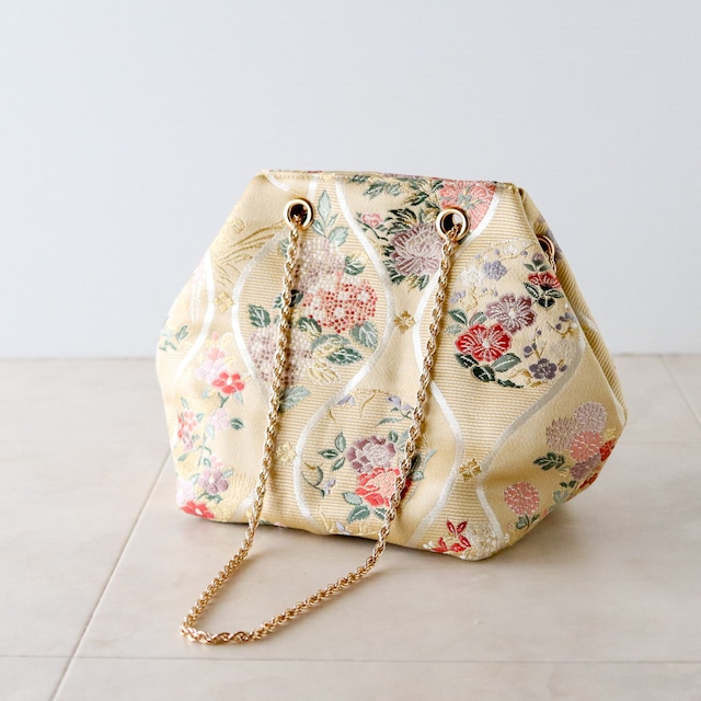 Obi Drawstring Bag Cube / 巾着チェーンバッグ キューブ型 袋帯からリメイクしました。 ベージュ地に落ち着いたゴールドカラーの立涌、その中に様々な四季の花がデザインされています ふたつの縦線が、波を打つように向かいあう立涌文様は、雲気(水蒸気)が立ち上がる状態を見立てた文様で、運気上昇の意味が込められ、縁起の良い文様とされています 細かなで繊細な四季花の模様が華やかで可愛らしさを感じるバッグです コロンとしたかわいい見た目で、パーティーシーンでもお使いいただけます。 小さいサイズのペットボトルをいれることができます。 成人式や、結婚式などオケージョンにもおすすめです。 ◆チェーンカラー:ゴールド ◆size:横幅23cm×高さ18cm×マチ11cm×16cm チェーンストラップ:80~140cm(80、110、120,130,140で使用可能) ◆仕様:内ポケット:1つ ◆素材:帯:シルク 裏地・ポリエステル100% ◆生産国:日本製 ◆洗濯不可/あて布にてアイロン可 ◆◆ご注意 着物や帯は、アンティーク・ヴィンテージ・現在ものと幅広く取り扱っております。 素材は分かる範囲で記載しておりますが、正確性に欠ける場合がございます。 シミや汚れがあるものは、なるべく目立たないように裁断し制作しておりますが、場合によっては見える箇所にシミや汚れが残る場合がございます。 着物の過ごしてきた年月や味としてとらえていただければと思います。 絹生地は摩擦に弱く、長時間擦れた状態で過ごすと擦り切れてしまいます。 ご着用の衣類との相性にご注意ください。(リネン、デニム、コットン素材に注意) 濡れた状態ですと色が移る場合がありますのでご注意ください。 こちらはアップサイクル品です。 完璧にきれいな商品をお求めのかたはご購入をお控えいただきますようお願いいたします。 着物を楽しんでいただけますように◎ ------------------------------------------------------------------ ◆Chain color:gold ◆Size: Width 23cm x Height 18cm x Depth 11cm×16cm Chain strap: 80-140cm (can be used with 80, 110, 120, 130, 140) ◆Specifications: Inside pocket: 1 ◆Material: Obi:silk Lining: 100% polyester ◆Country of origin: Made in Japan ◆Cannot be washed/Can be ironed with a patch cloth ◆◆Please note We make using antique, vintage, and current kimonos and obi. Although we have listed the materials to the best of our knowledge, there may be cases where we have overlooked the accuracy. Items with stains or dirt are cut and manufactured to be as inconspicuous as possible, but in some cases, stains or dirt may remain in visible areas. I hope you can think of it as the years and tastes of kimono. Silk fabric is sensitive to friction and will wear out if left in a rubbing state for a long time. Please pay attention to the compatibility with the clothing you are wearing. (Pay special attention to linen, denim, and cotton materials) Please note that the color may transfer if it is wet. This is an upcycled product. If you are looking for a perfectly clean product, please refrain from purchasing. I hope you enjoy your kimono◎
