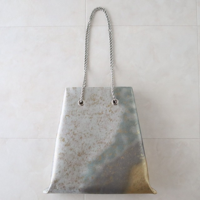 Obi Drawstring Bag Large/巾着チェーンバッグ ラージサイズ 袋帯をリメイクしたチェーンバッグです シルバー、抹茶、グレー、ゴールドのグラデーションの美しい地色に 細かな金が散らされ、シンプルな中にも華やかさもある素敵なバッグです 絶妙なカラーのグラデーションが、見る角度によって上品に輝きます 長財布とペットボトルも余裕をもって入れられるサイズ感です ◆チェーンカラー:シルバー ◆size:横幅28.5cm×高さ28cm×マチ0cm チェーンストラップ:80~140cm(80、110、120,130,140で使用可能) ◆仕様:内ポケット:1つ ◆素材:帯:100% シルクとその他繊維 裏地・ポリエステル100% ◆生産国:日本製 ◆洗濯不可/あて布にてアイロン可 ◆◆ご注意 着物や帯は、アンティーク・ヴィンテージ・現在ものと幅広く取り扱っております。 素材は分かる範囲で記載しておりますが、正確性に欠ける場合がございます。 シミや汚れがあるものは、なるべく目立たないように裁断し制作しておりますが、場合によっては見える箇所にシミや汚れが残る場合がございます。 着物の過ごしてきた年月や味としてとらえていただければと思います。 絹生地は摩擦に弱く、長時間擦れた状態で過ごすと擦り切れてしまいます。 ご着用の衣類との相性にご注意ください。(リネン、デニム、コットン素材に注意) 濡れた状態ですと色が移る場合がありますのでご注意ください。 こちらはアップサイクル品です。 完璧にきれいな商品をお求めのかたはご購入をお控えいただきますようお願いいたします。 着物を楽しんでいただけますように◎ ------------------------------------------------------------------ ◆Chain color:silver ◆Size: Width 28.5cm x Height 28cm x Depth 0cm Chain strap: 80-140cm (can be used with 80, 110, 120, 130, 140) ◆Specifications: Inside pocket: 1 ◆Material: obi: 100% silk and other fibers Lining: 100% polyester ◆Country of origin: Made in Japan ◆Cannot be washed/Can be ironed with a patch cloth ◆◆Please note We make using antique, vintage, and current kimonos and obi. Although we have listed the materials to the best of our knowledge, there may be cases where we have overlooked the accuracy. Items with stains or dirt are cut and manufactured to be as inconspicuous as possible, but in some cases, stains or dirt may remain in visible areas. I hope you can think of it as the years and tastes of kimono. Silk fabric is sensitive to friction and will wear out if left in a rubbing state for a long time. Please pay attention to the compatibility with the clothing you are wearing. (Pay special attention to linen, denim, and cotton materials) Please note that the color may transfer if it is wet. This is an upcycled product. If you are looking for a perfectly clean product, please refrain from purchasing. I hope you enjoy your kimono◎