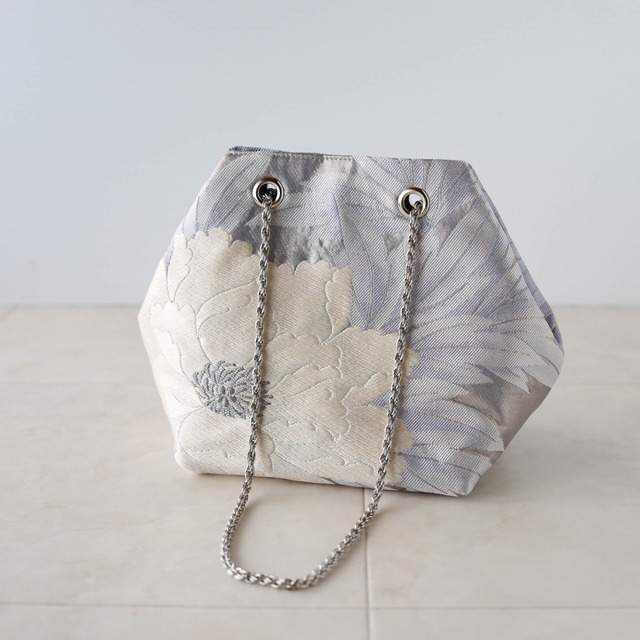 Obi Drawstring Bag Cube / 巾着チェーンバッグ キューブ型 袋帯からリメイクしました ブルーグレーの葉と大きな牡丹が印象的なバッグです 表側は白牡丹、反対側は淡いピンク色の牡丹の模様で、 どちらをメインして持つかで気分に合わせて二通りの楽しみ方ができます コロンとしたかわいい見た目で、パーティーシーンでもお使いいただけます。 小さいサイズのペットボトルをいれることができます。 成人式や、七五三、入学式、結婚式などオケージョンにもおすすめです。 ◆カラー:グレーブルーに牡丹模様 チェーンカラー:シルバー ◆size:横幅23cm×高さ18cm×マチ11cm×16cm チェーンストラップ:80~140cm(80、110、120,130,140で使用可能) ◆仕様:内ポケット:1つ ◆素材:帯:シルクとその他繊維(引箔) 裏地・ポリエステル100% ◆生産国:日本製 ◆洗濯不可/あて布にてアイロン可 ◆◆ご注意 着物や帯は、アンティーク・ヴィンテージ・現在ものと幅広く取り扱っております。 素材は分かる範囲で記載しておりますが、正確性に欠ける場合がございます。 シミや汚れがあるものは、なるべく目立たないように裁断し制作しておりますが、場合によっては見える箇所にシミや汚れが残る場合がございます。 着物の過ごしてきた年月や味としてとらえていただければと思います。 絹生地は摩擦に弱く、長時間擦れた状態で過ごすと擦り切れてしまいます。 ご着用の衣類との相性にご注意ください。(リネン、デニム、コットン素材に注意) 濡れた状態ですと色が移る場合がありますのでご注意ください。 こちらはアップサイクル品です。 完璧にきれいな商品をお求めのかたはご購入をお控えいただきますようお願いいたします。 着物を楽しんでいただけますように◎ ------------------------------------------------------------------ ◆Color:Gray-blue Chain color:silver ◆Size: Width 23cm x Height 18cm x Depth 11cm×16cm Chain strap: 80-140cm (can be used with 80, 110, 120, 130, 140) ◆Specifications: Inside pocket: 1 ◆Material: Obi:silk &Other fibers(HIKIABKU) Lining: 100% polyester ◆Country of origin: Made in Japan ◆Cannot be washed/Can be ironed with a patch cloth ◆◆Please note We make using antique, vintage, and current kimonos and obi. Although we have listed the materials to the best of our knowledge, there may be cases where we have overlooked the accuracy. Items with stains or dirt are cut and manufactured to be as inconspicuous as possible, but in some cases, stains or dirt may remain in visible areas. I hope you can think of it as the years and tastes of kimono. Silk fabric is sensitive to friction and will wear out if left in a rubbing state for a long time. Please pay attention to the compatibility with the clothing you are wearing. (Pay special attention to linen, denim, and cotton materials) Please note that the color may transfer if it is wet. This is an upcycled product. If you are looking for a perfectly clean product, please refrain from purchasing. I hope you enjoy your kimono◎