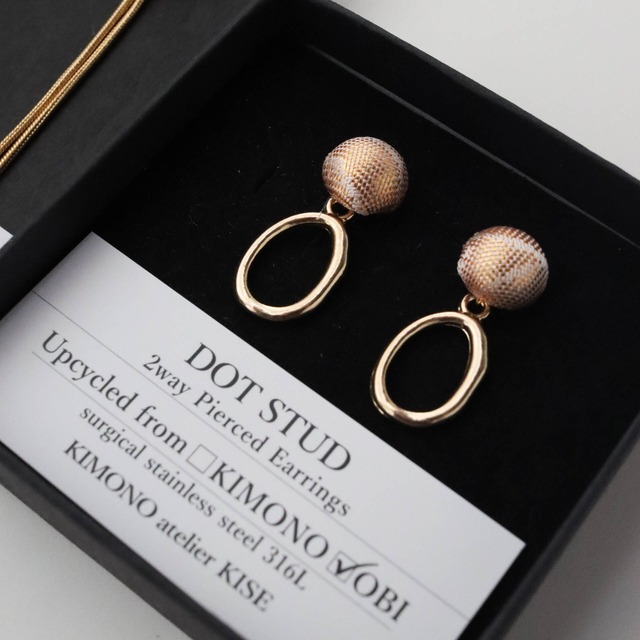 袋帯から、ぷくっとした丸みのある1粒を作り、耳元を彩るアイテムへとアップアップサイクルしました 光の当たる角度によって上品に輝く、日本の伝統的な優美な美しさを楽しんでください ベースカラー(GL/SI)、チャーム(5種)、ピアスまたはイヤリングをご選択いただけます プレゼントや保管におすすめな、BOX入りパッケージの用意もございます 自分好みで選べるチャームは取り外しが可能で、お持ちのピアスとも組み合わせ可能です ■素材 ベース:サージカルステンレス316L/ポストとシリコン/キャッチ 帯:正絹または絹とその他繊維 アルミ ■サイズ 直径:10mm、厚み:6mm ■付属品(選択品) ・Loop (合金/全長2cm) ・Single Chain (ステンレス/全長5cm) ・Tassel Chain (ステンレス/全長4cm) ・Snake Chain (ステンレス/全長6.5cm) ・Natural Pearl (淡水パール/5㎜) ・Clip-ON Earring Converter (胴) ■カラー ゴールドとオフホワイト ■ラッピングについて メッセージタグのギフトラッピングを用意しております 詳しくは下記URLをご覧ください。 https://store.kimono-kise.com/items/94701026 ■ご注意 ・こちらは、袋帯からアップサイクルしたピアス/イヤリングです ・生地の取り方によって柄の見え方が変わる場合がございます ・ベースはアレルギーの起こりにくい素材を使用しておりますが、万が一、不調を感じられる場合はご使用の中止をお願いいたします。