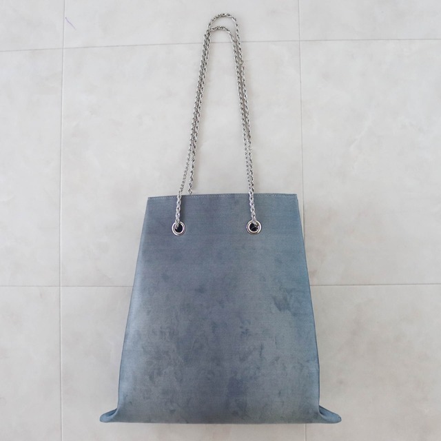 Obi Drawstring Bag Large/巾着チェーンバッグ ラージサイズ 袋帯をリメイクしたチェーンバッグです ツヤっとした地模様のあるシルバー地に、 グレーブルーのまだらカラーが美しいバッグです。 遠くからのイメージと近くで見たときのイメージでの違いを楽しめると思います。 長財布とペットボトルも余裕をもって入れられるサイズ感。 チェーンは斜め掛けまで対応可能ですが、 一番短い80cmで手持ちスタイル、120cmで肩掛けスタイルがおすすめです。 ◆カラー:シルバーにブルグレーのぼかし模様 チェーンカラー:シルバー ◆size:横幅28.5cm×高さ28cm×マチ0cm チェーンストラップ:80~140cm(80、110、120,130,140で使用可能) ◆仕様:内ポケット:1つ ◆素材:帯:シルク 100% 裏地・ポリエステル100% ◆生産国:日本製 ◆洗濯不可/あて布にてアイロン可 ◆◆ご注意 着物や帯は、アンティーク・ヴィンテージ・現在ものと幅広く取り扱っております。 素材は分かる範囲で記載しておりますが、正確性に欠ける場合がございます。 シミや汚れがあるものは、なるべく目立たないように裁断し制作しておりますが、場合によっては見える箇所にシミや汚れが残る場合がございます。 着物の過ごしてきた年月や味としてとらえていただければと思います。 絹生地は摩擦に弱く、長時間擦れた状態で過ごすと擦り切れてしまいます。 ご着用の衣類との相性にご注意ください。(リネン、デニム、コットン素材に注意) 濡れた状態ですと色が移る場合がありますのでご注意ください。 こちらはアップサイクル品です。 完璧にきれいな商品をお求めのかたはご購入をお控えいただきますようお願いいたします。 着物を楽しんでいただけますように◎ ------------------------------------------------------------------ ◆Color:Silver with blue-gray mottled pattern Chain color:silver ◆Size: Width 28.5cm x Height 28cm x Depth 0cm Chain strap: 80-140cm (can be used with 80, 110, 120, 130, 140) ◆Specifications: Inside pocket: 1 ◆Material: Kimono: 100% silk Lining: 100% polyester ◆Country of origin: Made in Japan ◆Cannot be washed/Can be ironed with a patch cloth ◆◆Please note We make using antique, vintage, and current kimonos and obi. Although we have listed the materials to the best of our knowledge, there may be cases where we have overlooked the accuracy. Items with stains or dirt are cut and manufactured to be as inconspicuous as possible, but in some cases, stains or dirt may remain in visible areas. I hope you can think of it as the years and tastes of kimono. Silk fabric is sensitive to friction and will wear out if left in a rubbing state for a long time. Please pay attention to the compatibility with the clothing you are wearing. (Pay special attention to linen, denim, and cotton materials) Please note that the color may transfer if it is wet. This is an upcycled product. If you are looking for a perfectly clean product, please refrain from purchasing. I hope you enjoy your kimono◎