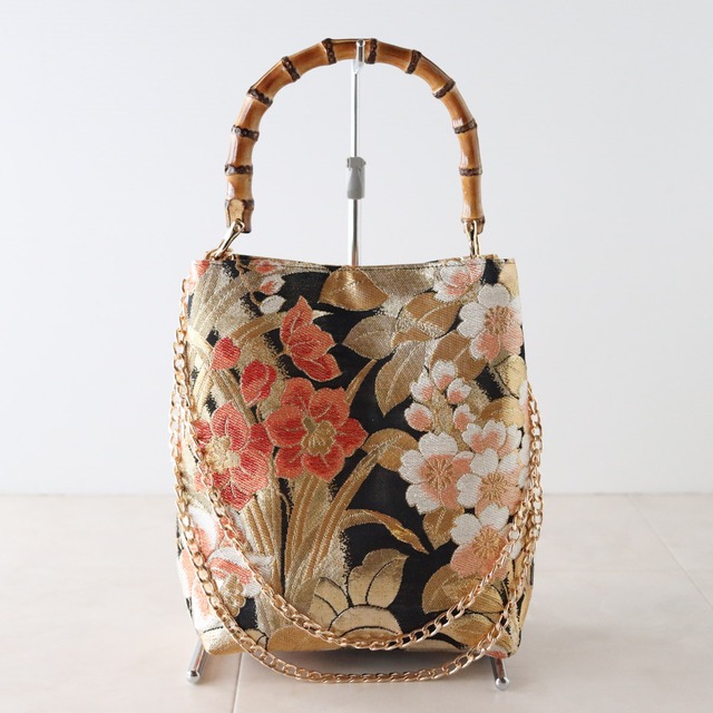Bamboo Handle Bag 17/ バンブーハンドルバッグ17 横幅17cmタイプ、袋帯をリメイクしたワンハンドルバンブーバッグ 【再販売】1~7枚目の画像が今回の販売品です/着用写真とは柄の出方が異なる場合がございます ブラック地に、牡丹や桜、桔梗など四季の様々な花が大胆に配置された ロマンチック雰囲気も感じるデザインのバッグです 表と裏で異なるデザインですので、気分に合わせてお持ちください コンパクトな見た目ながら、500mlのペットボトルと長財布 リップやハンカチなど必要最低限の荷物がはいります バンブーハンドルとショルダーチェーンは取り外しが可能です バンブーハンドルを外せばシンプルなチェーンバッグとして 華やなお祝いのシーンにもおすすめです チェーンを外せば、和装にもピッタリなバンブーバッグになります もちろん、両方をつけてご利用いただくのもおすすめです◎ チェーンを二重にすると肩掛けにちょうど良い長さになります◎ カジュアルな装いからパーティーシーンまでたくさんご利用いただけたら嬉しいです! ◆チェーンカラー:ゴールド ◆size:横幅17~19cm×高さ22cm×マチ10cm チェーンストラップ:120cm ◆仕様:オープンポケット2つ ◆素材 帯:シルクとその他繊維 裏地:ポリエステル100% 持ち手:竹 ◆生産国:日本製 ◆洗濯不可/あて布にてアイロン可 ◆◆ご注意 着物や帯は、アンティーク・ヴィンテージ・現在ものと幅広く取り扱っております。 素材は分かる範囲で記載しておりますが、正確性に欠ける場合がございます。 シミや汚れがあるものは、なるべく目立たないように裁断し制作しておりますが、場合によっては見える箇所にシミや汚れが残る場合がございます。 着物の過ごしてきた年月や味としてとらえていただければと思います。 絹生地は摩擦に弱く、長時間擦れた状態で過ごすと擦り切れてしまいます。 ご着用の衣類との相性にご注意ください。(リネン、デニム、コットン素材に注意) 濡れた状態ですと色が移る場合がありますのでご注意ください。 こちらはアップサイクル品です。 完璧にきれいな商品をお求めのかたはご購入をお控えいただきますようお願いいたします。 着物を楽しんでいただけますように◎ ------------------------------------------------------------------ Bamboo Handle Bag 17 This 17cm wide, one-handle bamboo bag is crafted from a repurposed obi (sash). Despite its compact size, it can hold a 500ml water bottle, a long wallet, lipstick, a handkerchief, and other essentials. The bamboo handle and shoulder chain are detachable. Remove the bamboo handle to turn it into a simple chain bag. Recommended for glamorous celebrations. Remove the chain to create a bamboo bag that pairs perfectly with traditional Japanese clothing. Of course, we also recommend wearing both. ◎ Doubling the chain makes it the perfect length for shoulder wear. ◎ We hope you'll enjoy this bag for a variety of occasions, from casual wear to parties! ◆Size: Width 17cm x Height22cm x Depth 10cm Chain strap: 120cm ◆Specifications: open pocket: 2 ◆Material: Obi: Silk and other fibers Lining: 100% polyester Handle: Bamboo ◆Country of origin: Made in Japan ◆Cannot be washed/Can be ironed with a patch cloth ◆◆Please note We make using antique, vintage, and current kimonos and obi. Although we have listed the materials to the best of our knowledge, there may be cases where we have overlooked the accuracy. Items with stains or dirt are cut and manufactured to be as inconspicuous as possible, but in some cases, stains or dirt may remain in visible areas. I hope you can think of it as the years and tastes of kimono. Silk fabric is sensitive to friction and will wear out if left in a rubbing state for a long time. Please pay attention to the compatibility with the clothing you are wearing. (Pay special attention to linen, denim, and cotton materials) Please note that the color may transfer if it is wet. This is an upcycled product. If you are looking for a perfectly clean product, please refrain from purchasing. I hope you enjoy your kimono◎