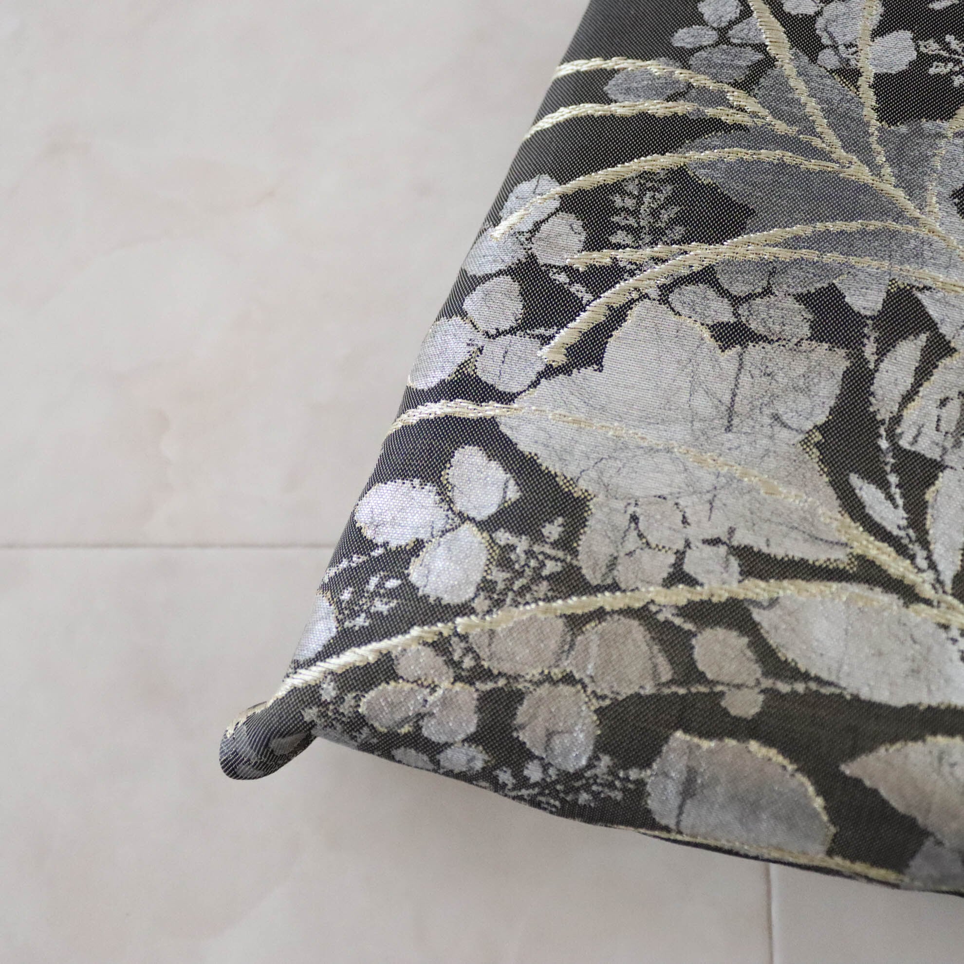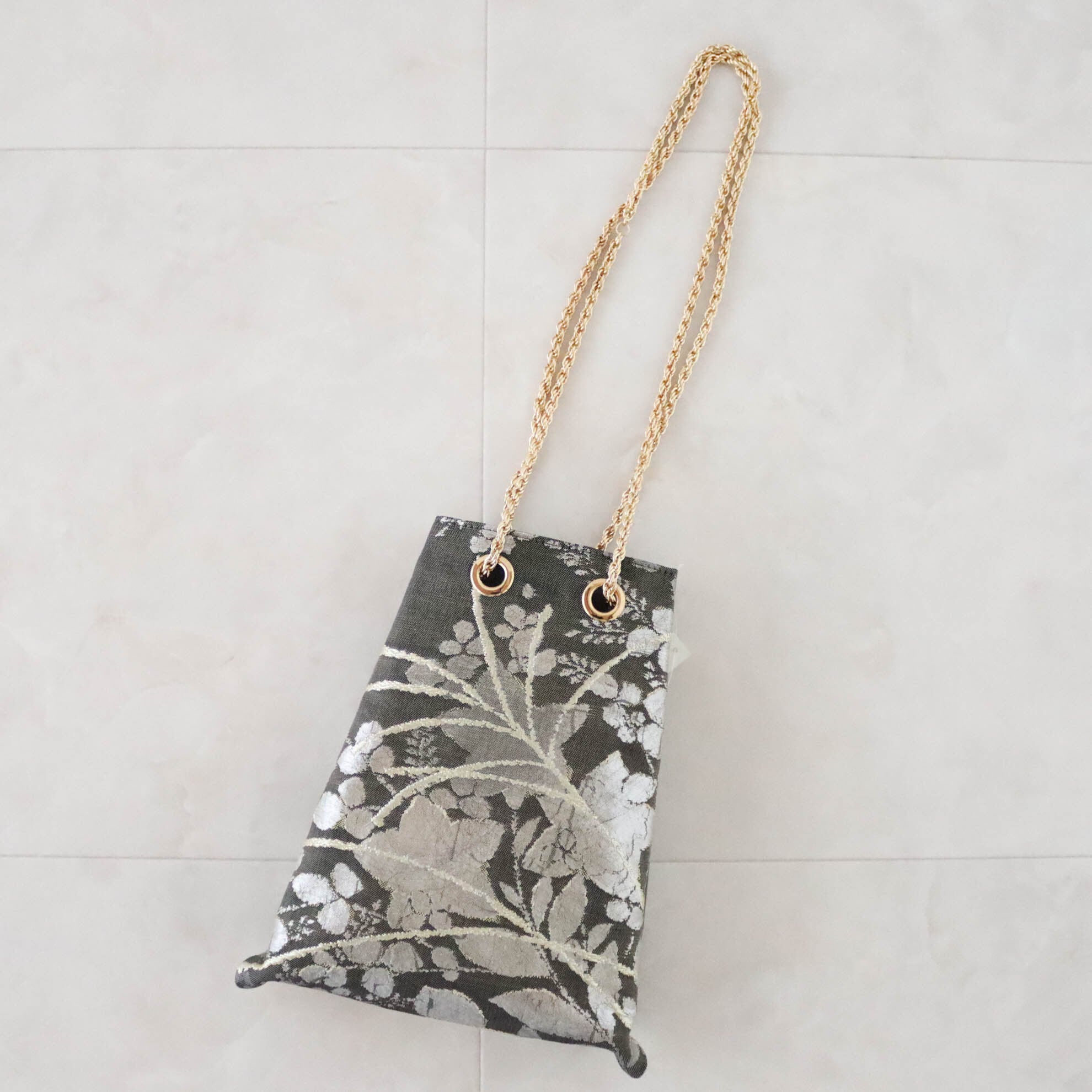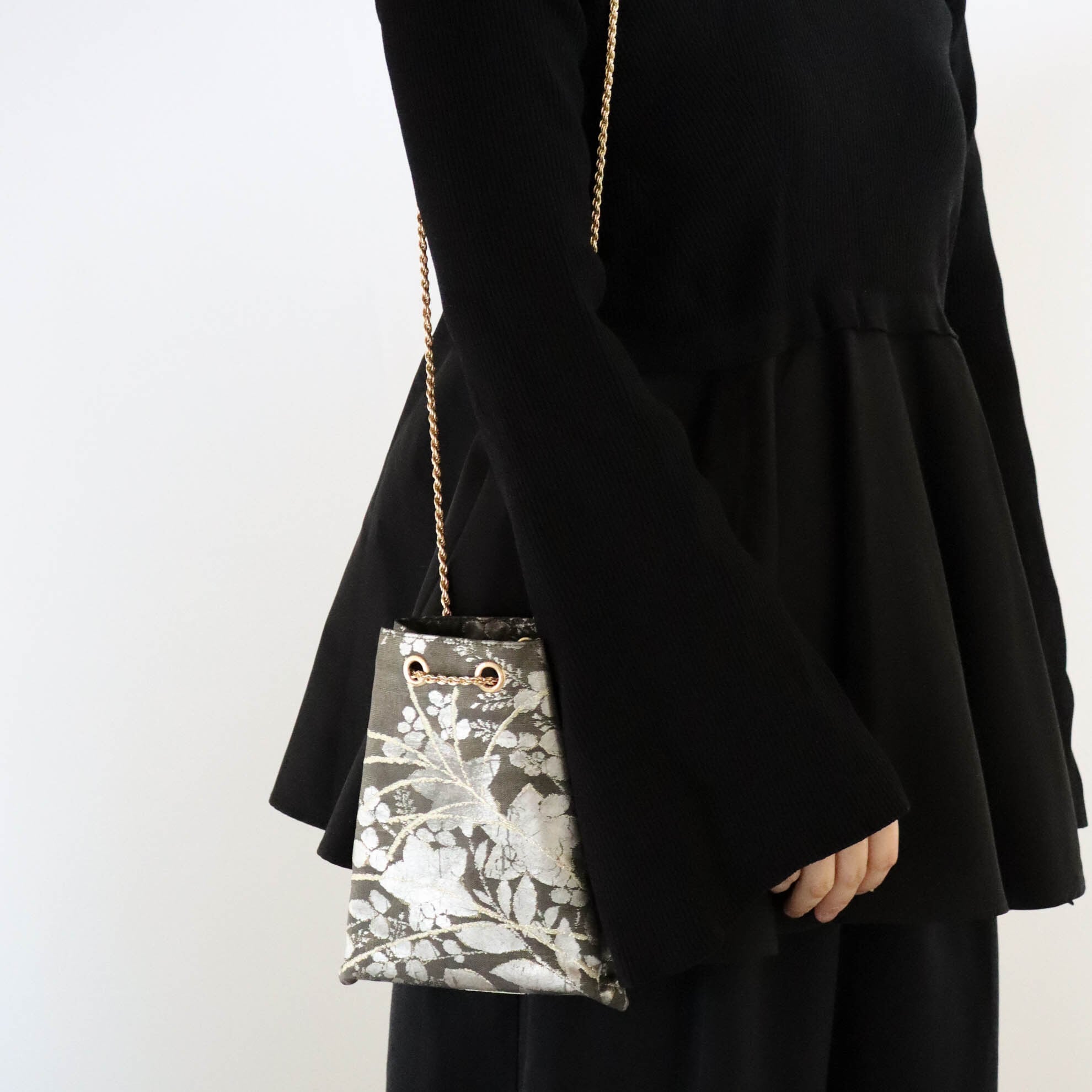 Mini Kimono Drawstring Bag / チャコールに銀枝花/Silver branch flower pattern on charcoal