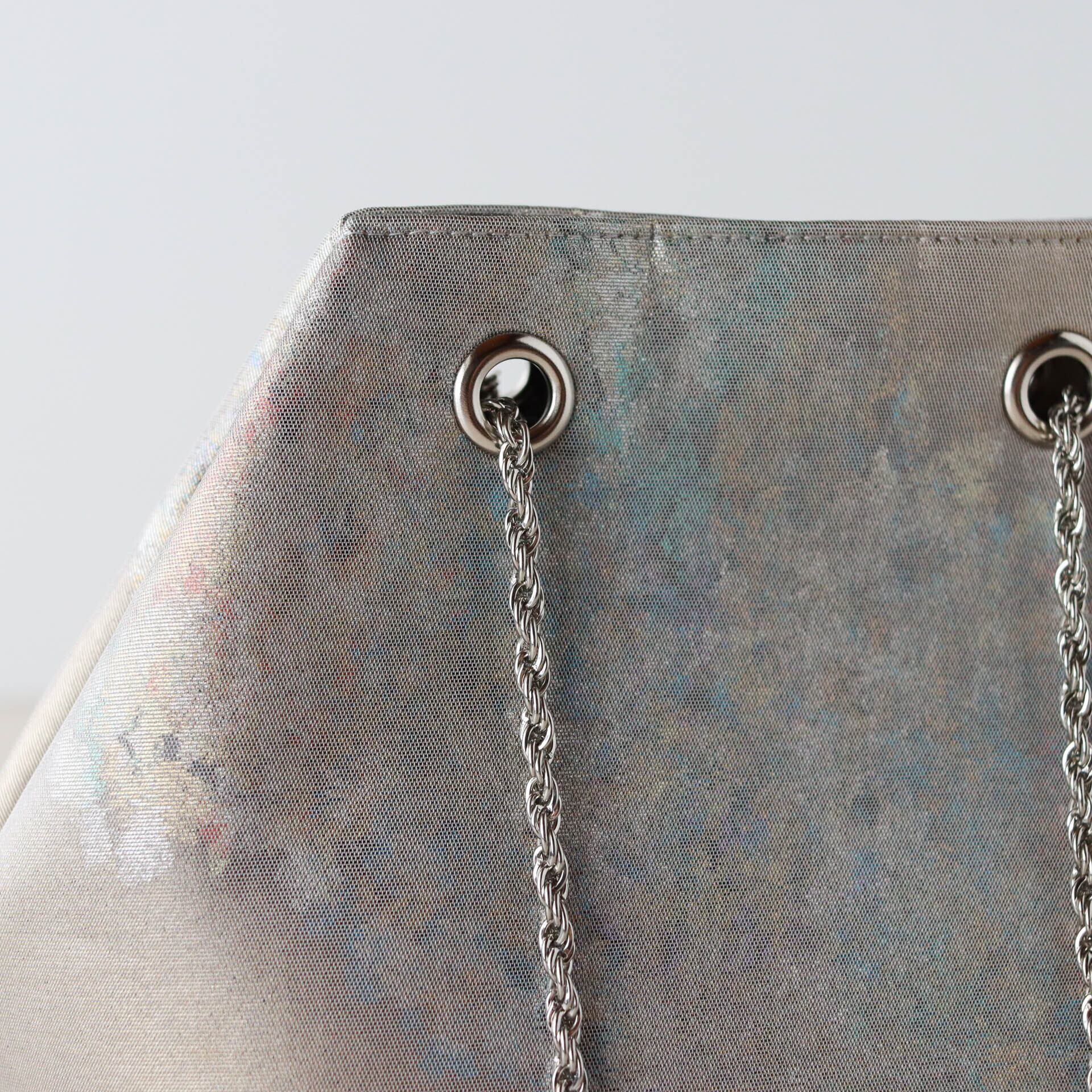 落ち着いたグレーシルバー地に流れるプリズムカラー