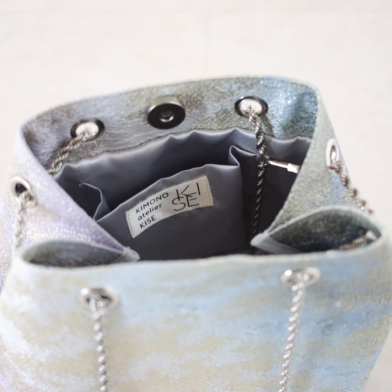 ラメのきらめきがある生地に紫からブルーへのグラデーションが美しく