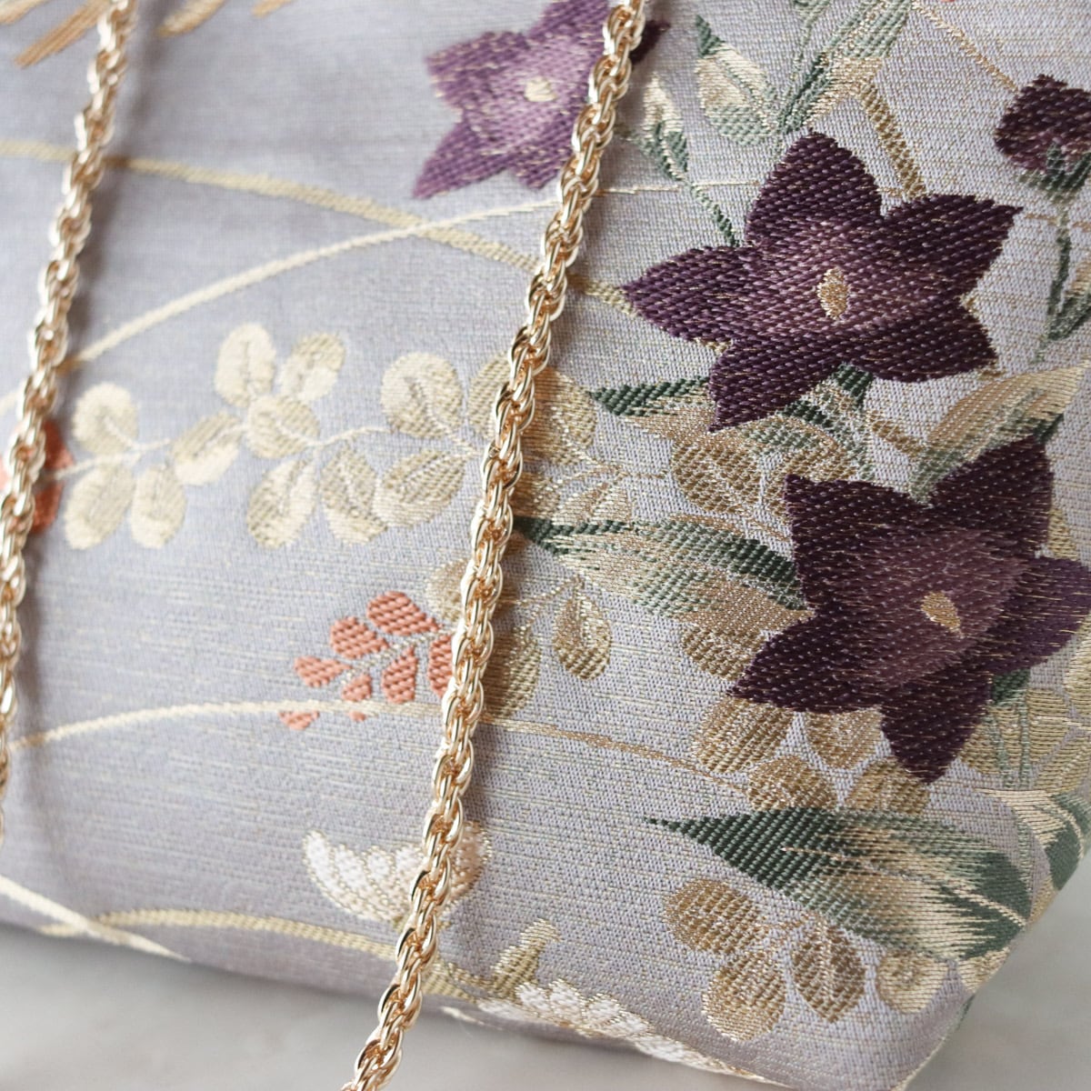 くすみのある落ち着いた色合いのパープルに桔梗や草花模様がエレガントな雰囲気