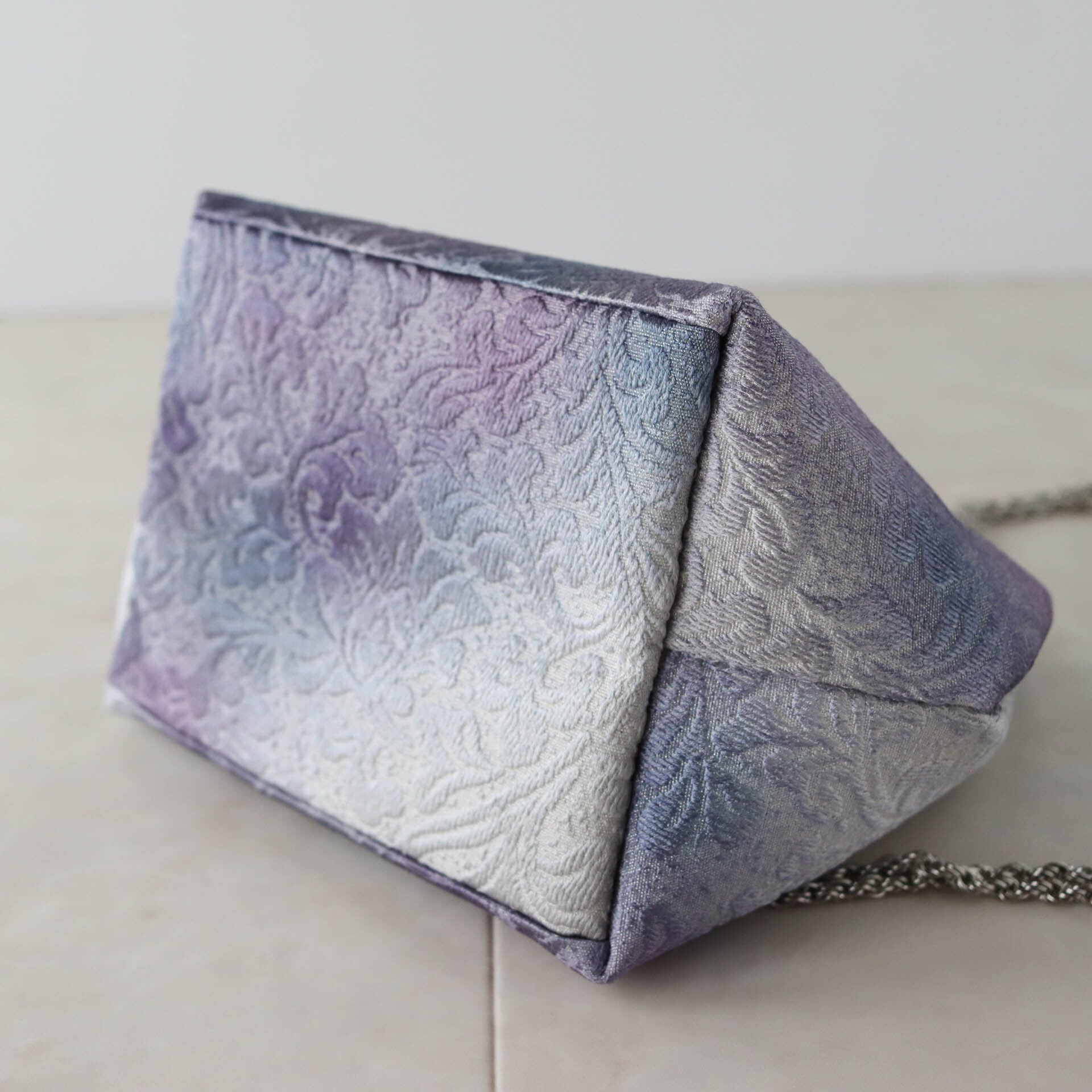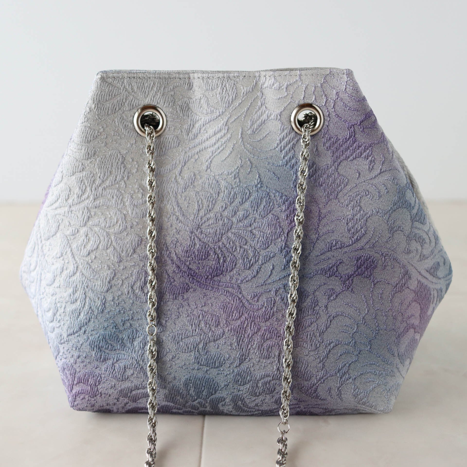 地模様のある薄いグレー地に紫と青のグラデーションが美しいバッグです