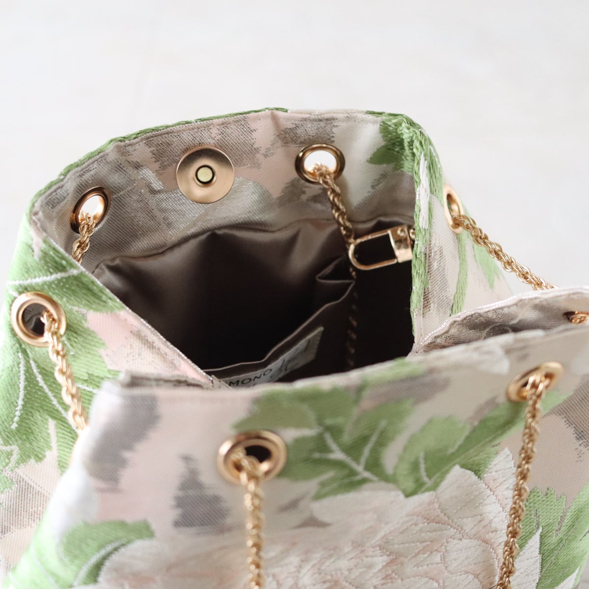 淡いピンク地に大きな牡丹模様が素敵なバッグです