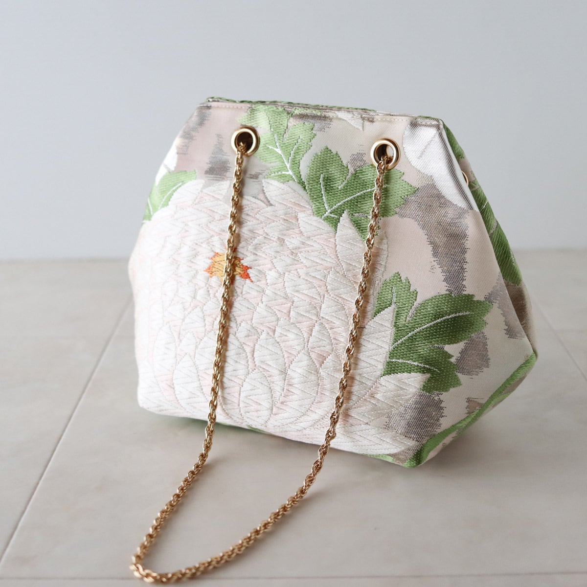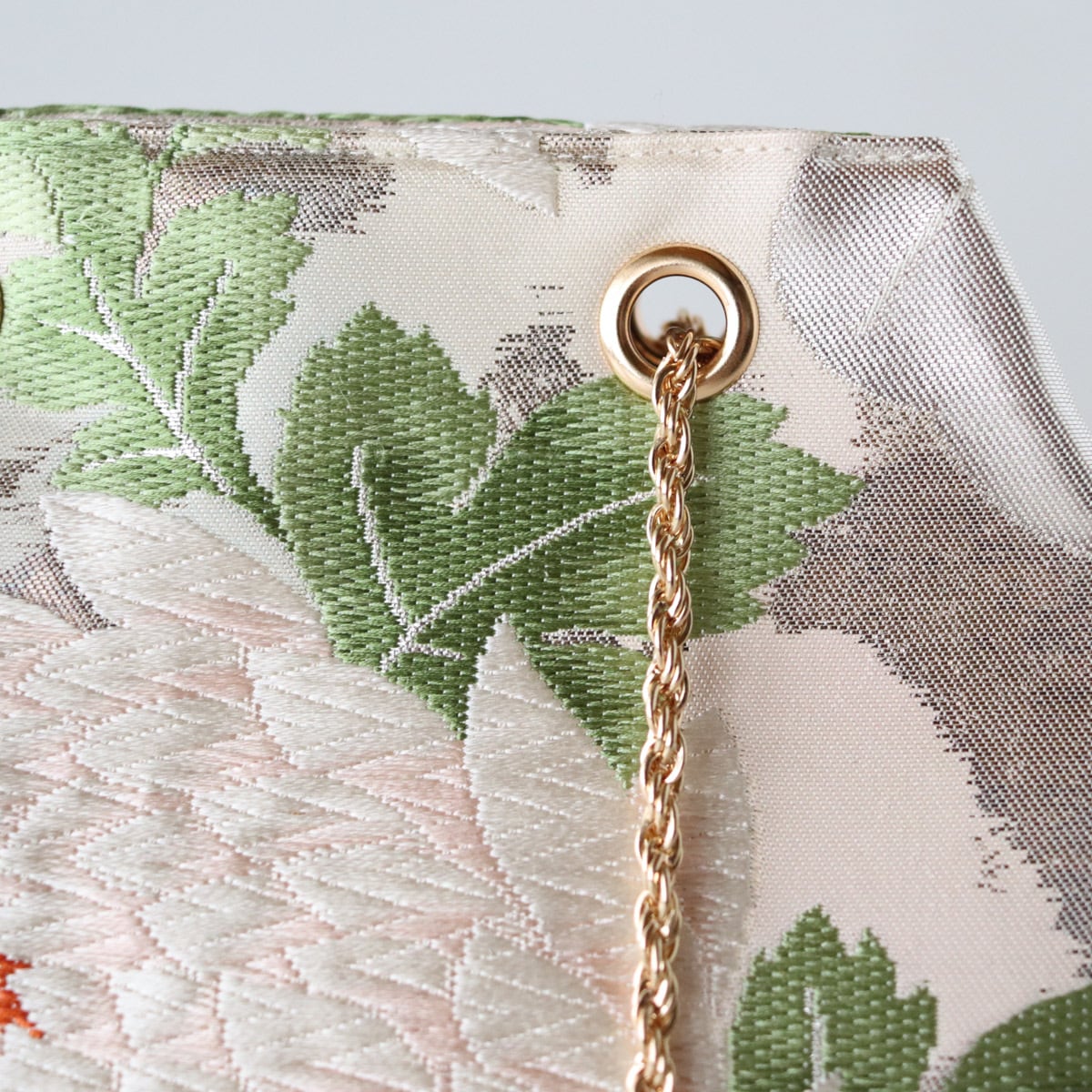 ピンク色がメインとなりますが、葉っぱの緑のカラーも美しく、それが差し色となり可愛らしくなりずぎずお持ちいただけるかと思います