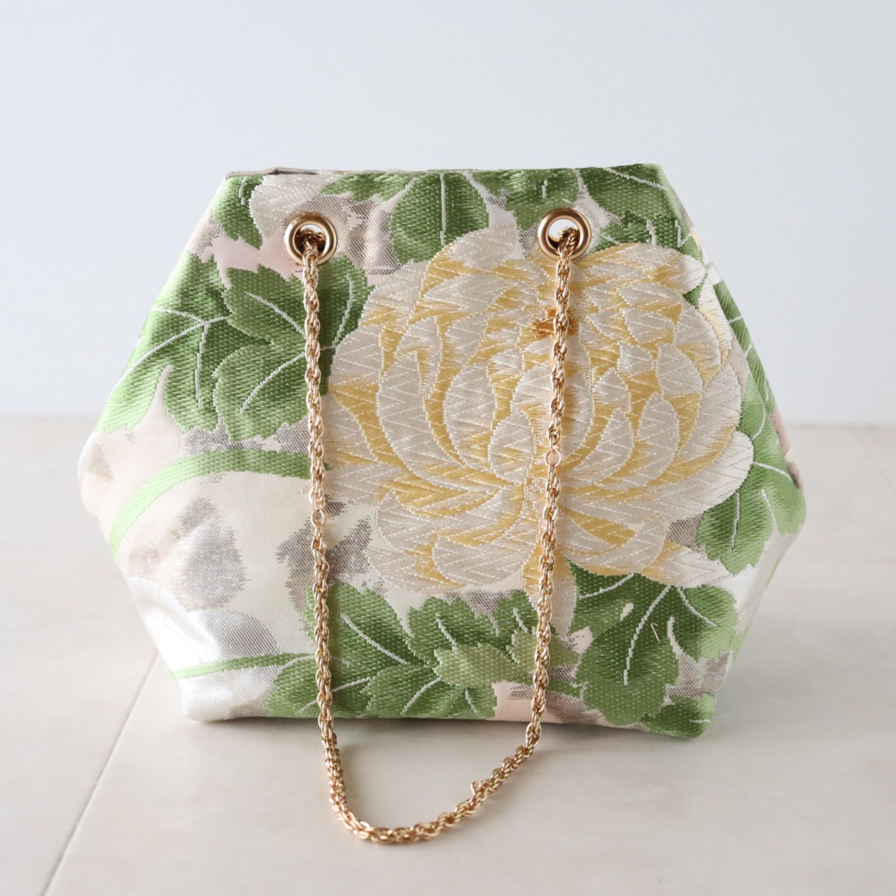 Obi Drawstring Bag Cube /淡いピンクに牡丹/ Pale pink with peonies