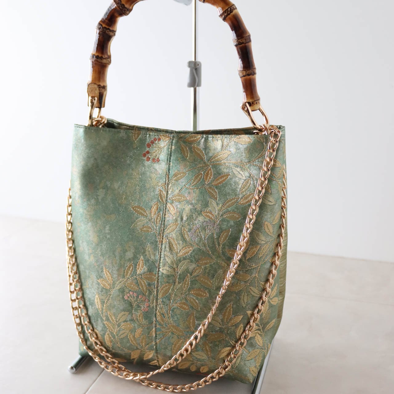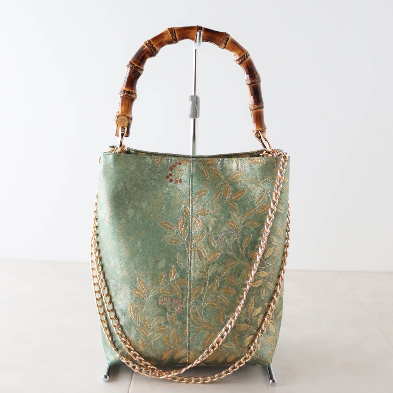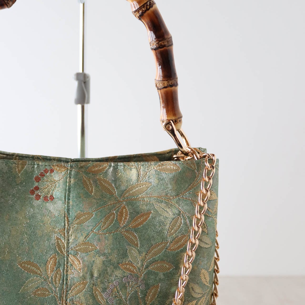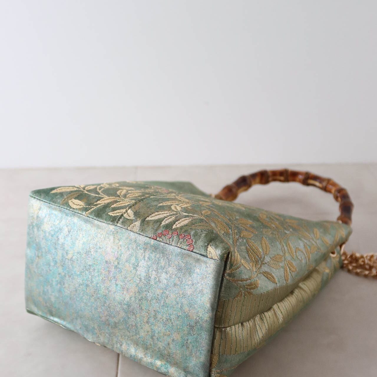Bamboo Handle Bag 17/グリーン地に枝葉紋/ 帯リメイク