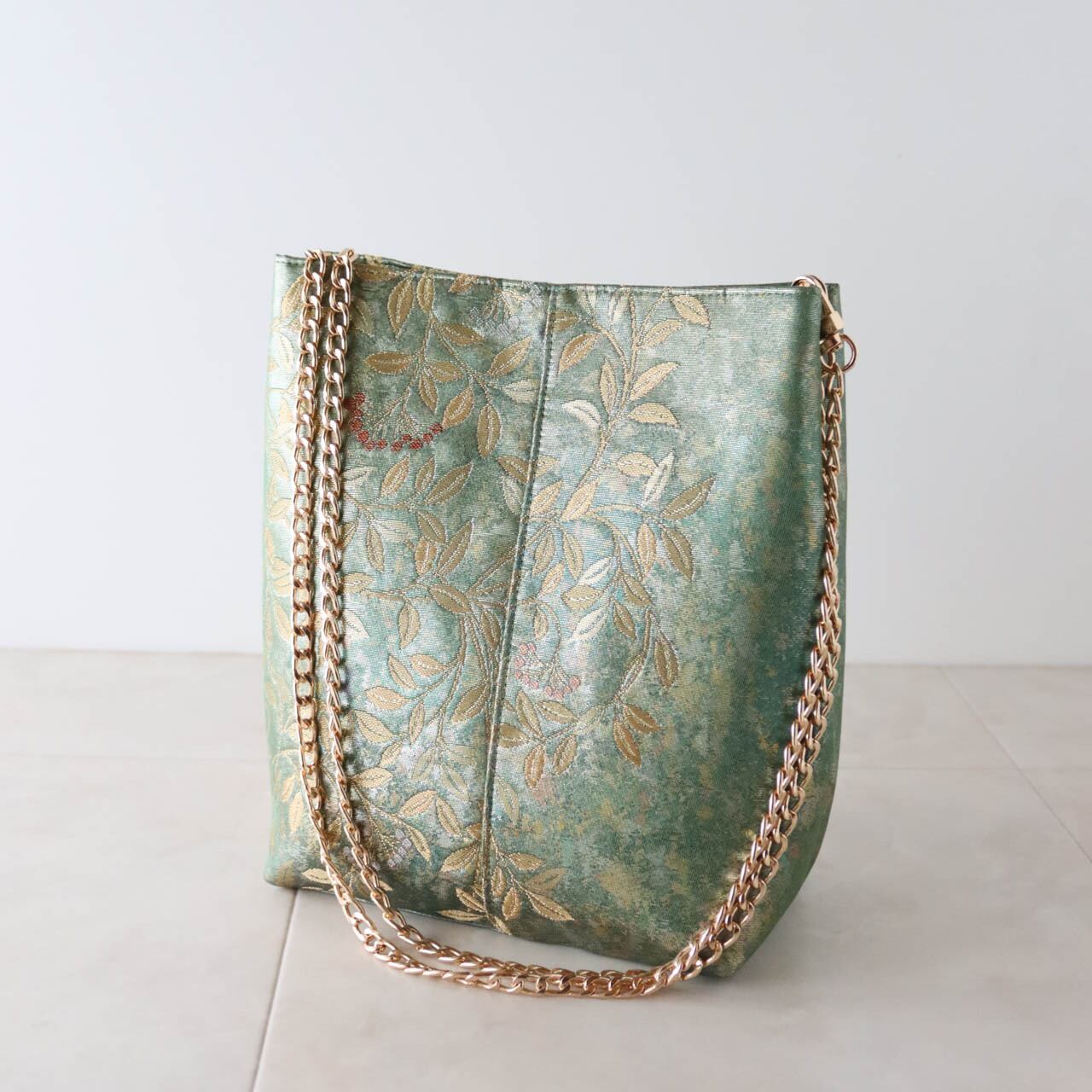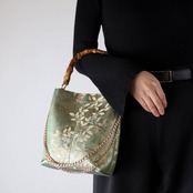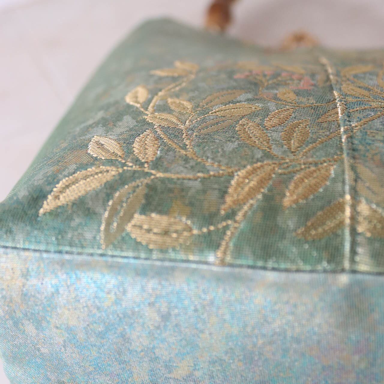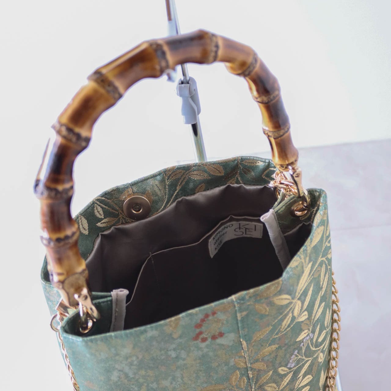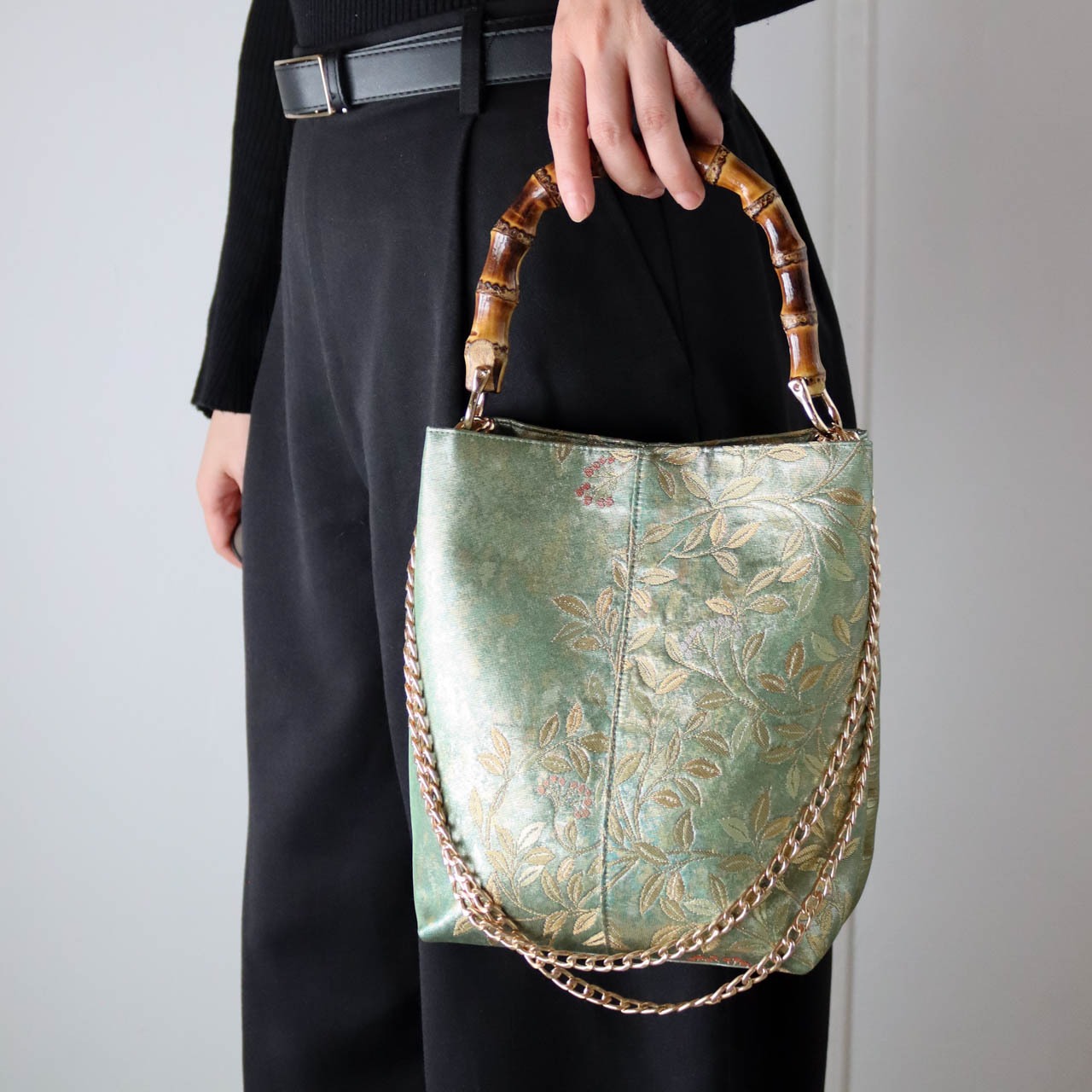 Bamboo Handle Bag 17/グリーン地に枝葉紋/ 帯リメイク