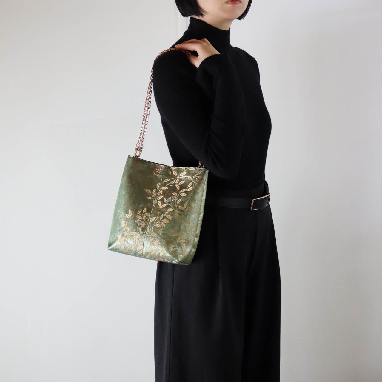 光沢のあるグリーン地にゴールドで優雅に書かれた枝葉模様が美しいバッグです。