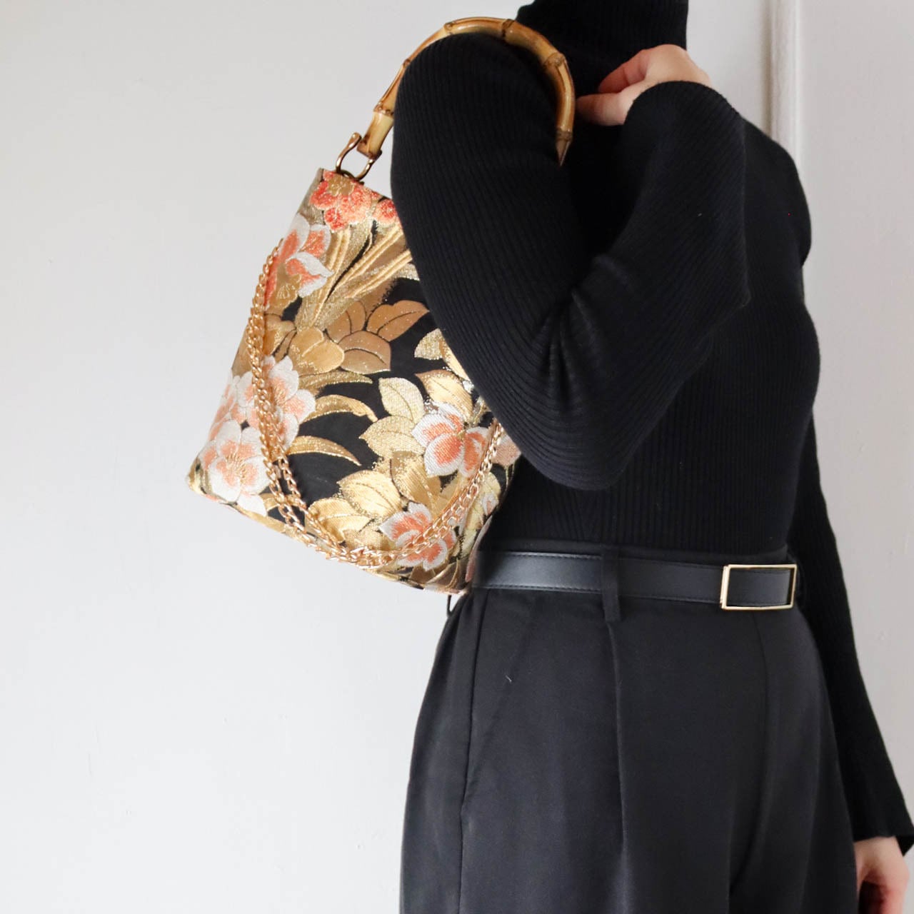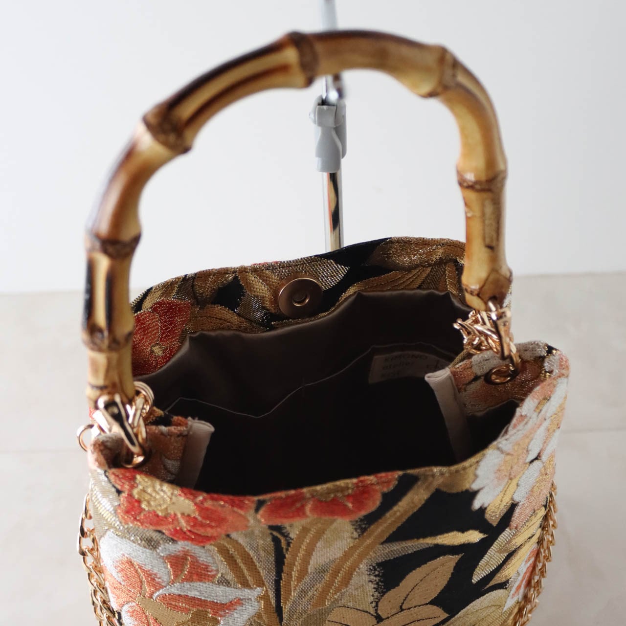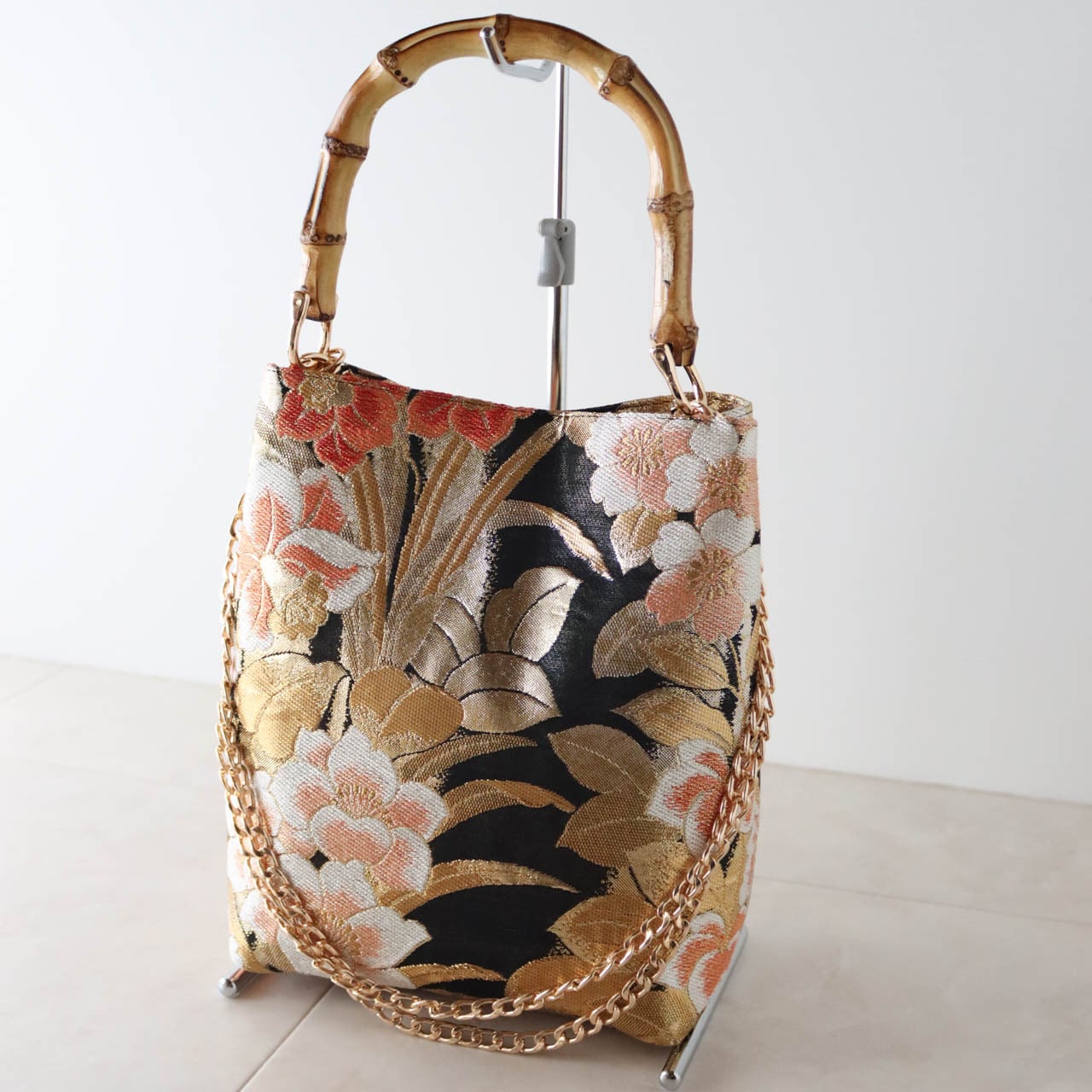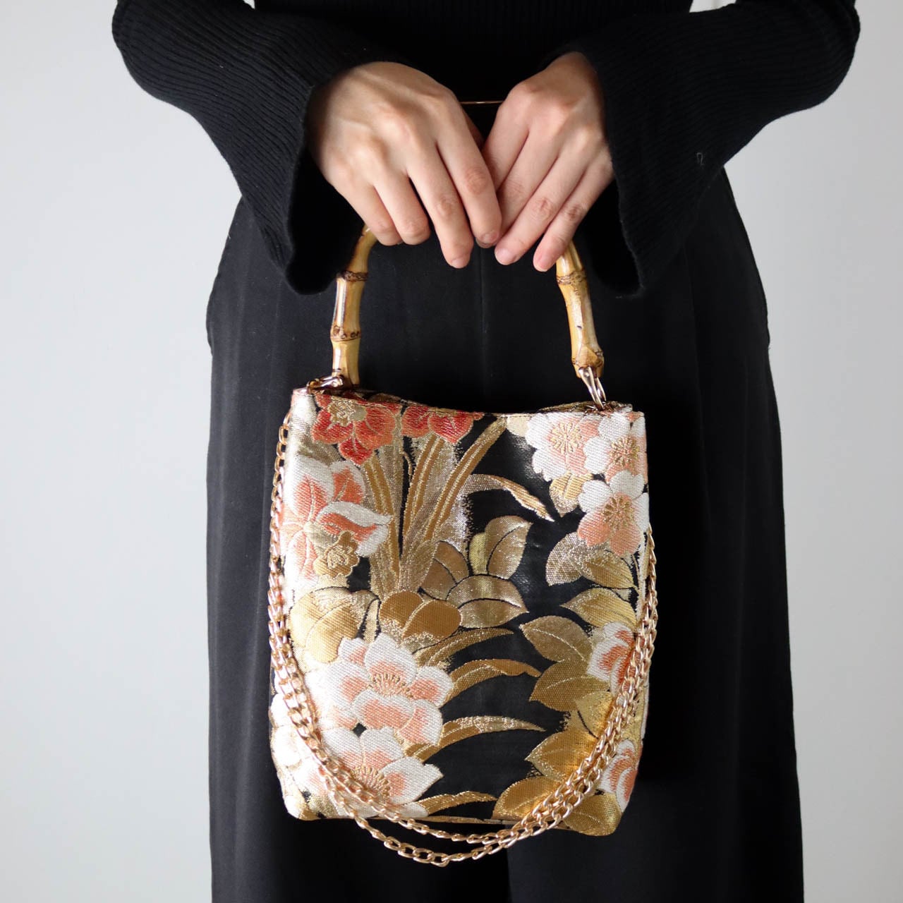 Bamboo Handle Bag 17/ブラックに四季花/ 帯リメイク