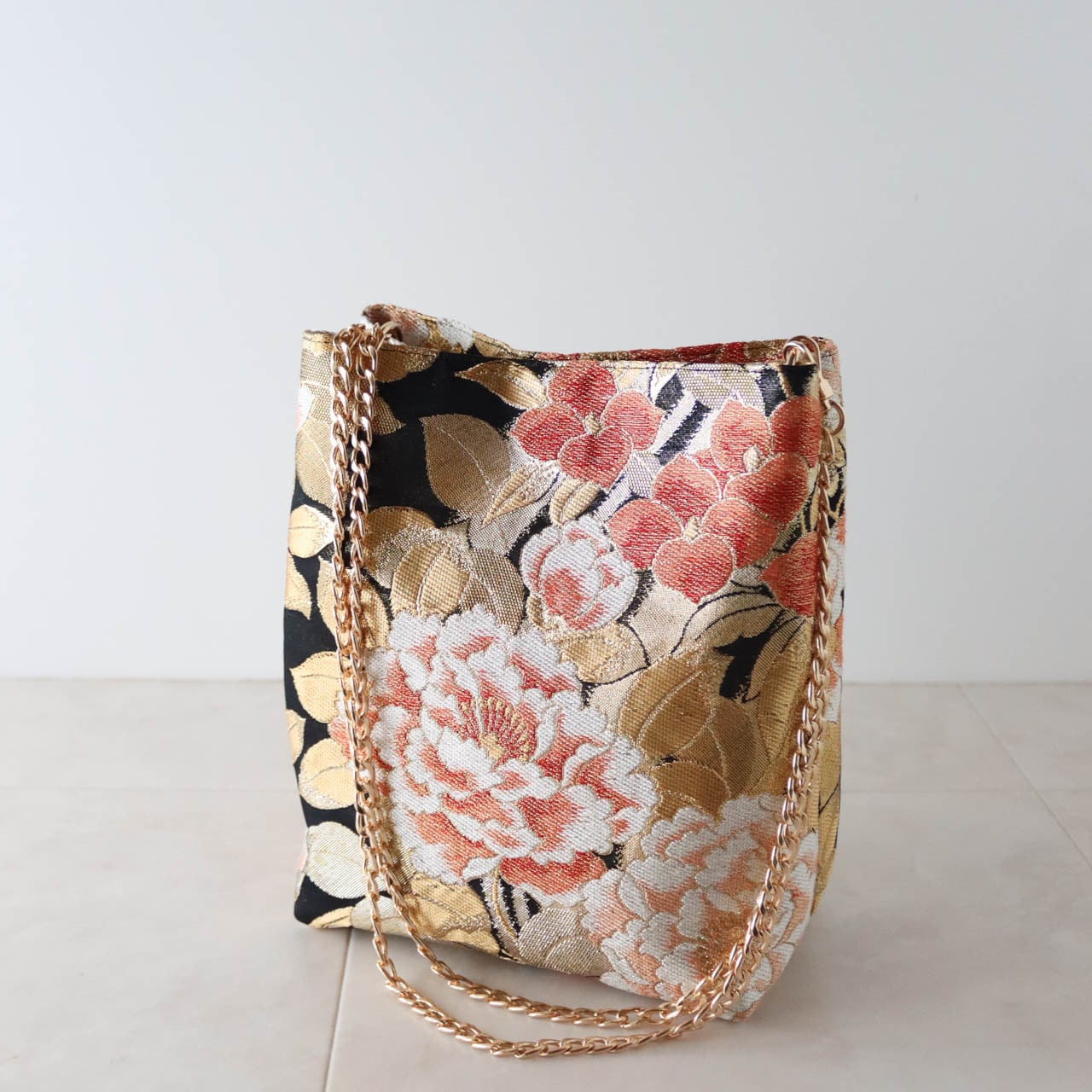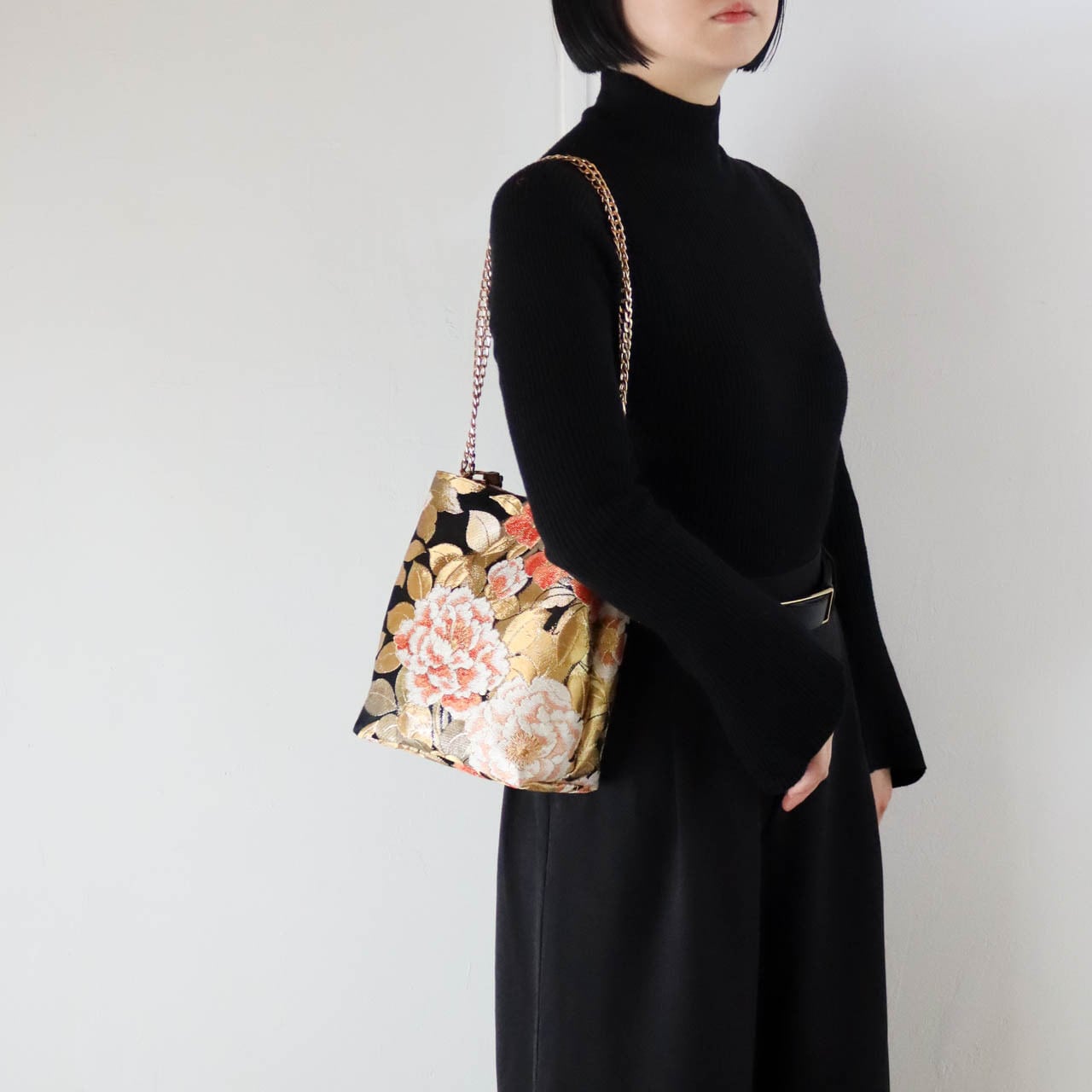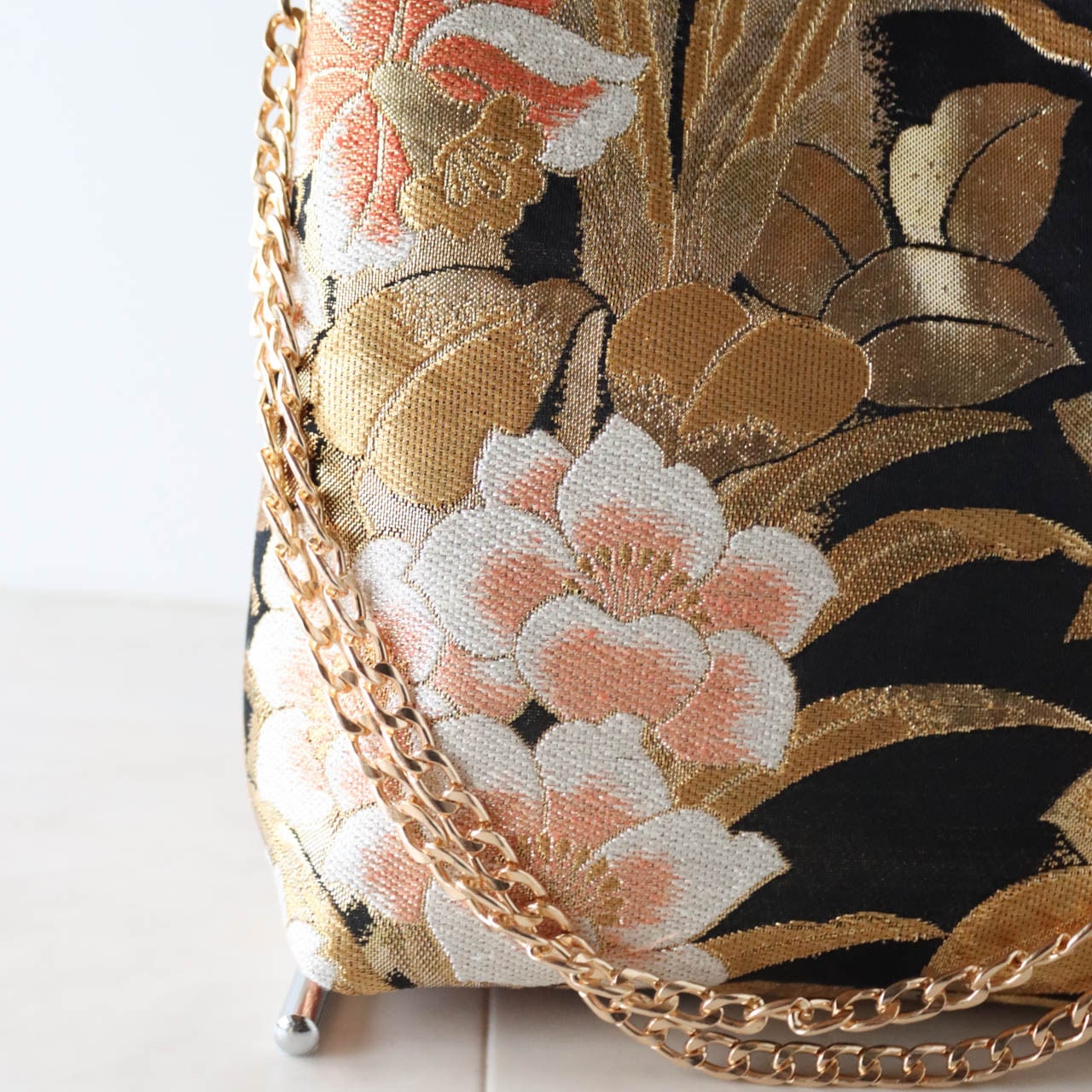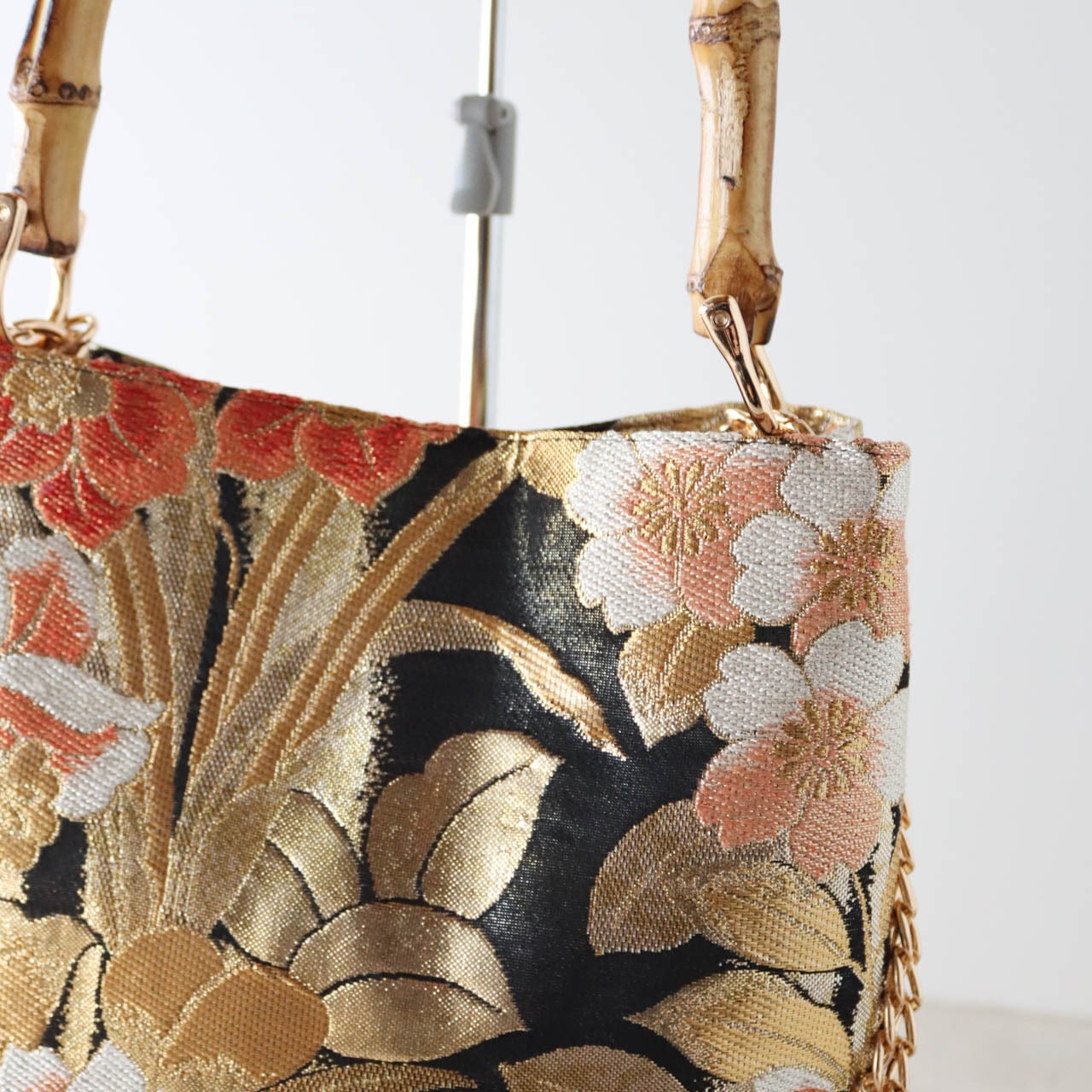 Bamboo Handle Bag 17/ブラックに四季花/ 帯リメイク