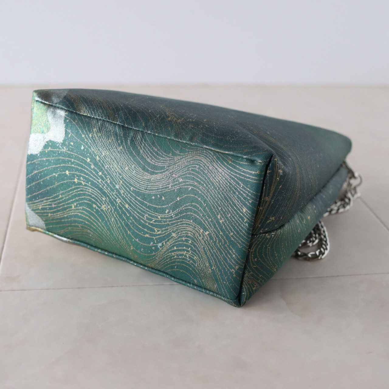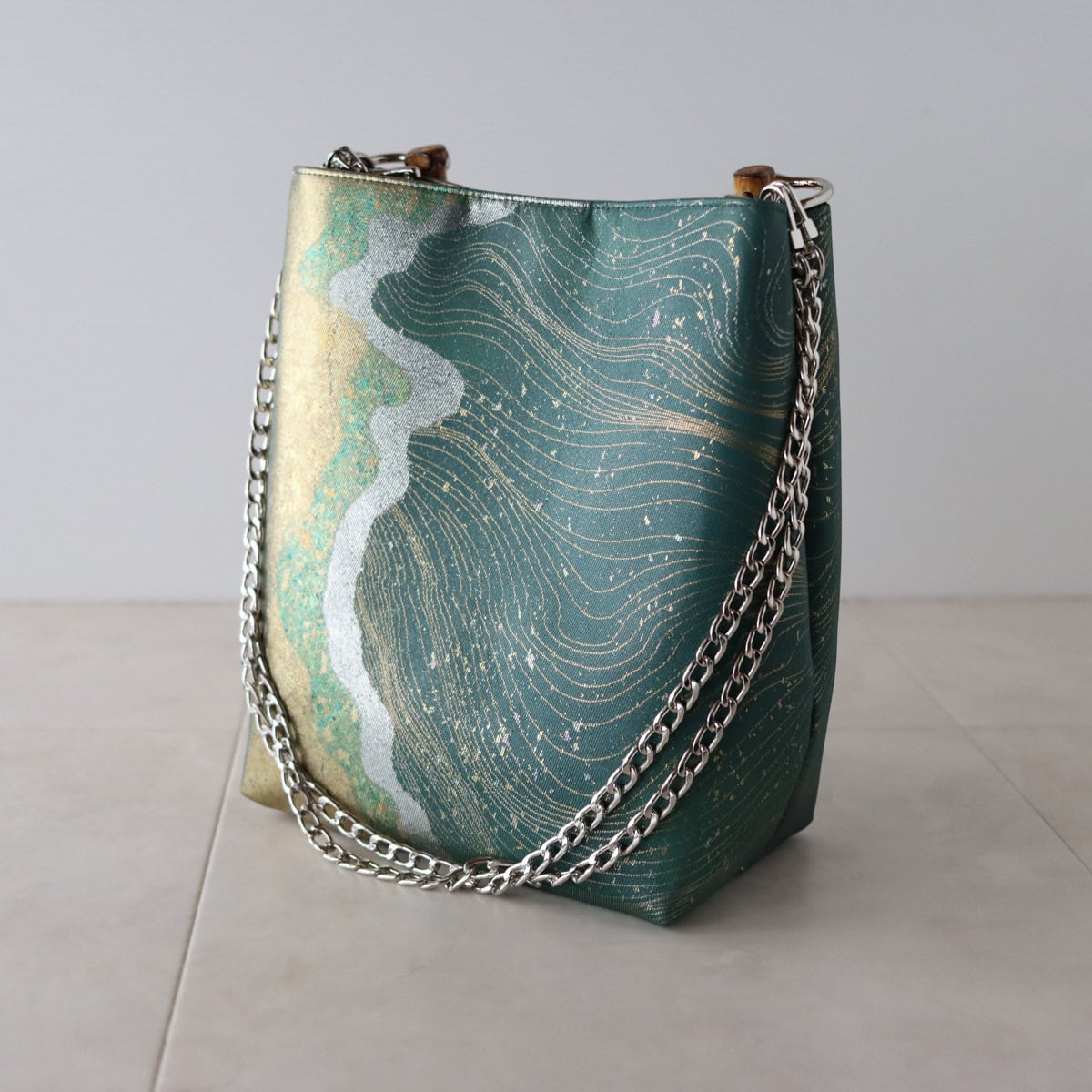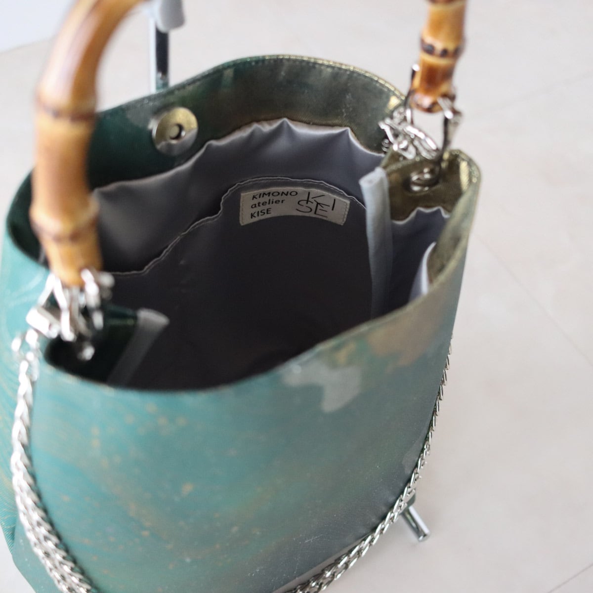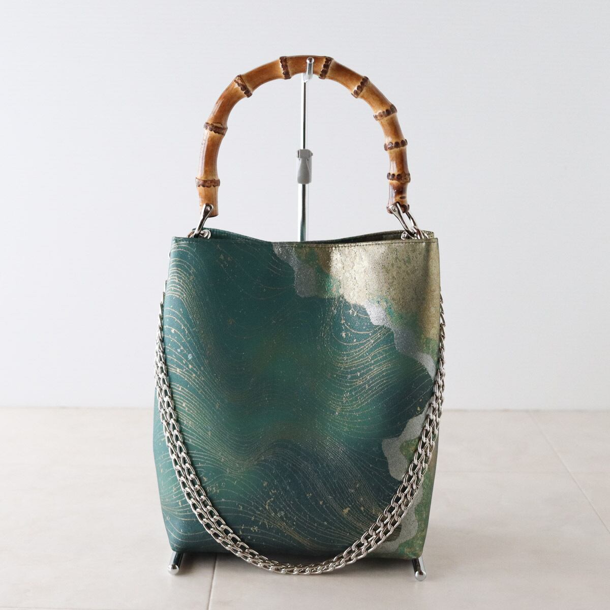 Bamboo Handle Bag 17/グリーンに流水道長/ 帯リメイクバッグ