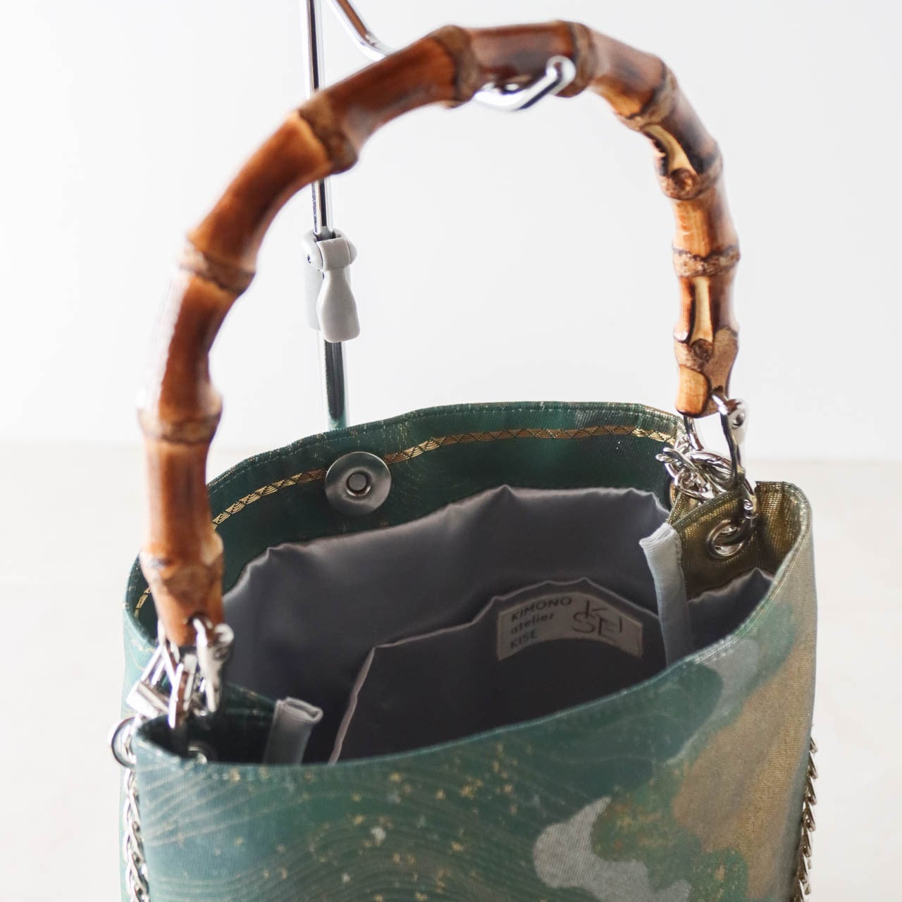 Remove the chain to create a bamboo bag that pairs perfectly with traditional Japanese clothing.