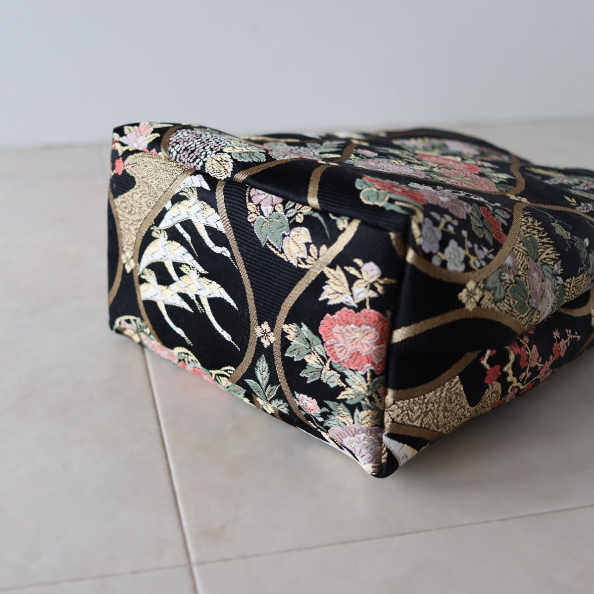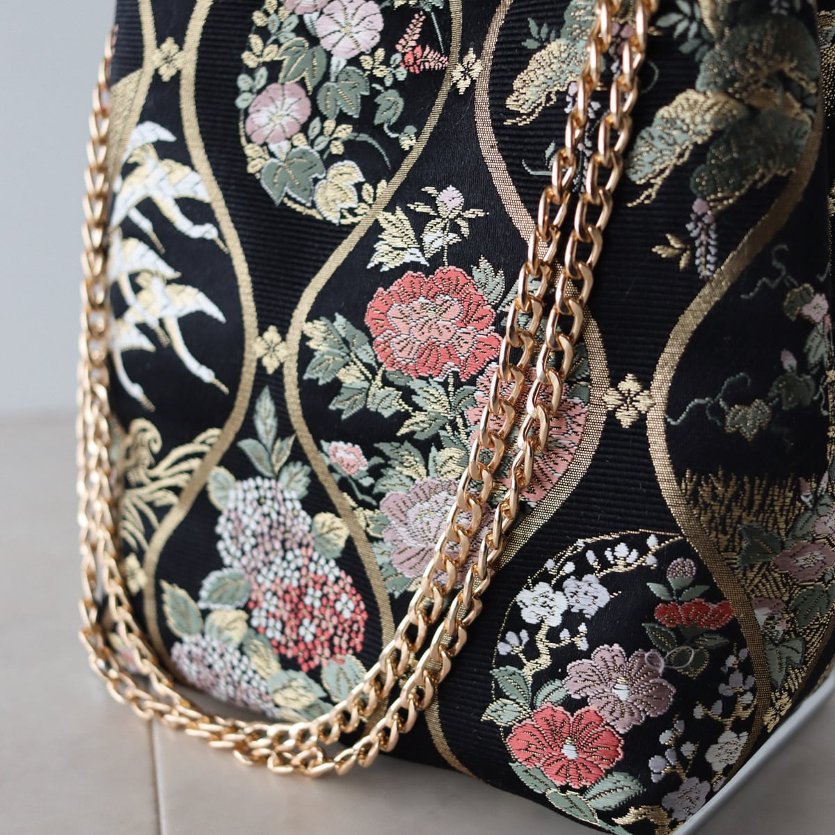 細かなで繊細な四季花の模様が、黒のかっこよさのなかに、華やかな可愛らしさを感じるバッグです