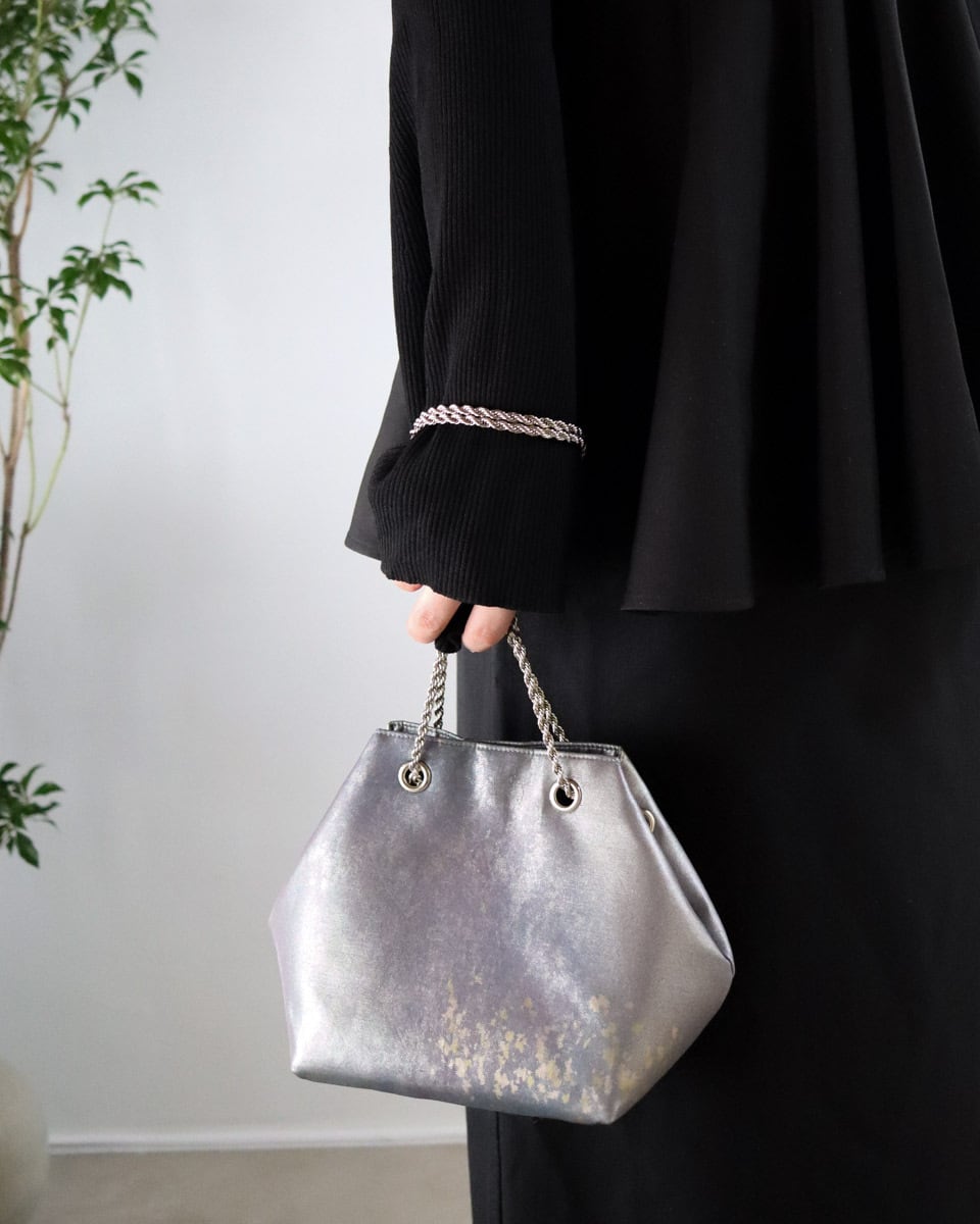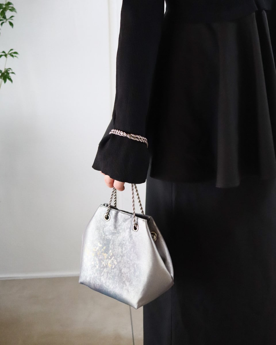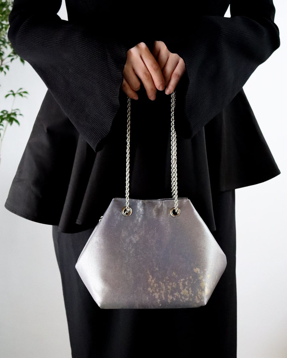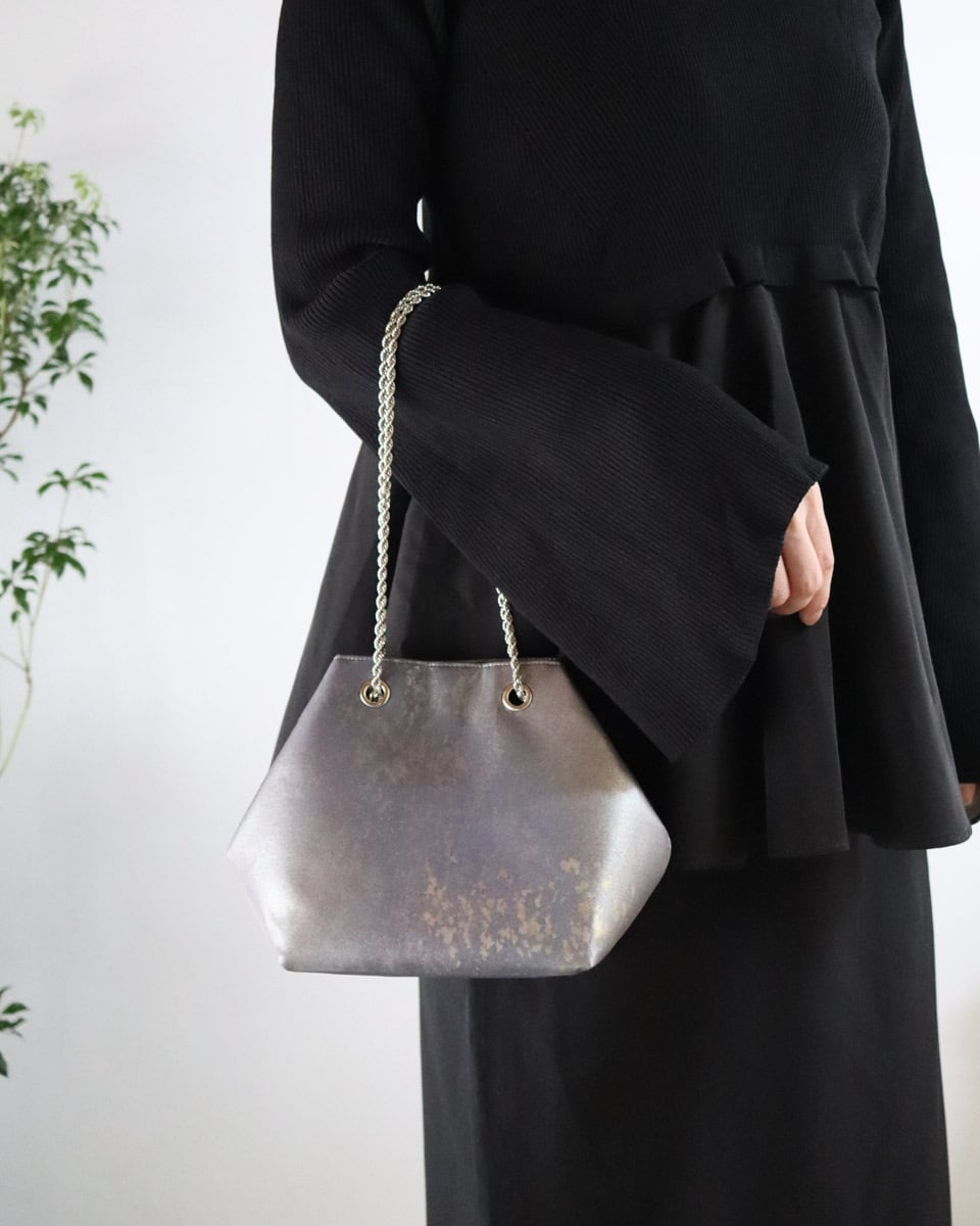 グラデーションのグレーパープル地に細かな金が散らされたシックな印象のバッグです