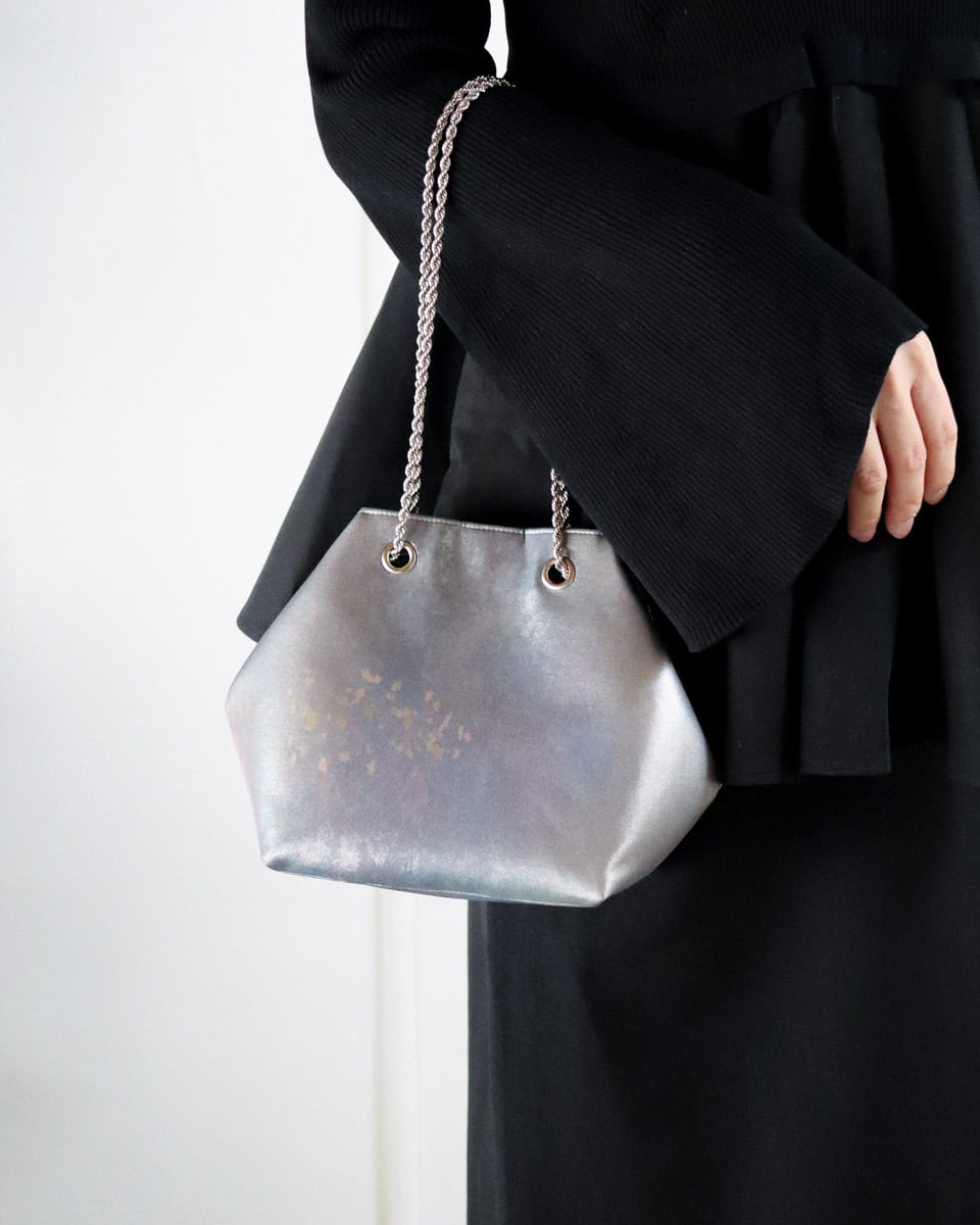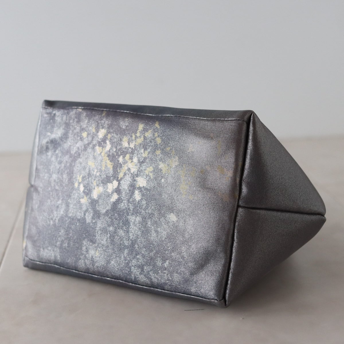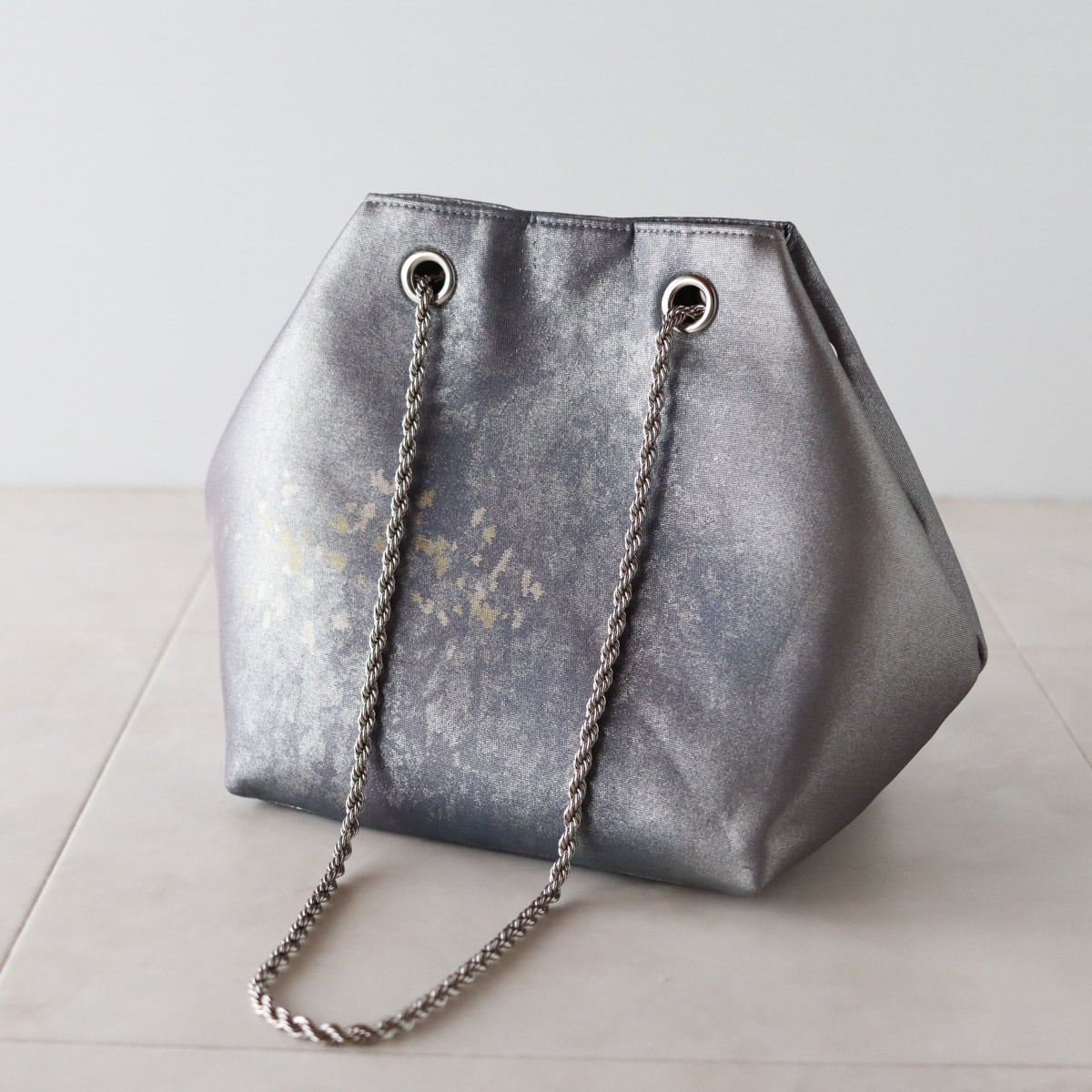 グラデーションのグレーパープル地に細かな金が散らされたシックな印象のバッグです