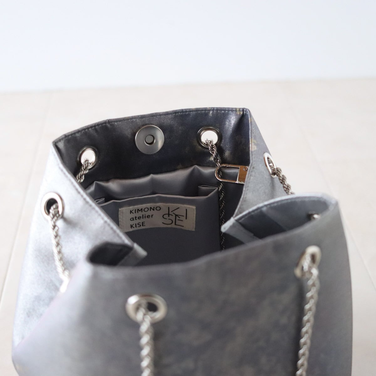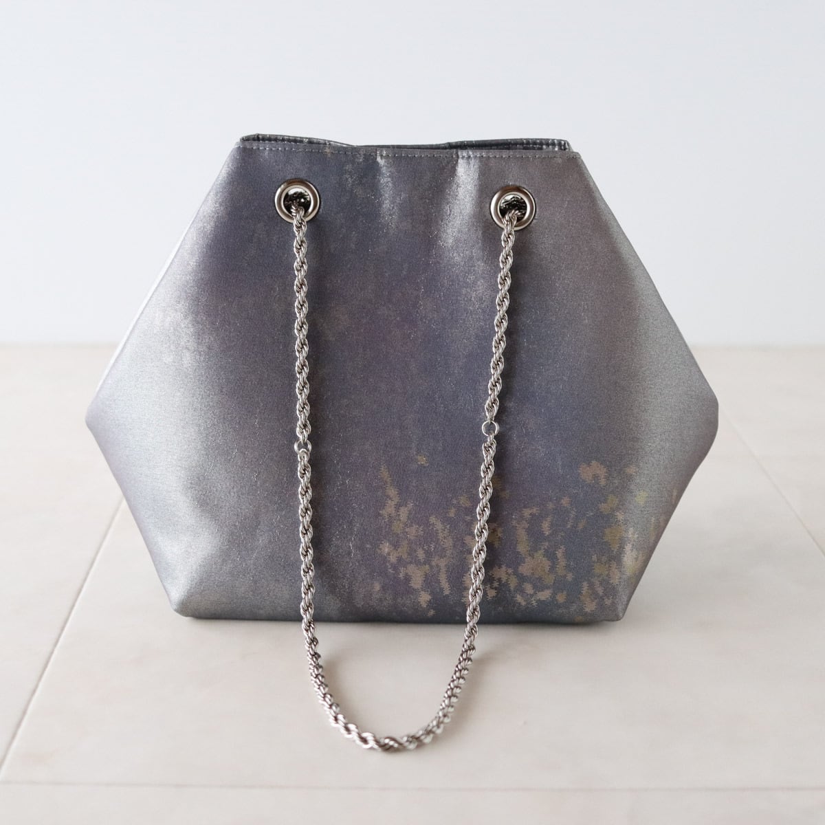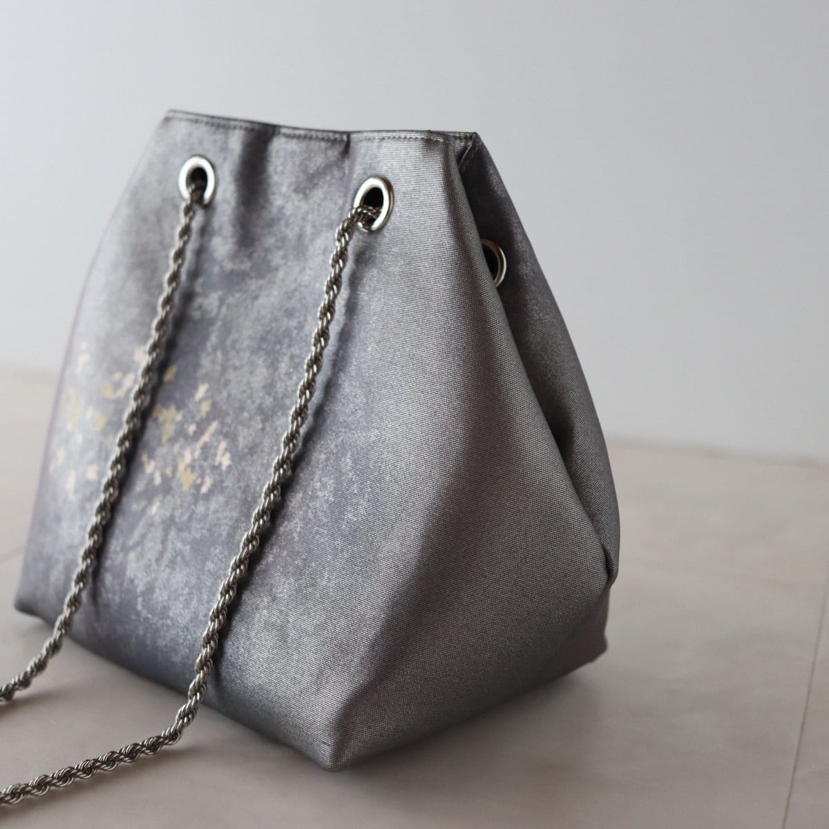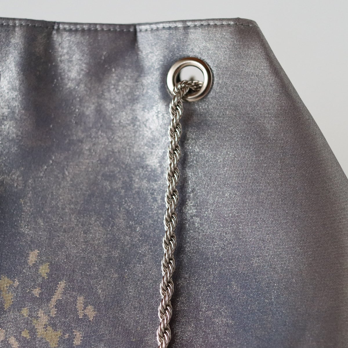 グラデーションのグレーパープル地に細かな金が散らされたシックな印象のバッグです