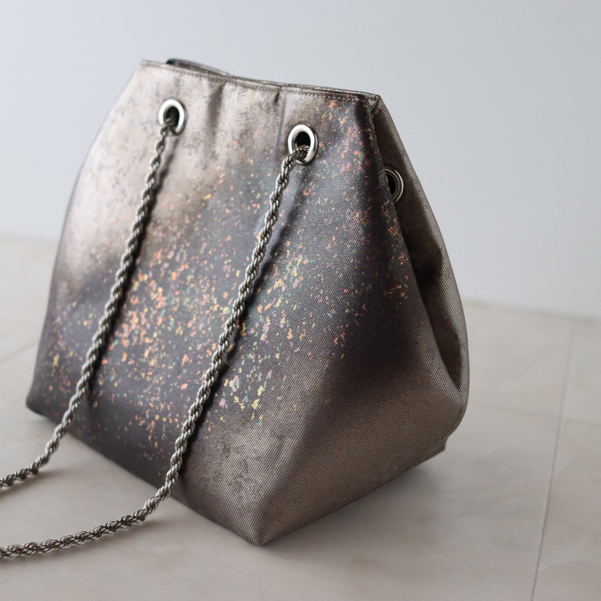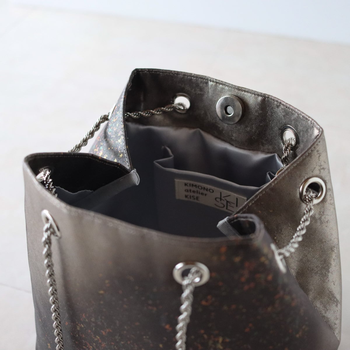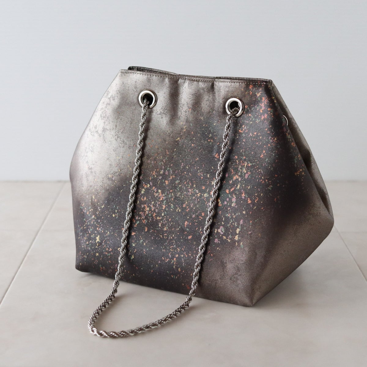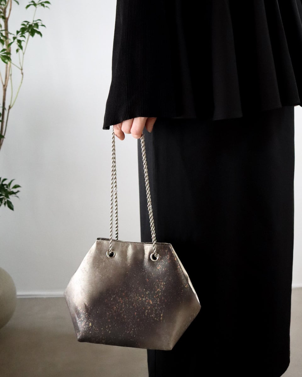細かな箔が散りばめられたかっこいいデザインの中に可憐な華やかさも感じるバッグです