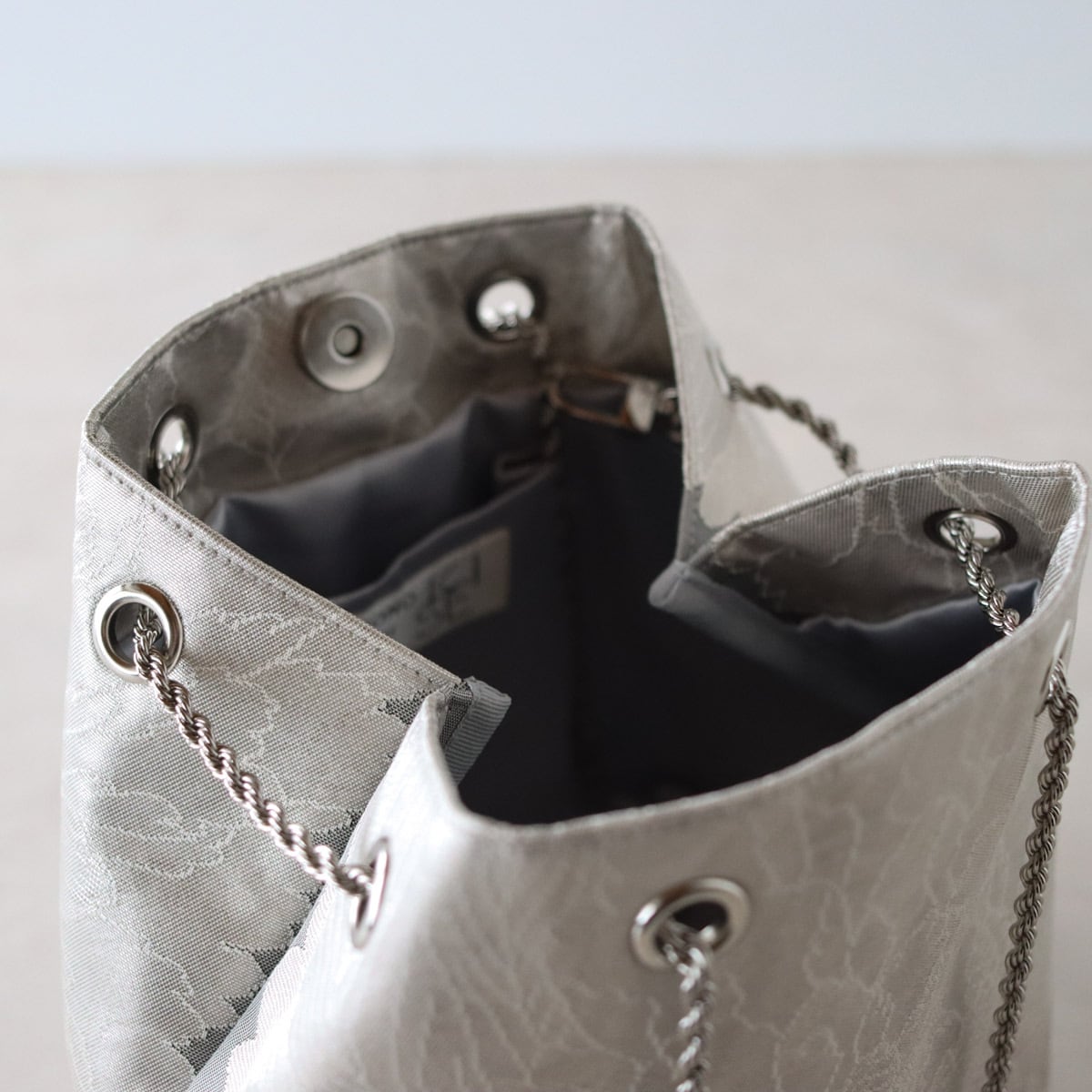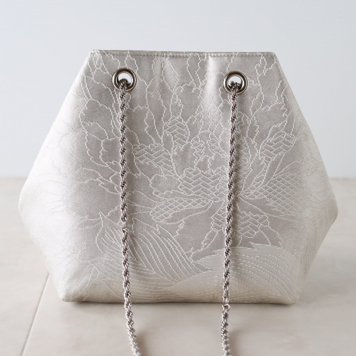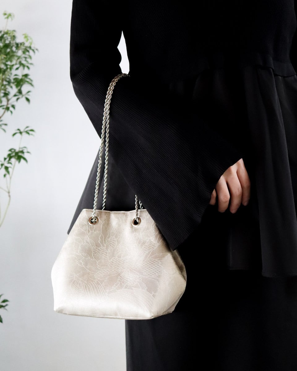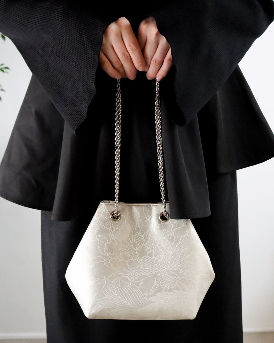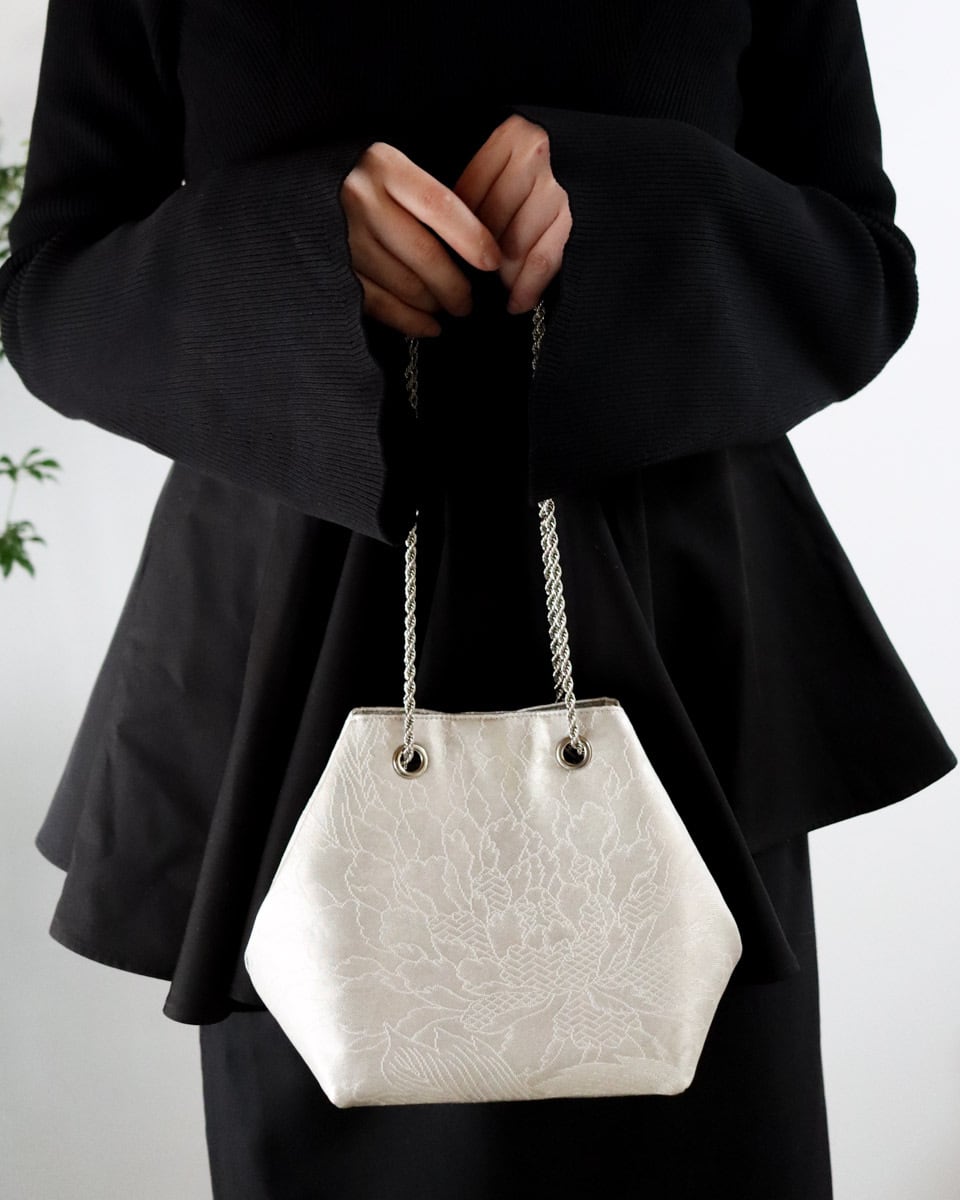 ホワイトシルバー地に細く繊細に描かれた大きな牡丹が上品なバッグです