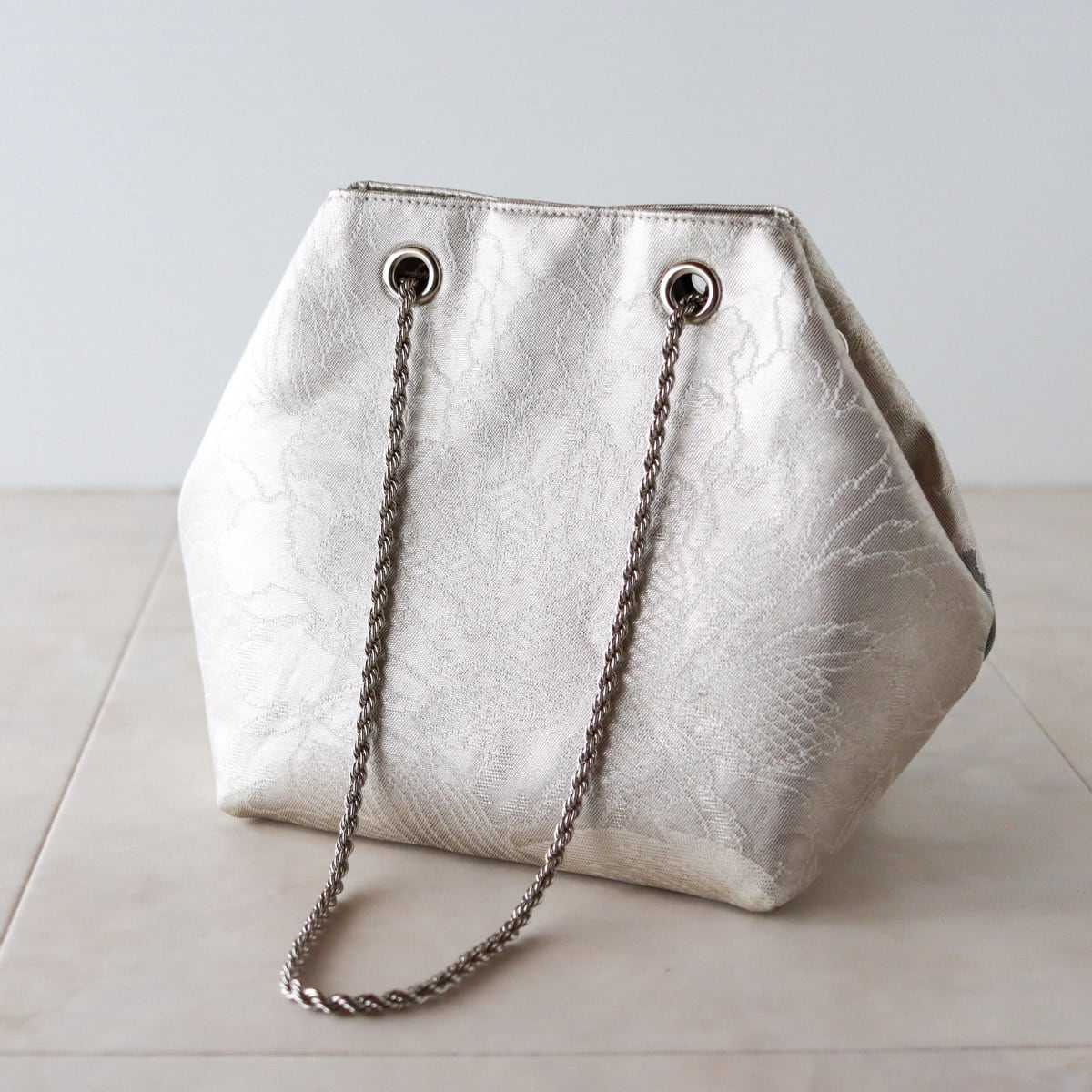 Obi Drawstring Bag Cube /ホワイトシルバーに大牡丹/帯リメイクバッグ