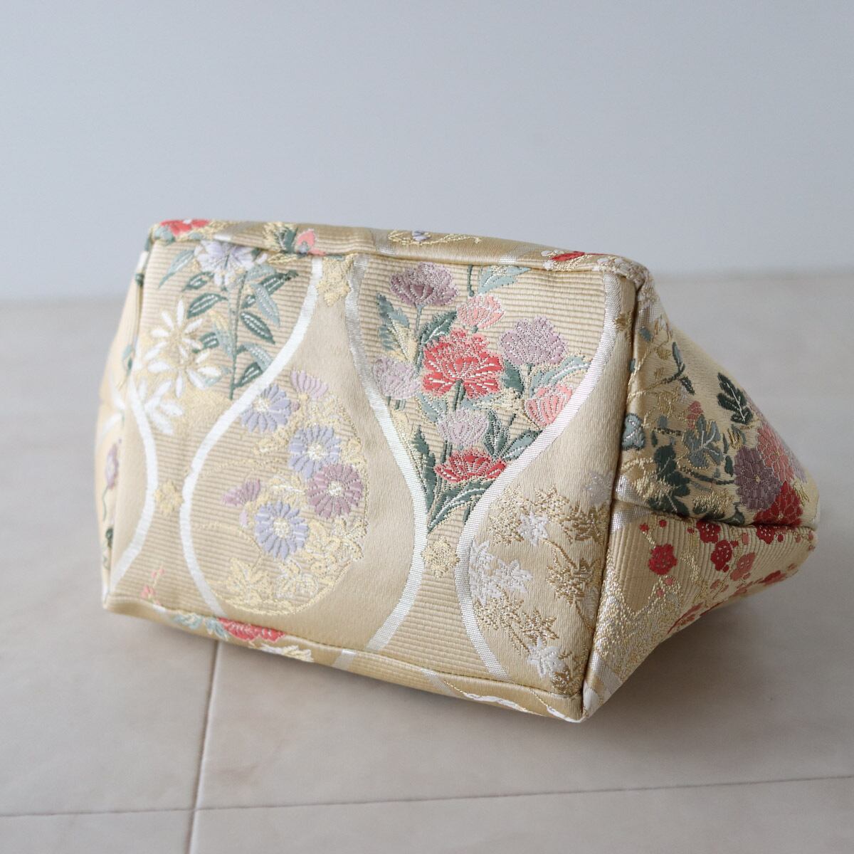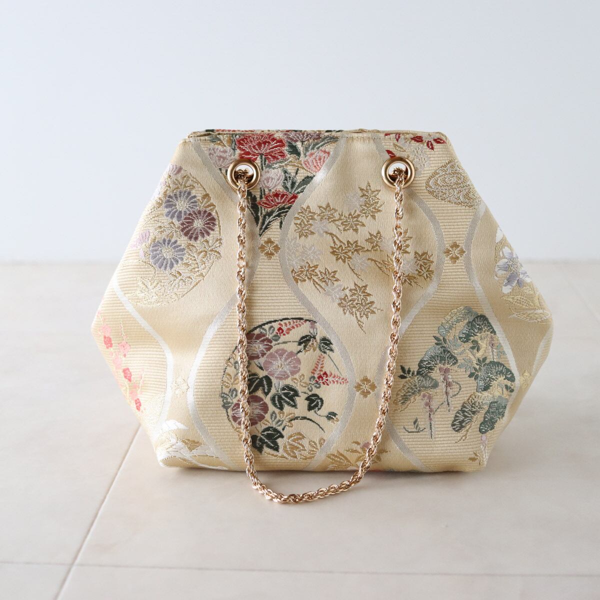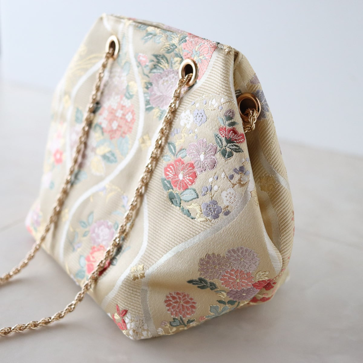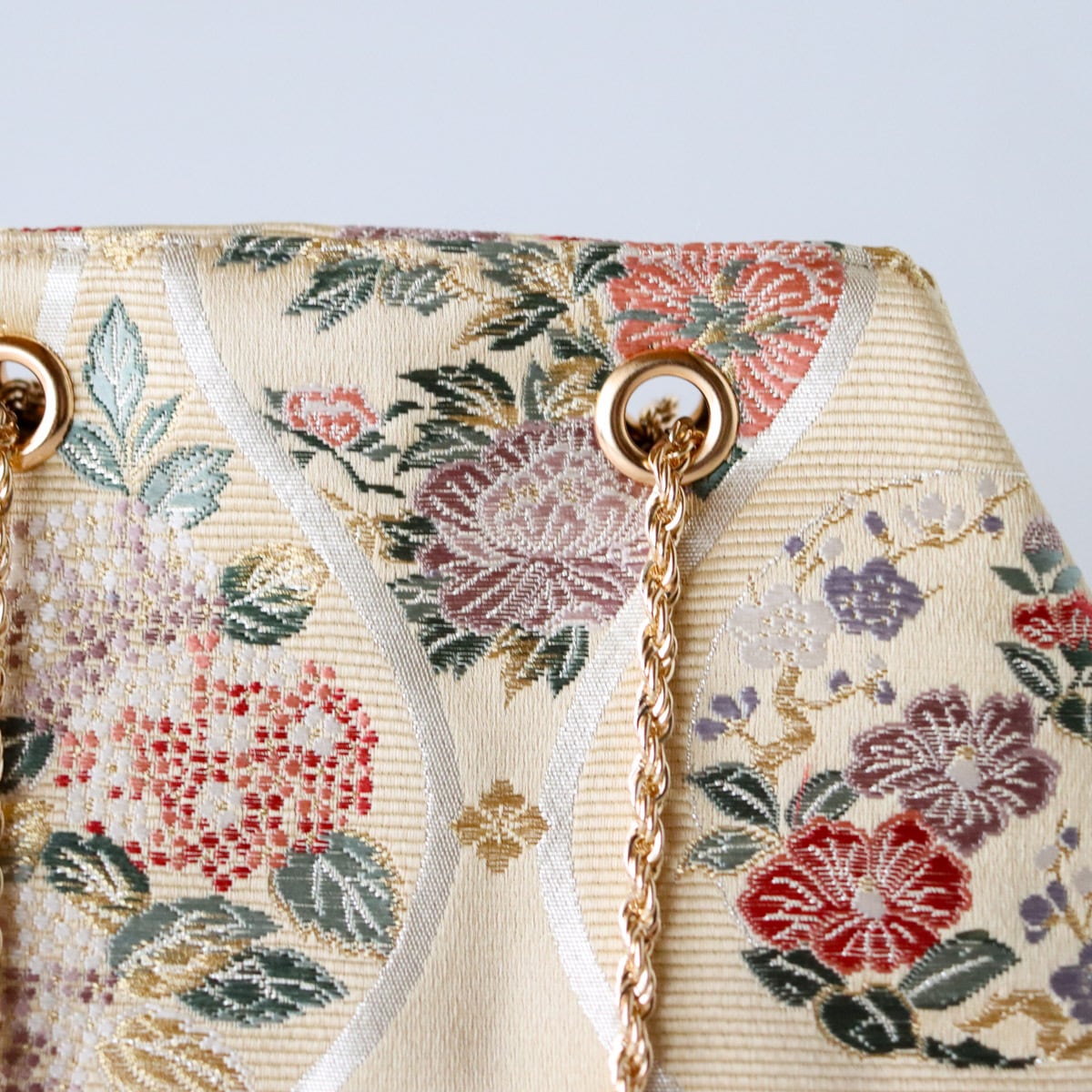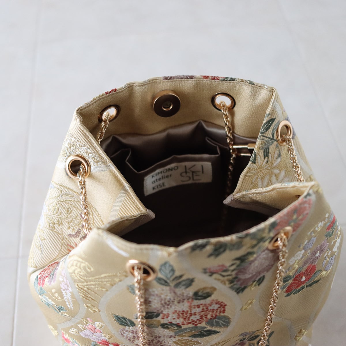 Obi Drawstring Bag Cube /ベージュ地に立涌に四季花/帯リメイクバッグ