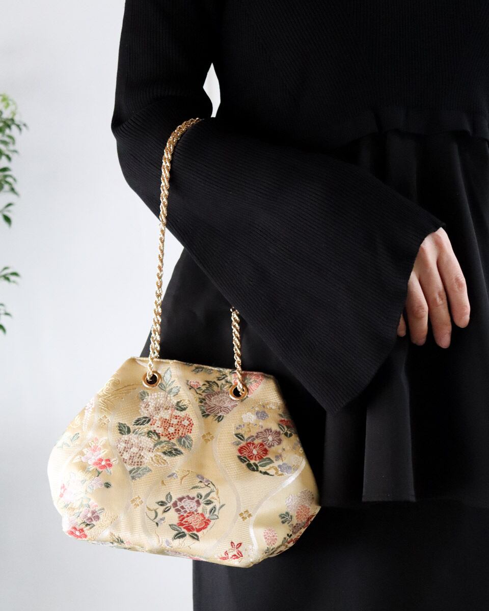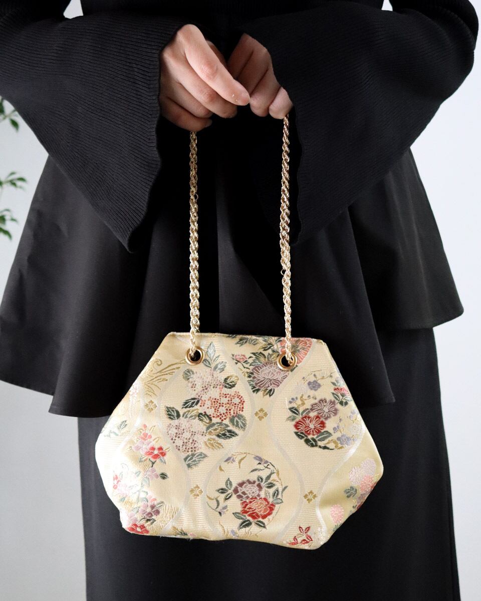 細かなで繊細な四季花の模様が華やかで可愛らしさを感じるバッグです