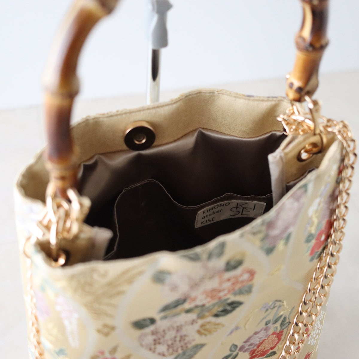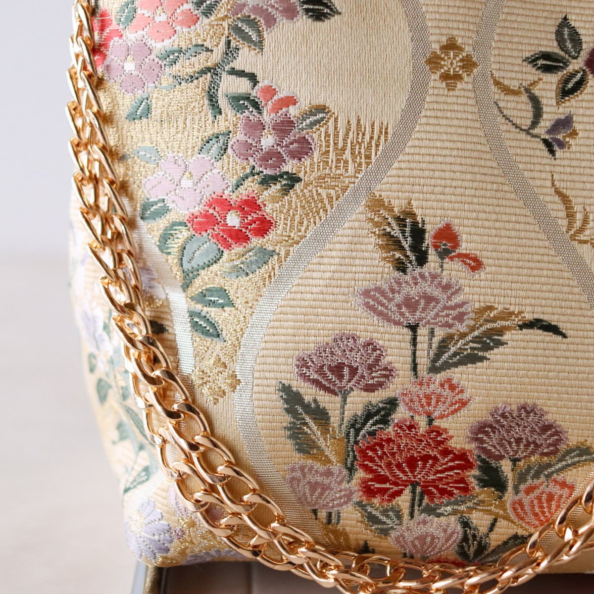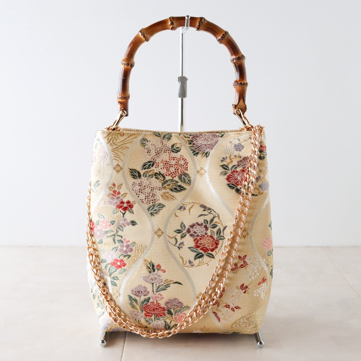 Bamboo Handle Bag 17/ベージュ地に立涌に四季花/帯リメイクバッグ