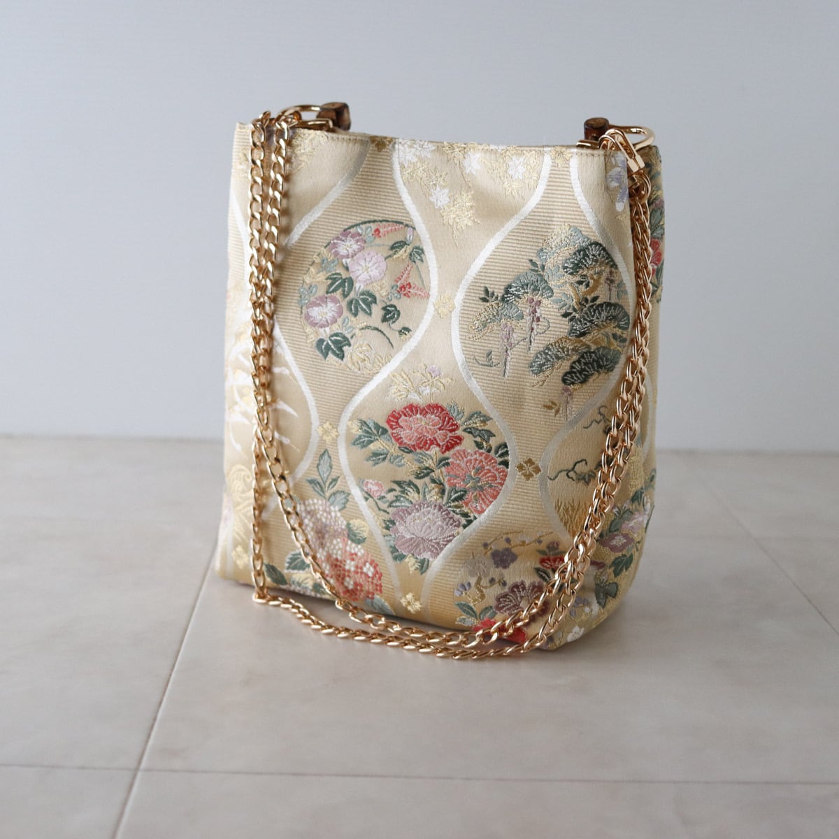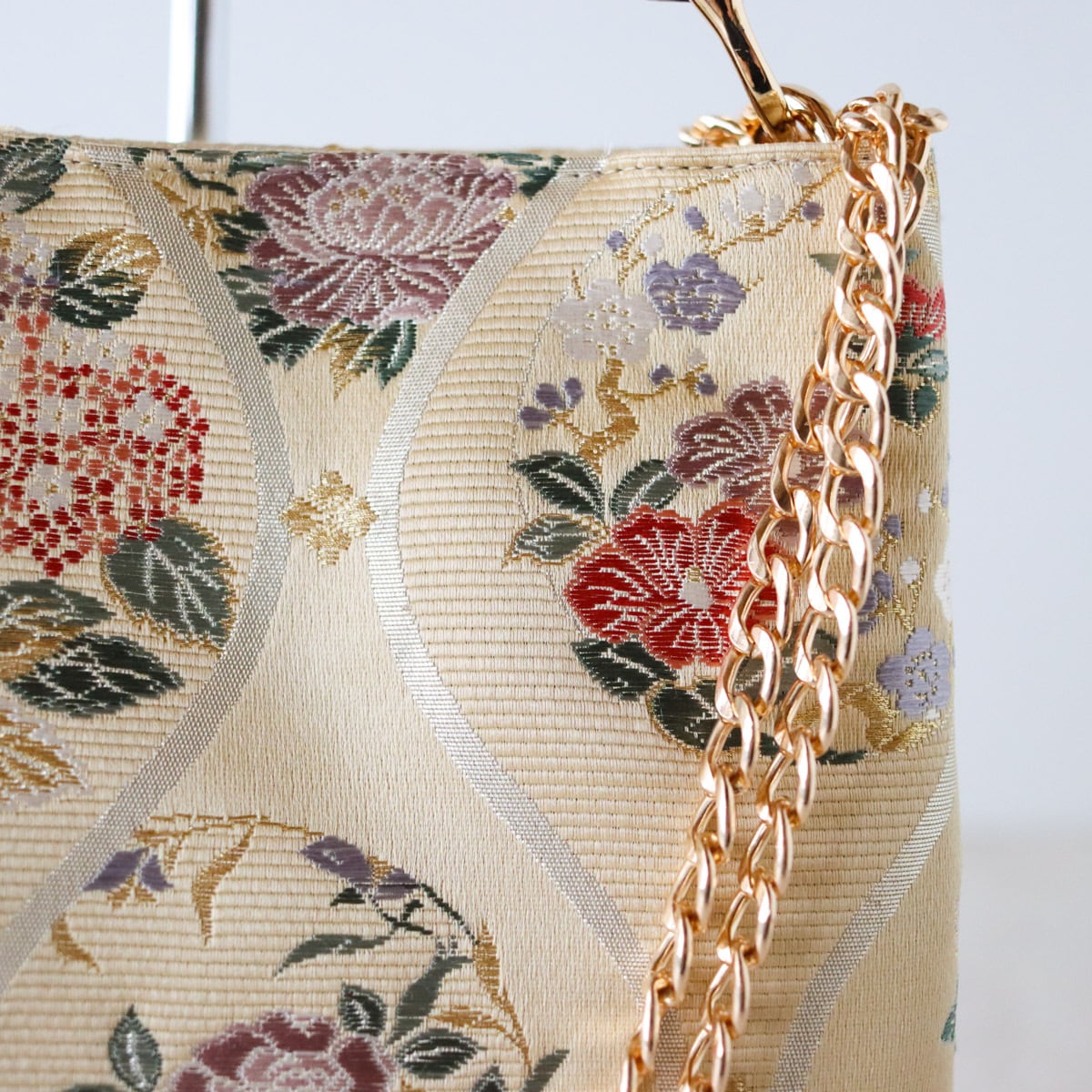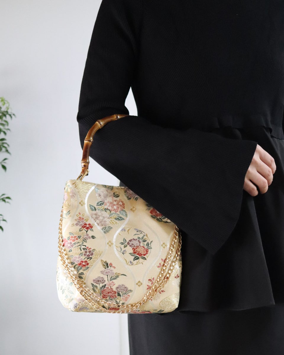 Bamboo Handle Bag 17/ベージュ地に立涌に四季花/帯リメイクバッグ