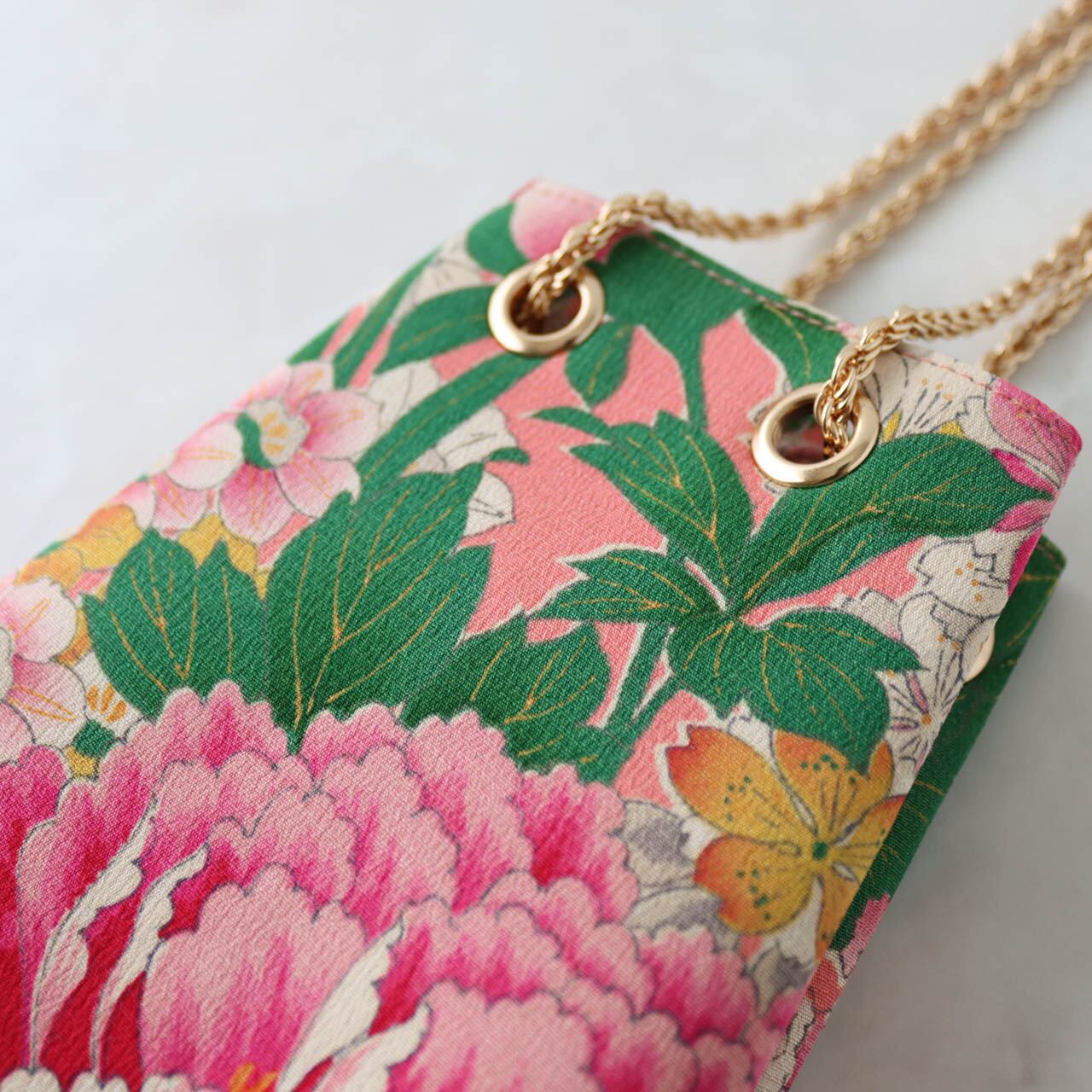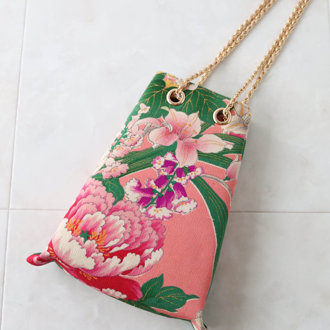 Mini Kimono Drawstring Bag / 桃色に洋花/flowers on pink