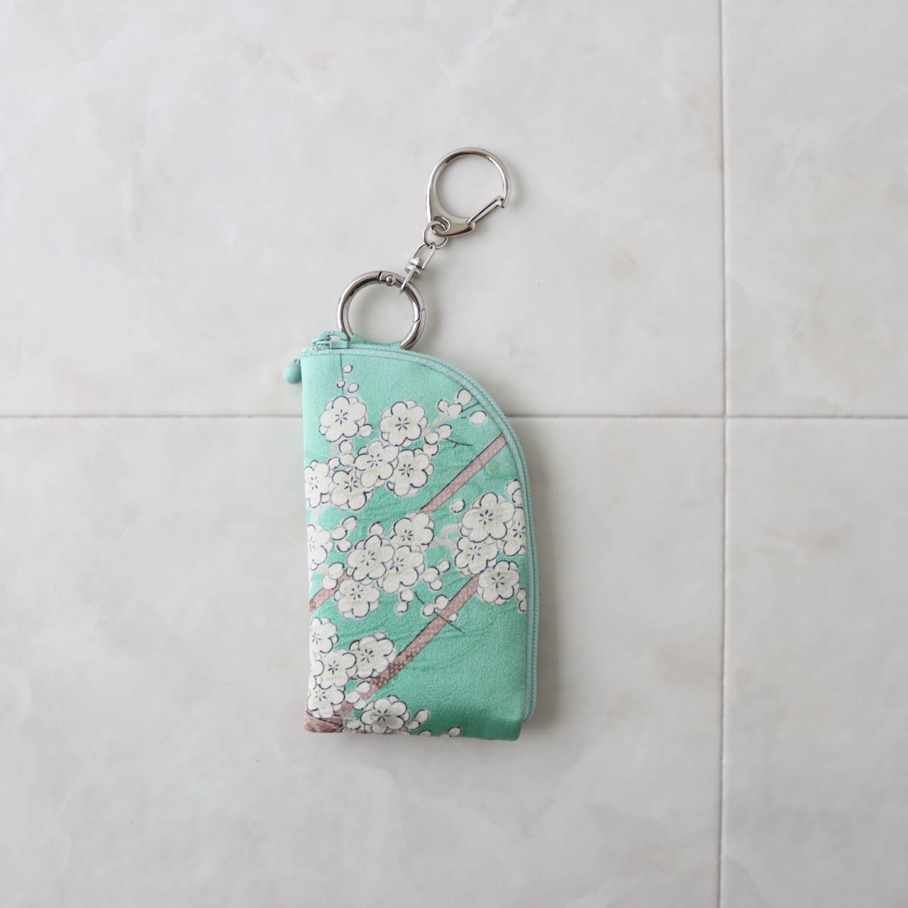 Fan Shaped Pouch/ 白緑に四季花/Flowers on a mint green