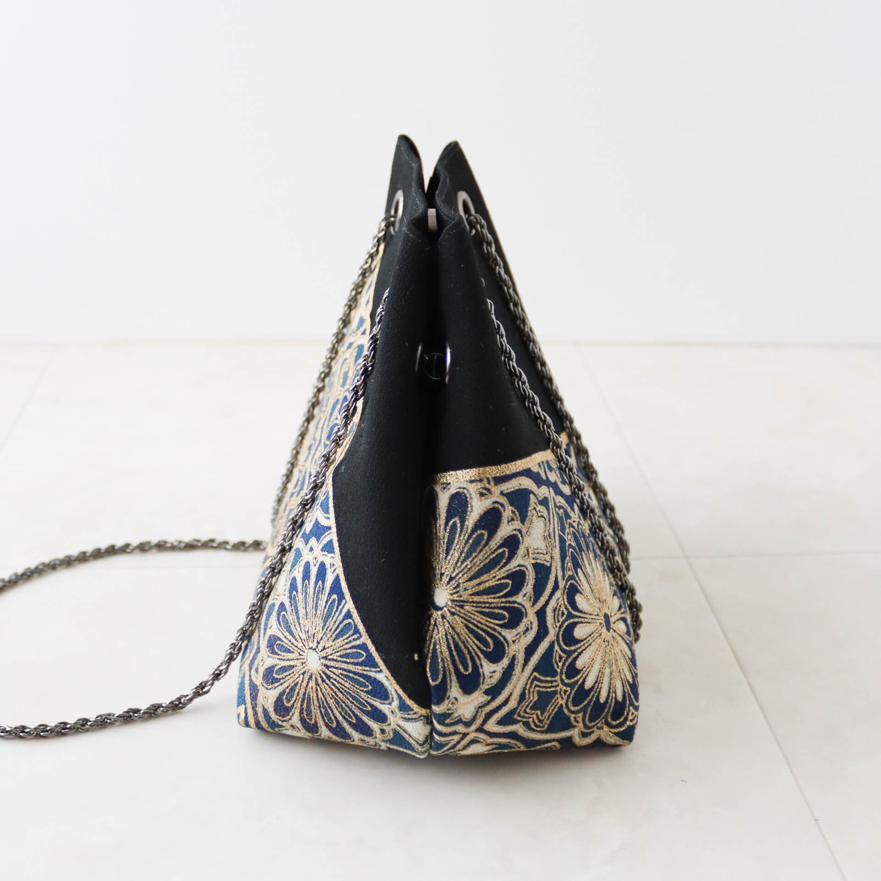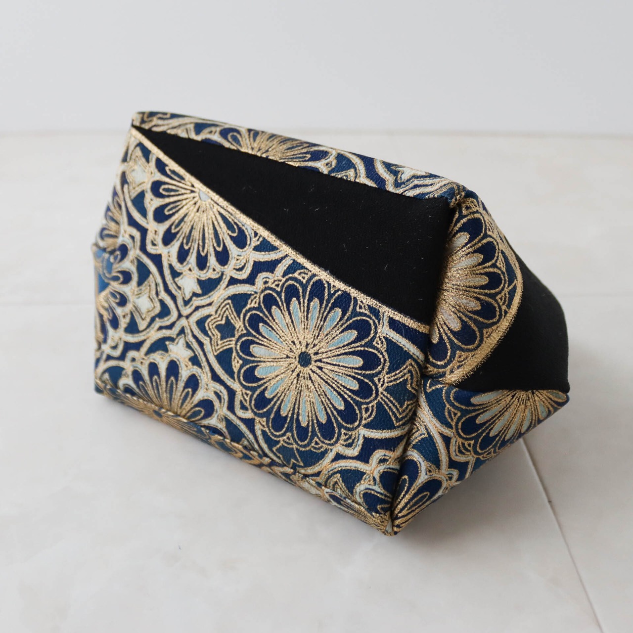 Kimono Drawstring Bag Cube /群青に金彩花/Deep blue with golden flower pattern