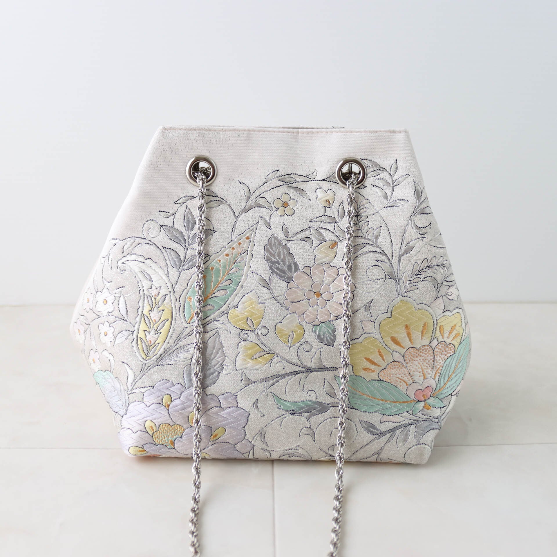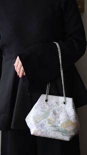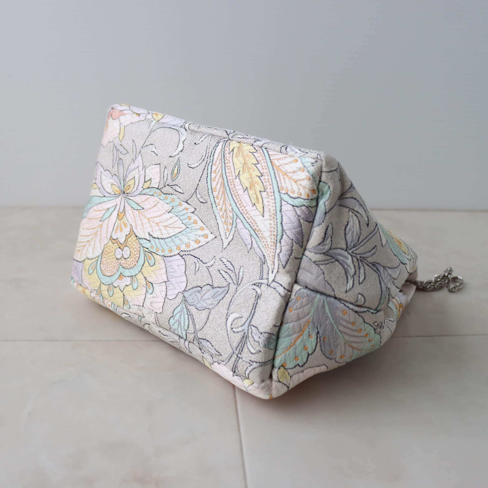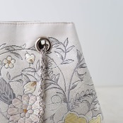 Obi Drawstring Bag Cube /シルバー花唐草模様/Silver flower arabesque pattern