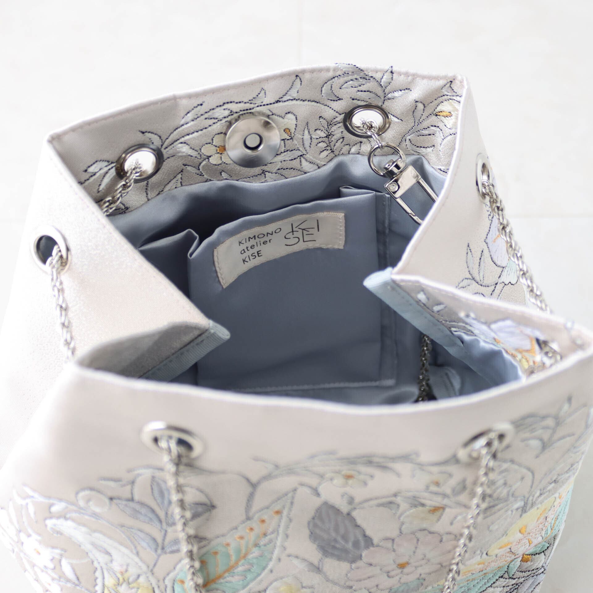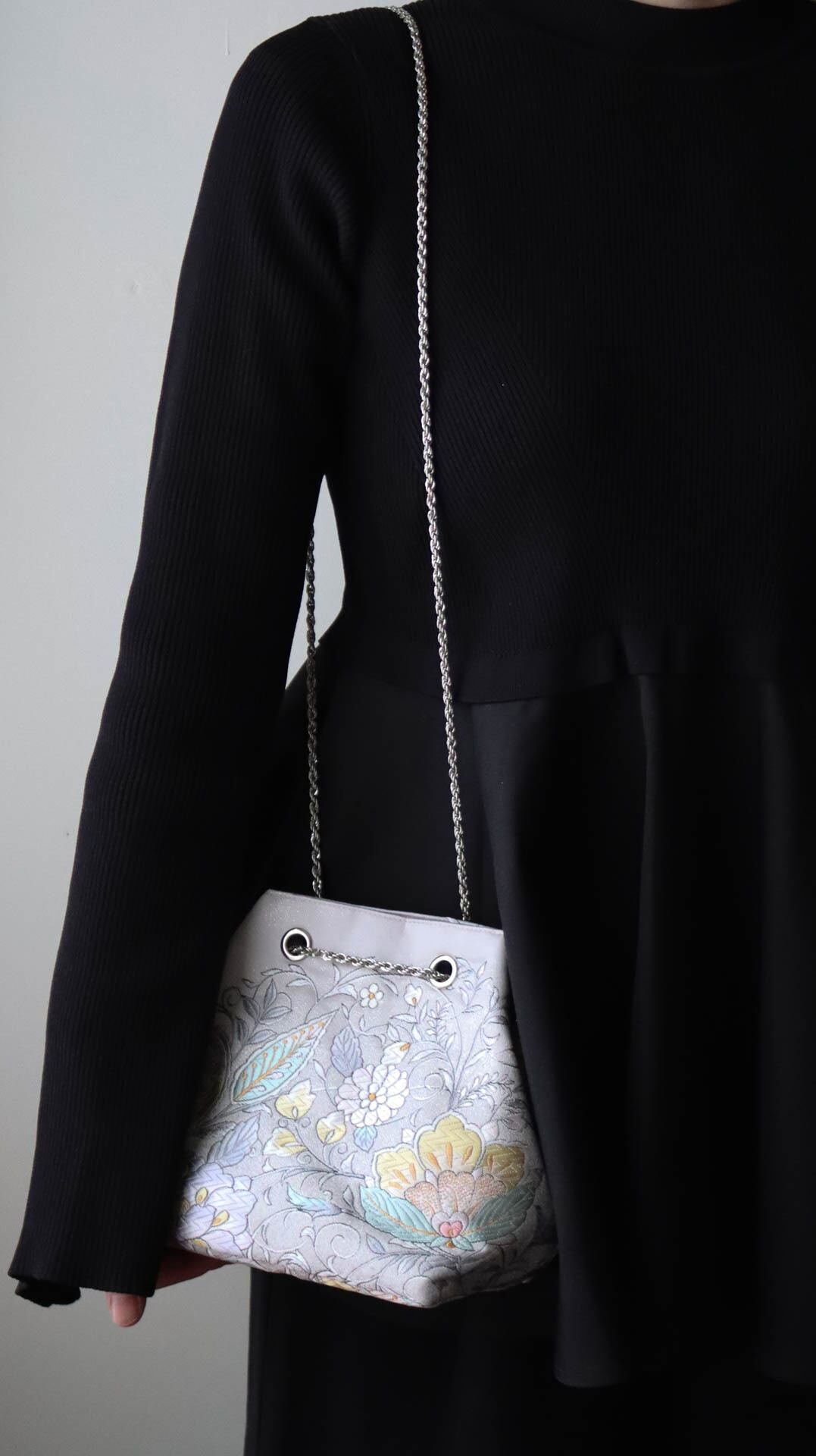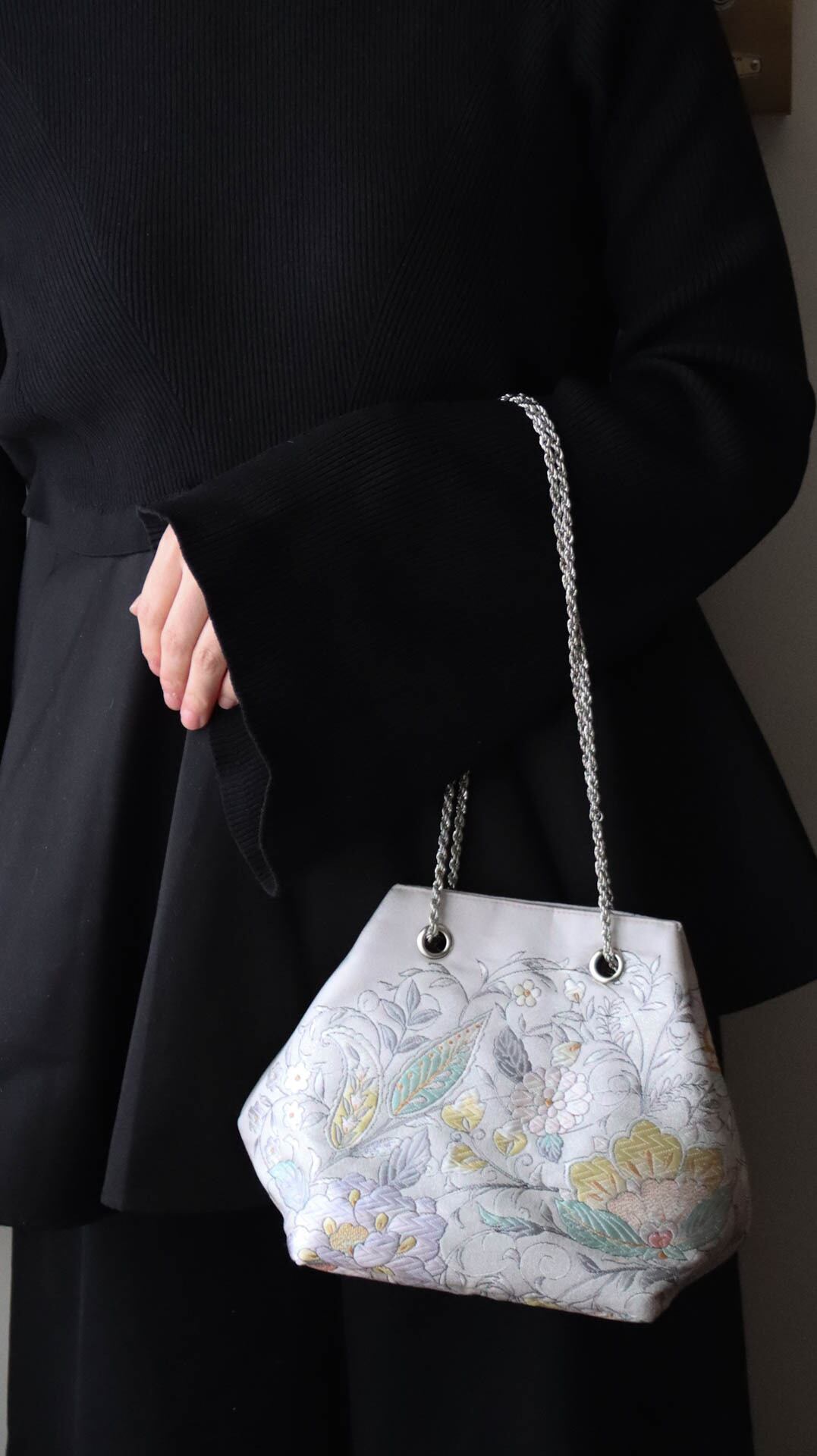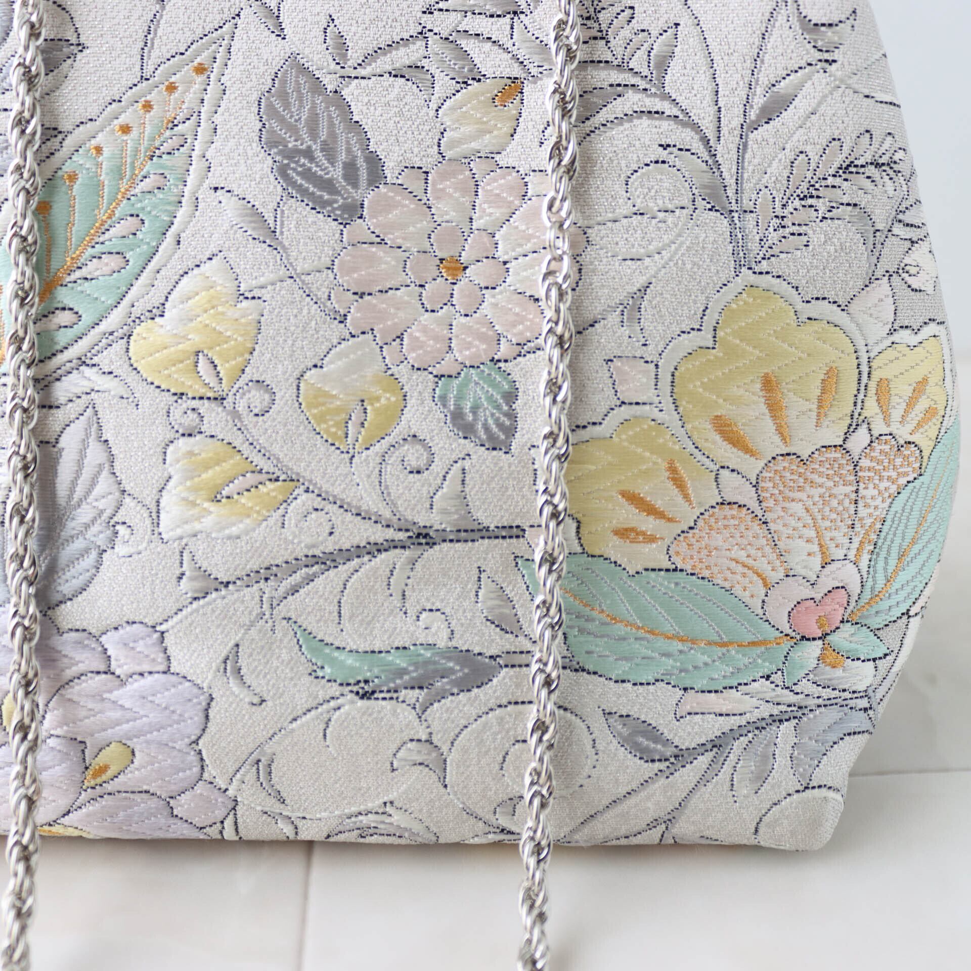 美しいシルバーカラーにエレガントな花唐草模様が施された上品な印象のバッグです。