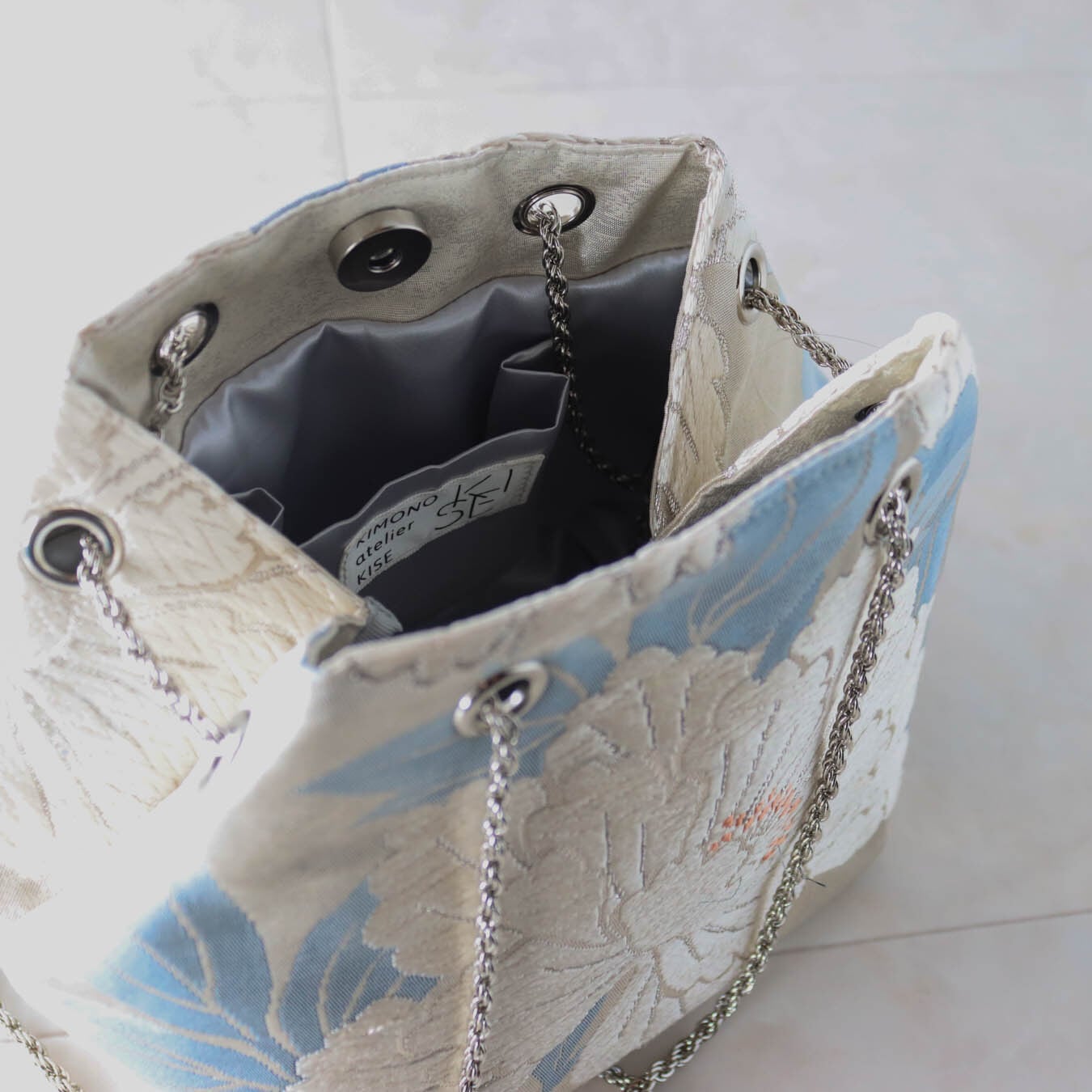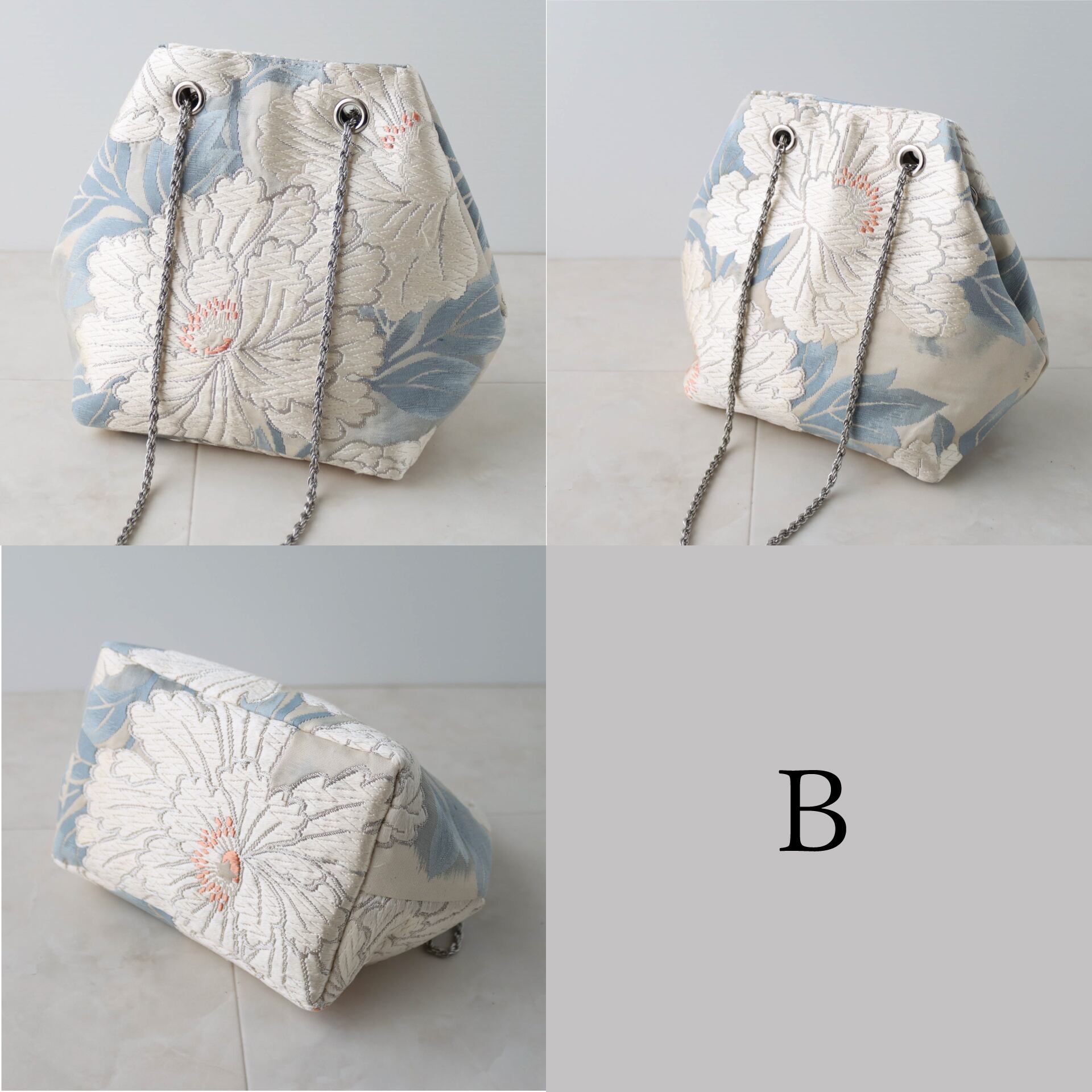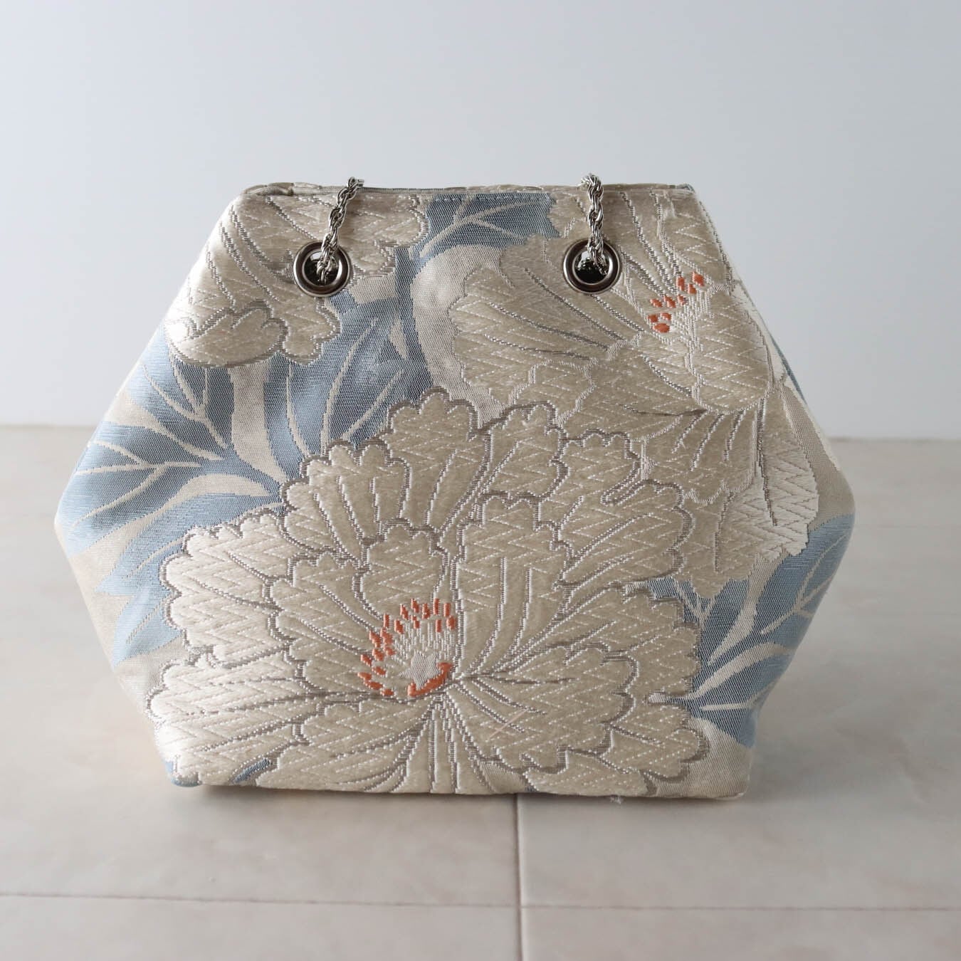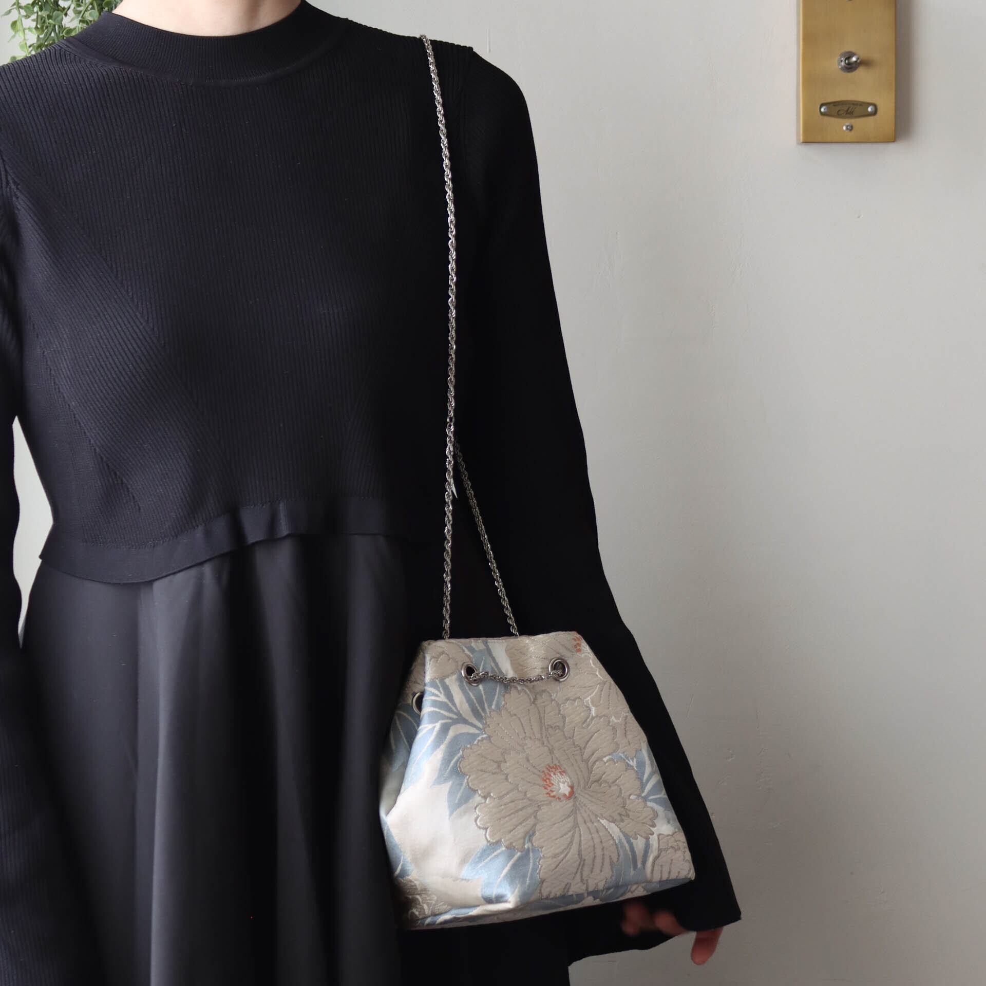 Obi Drawstring Bag Cube /白銀牡丹(唐織)/white peony embroidery
