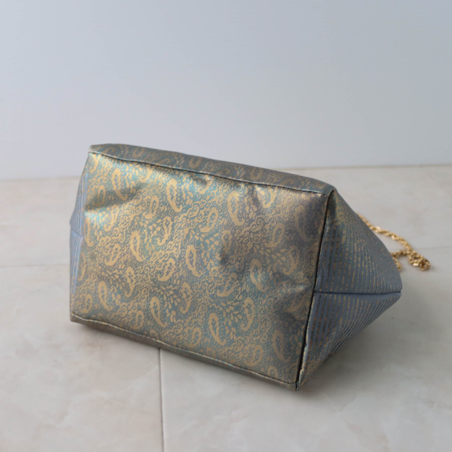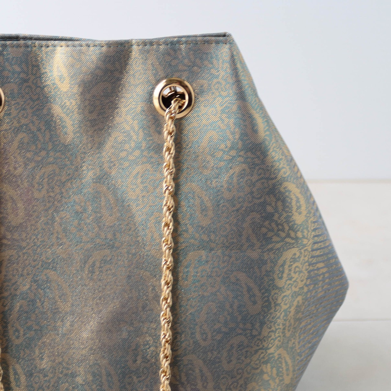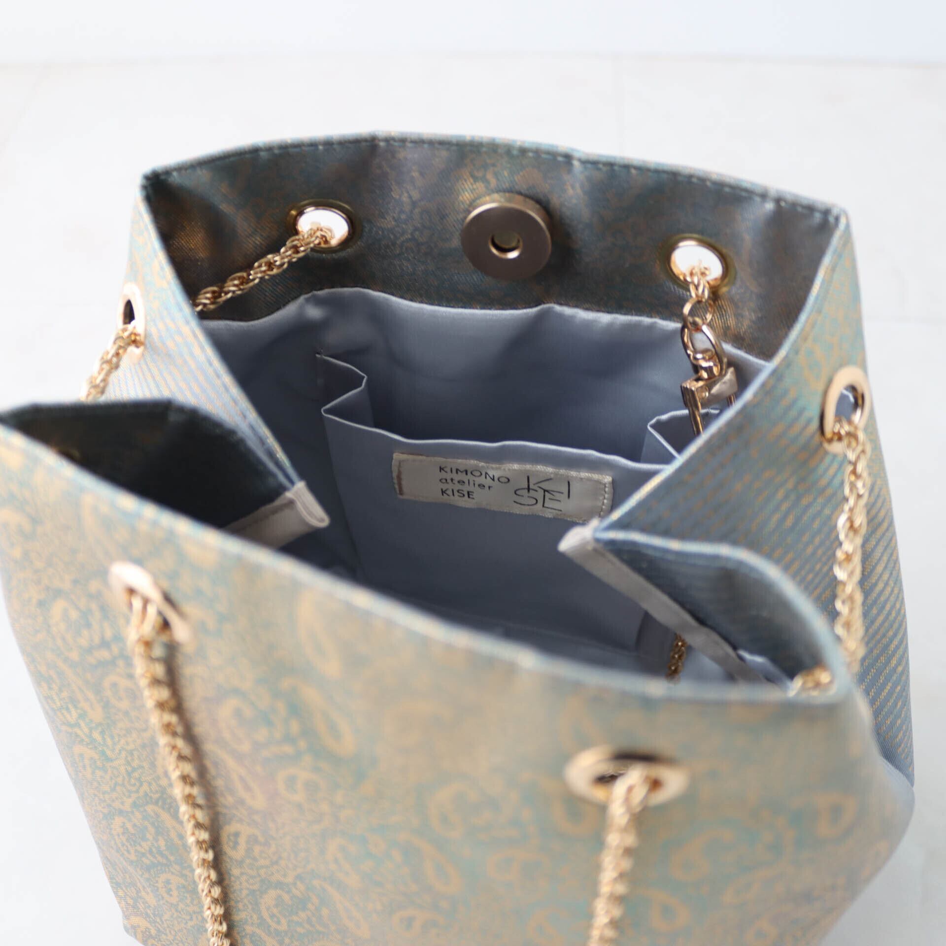 Obi Drawstring Bag Cube /ペイズリー引箔/ paisley blue gray gold