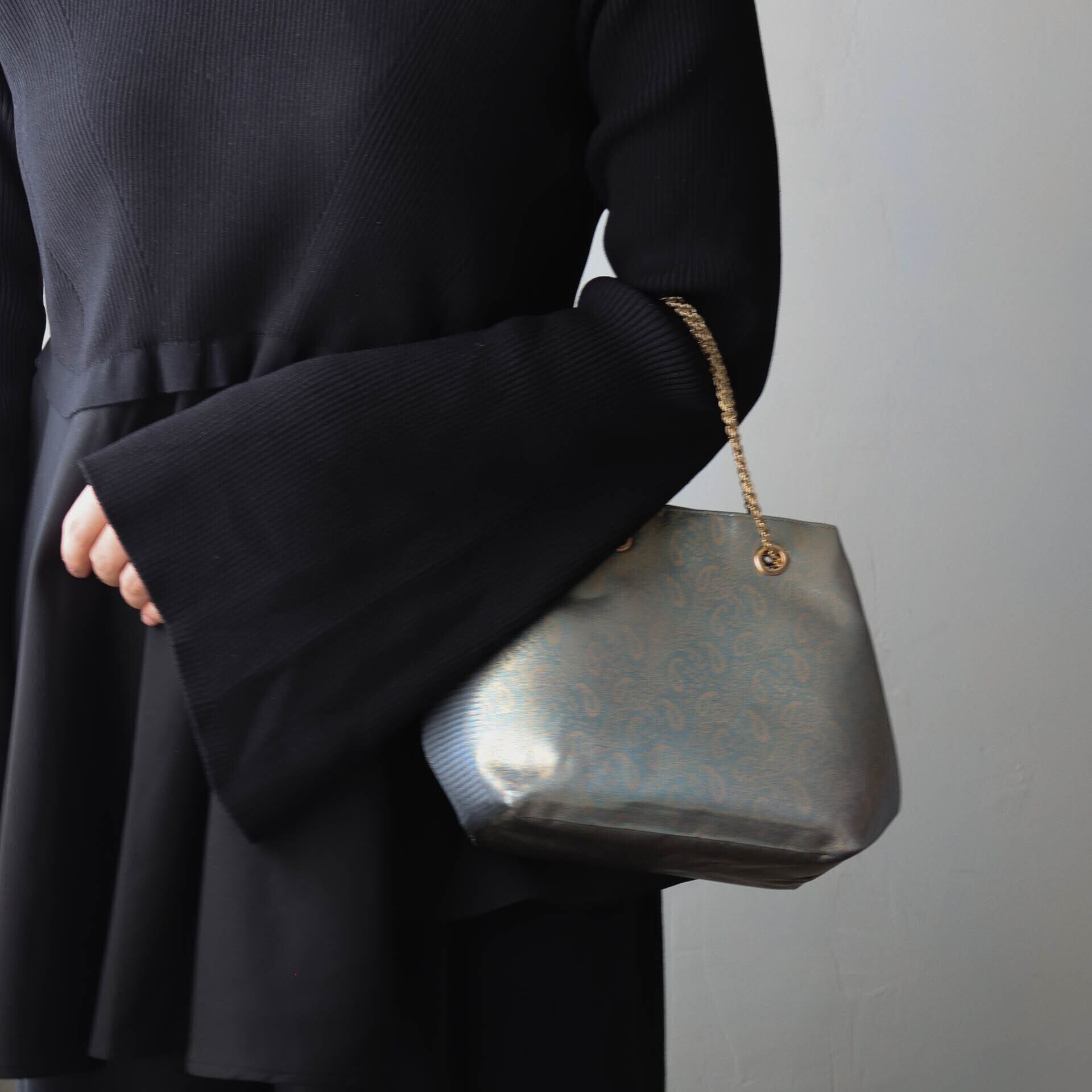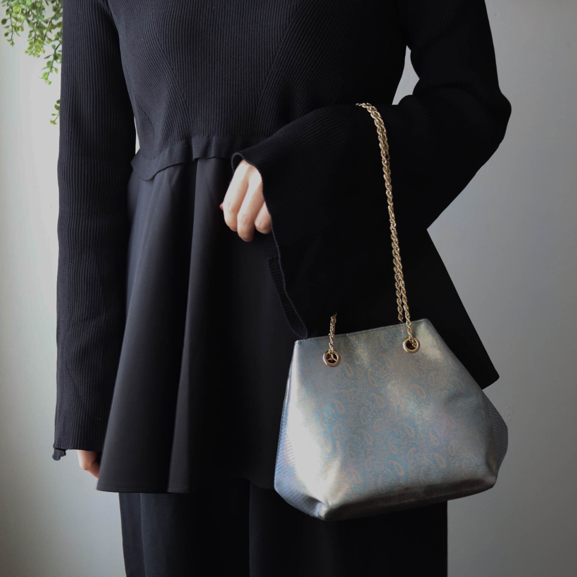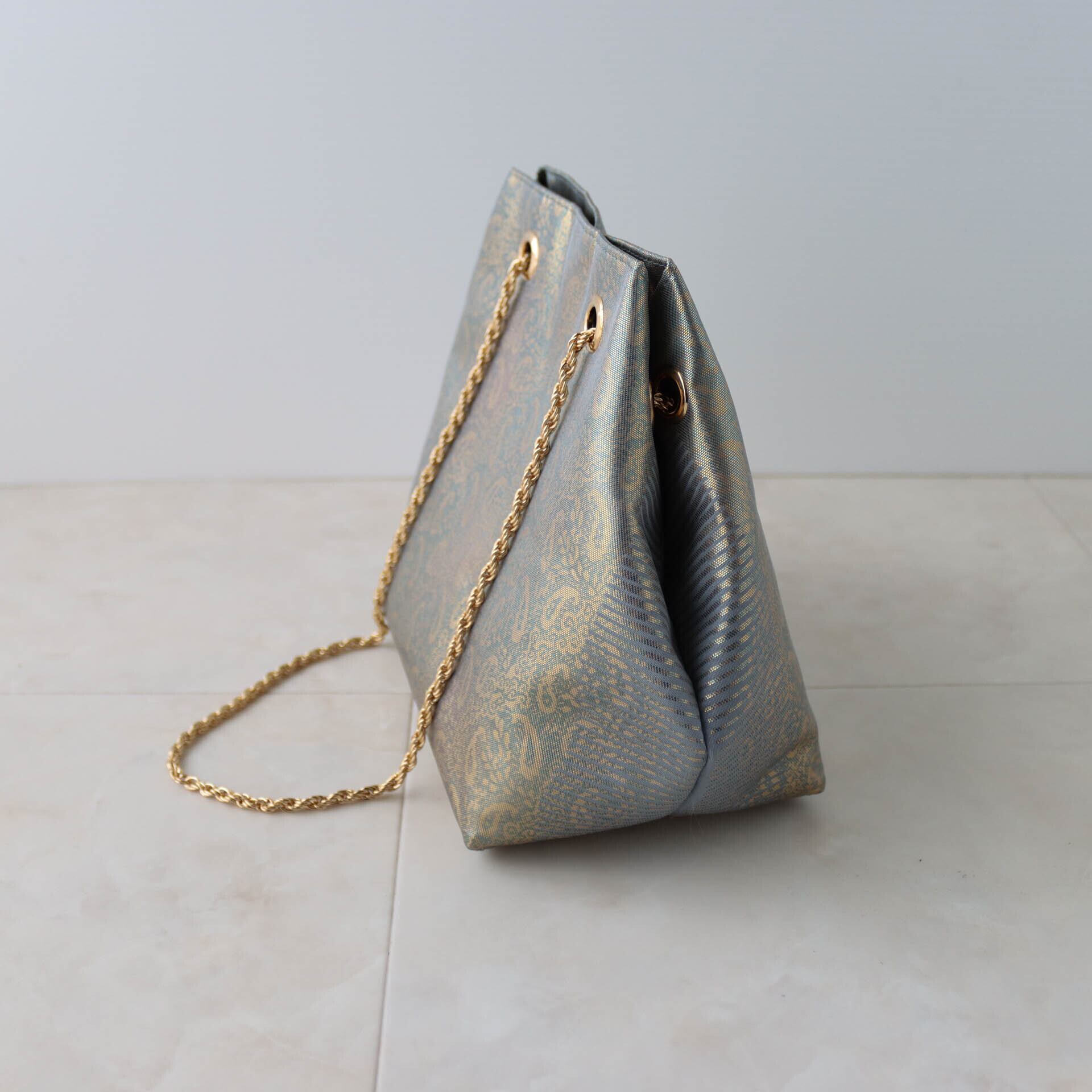 Obi Drawstring Bag Cube /ペイズリー引箔/ paisley blue gray gold