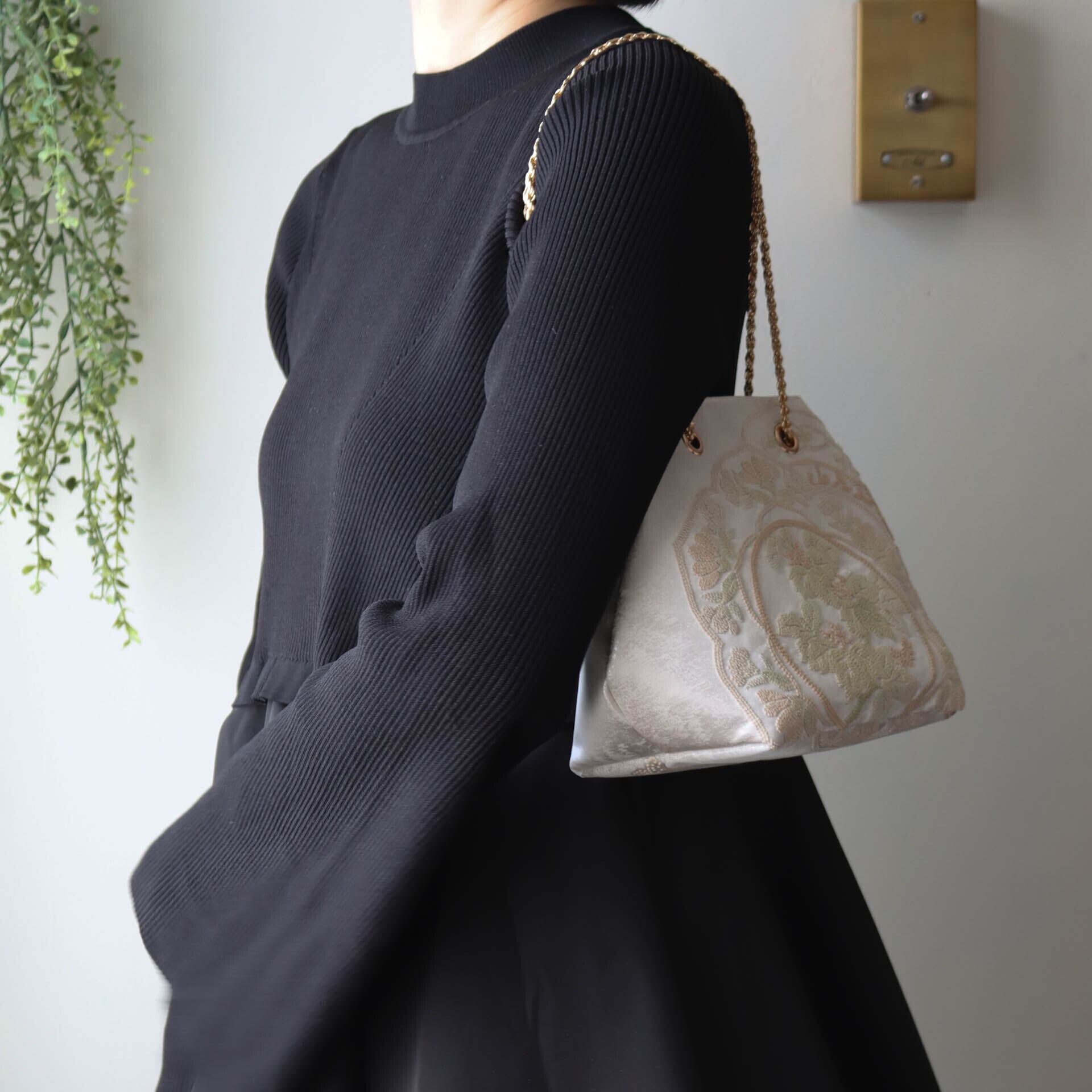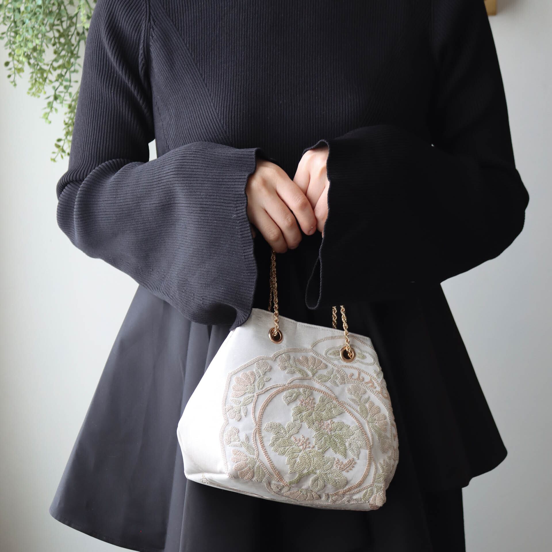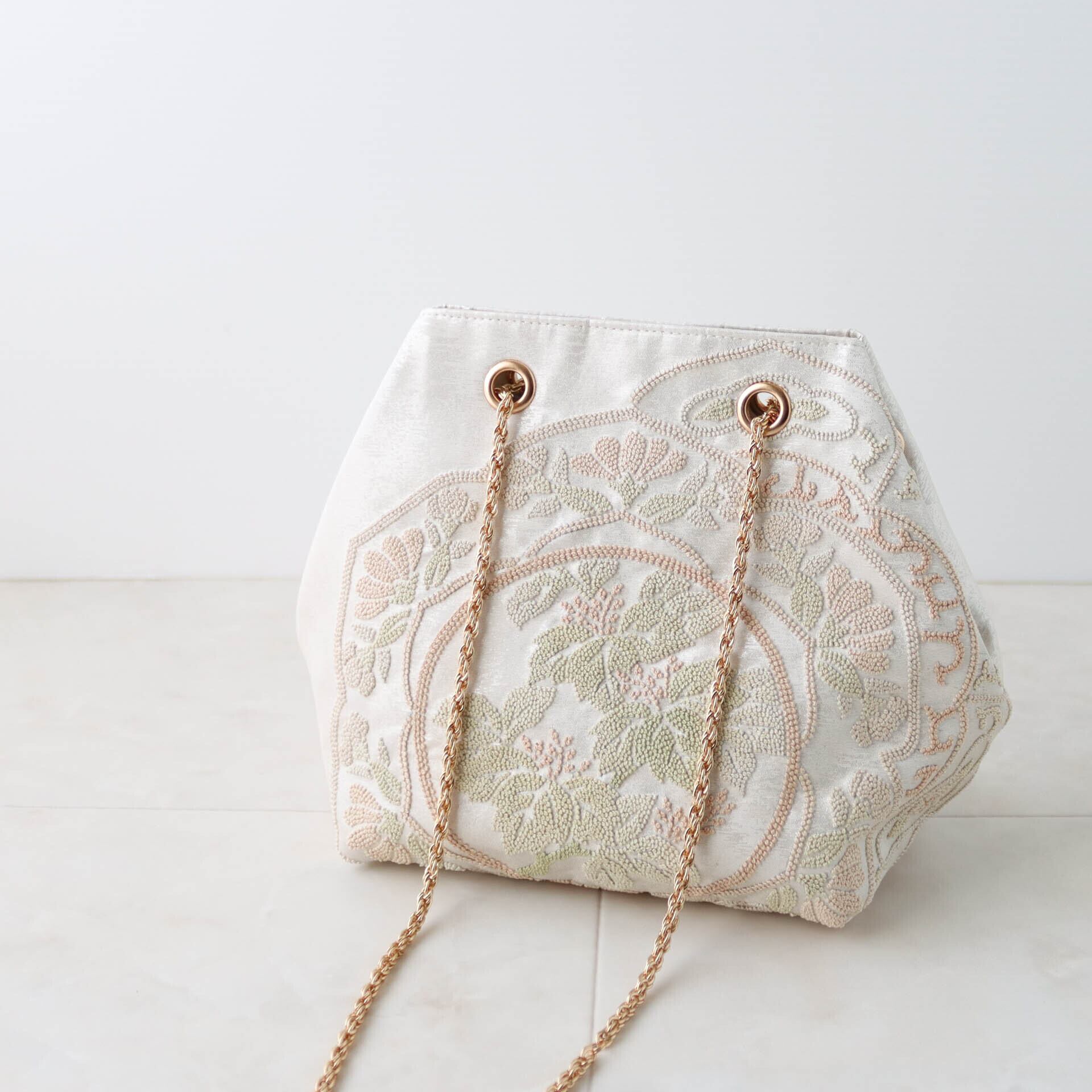 オフホワイトの引箔に淡いトーンの相良刺繍が施されています。