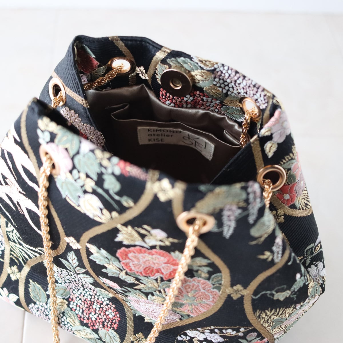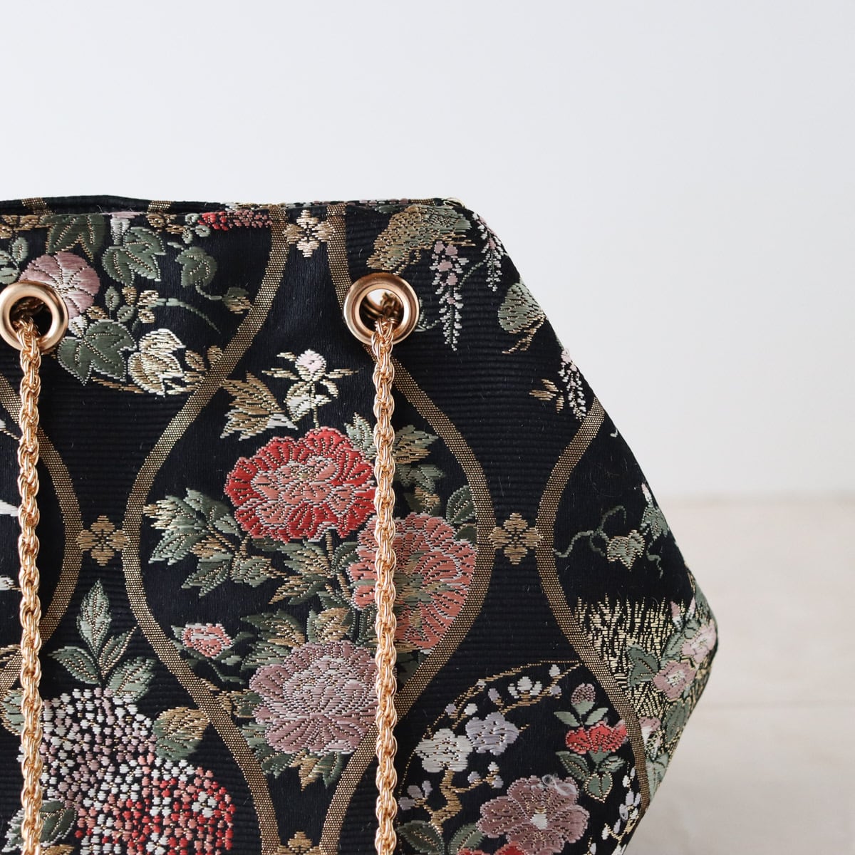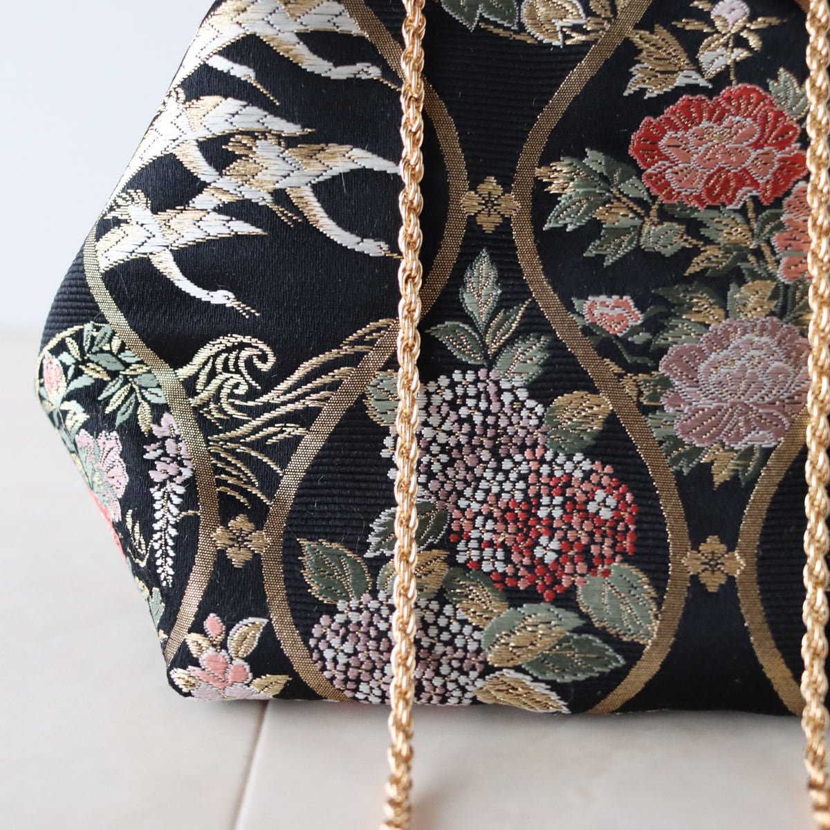 細かなで繊細な四季花の模様が、黒のかっこよさのなかに、華やかな可愛らしさを感じるバッグです
