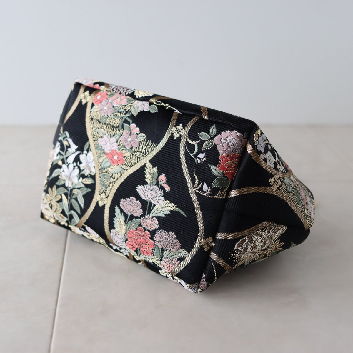 Obi Drawstring Bag Cube /黒地に立涌に四季花/Four seasons flowers on a black background