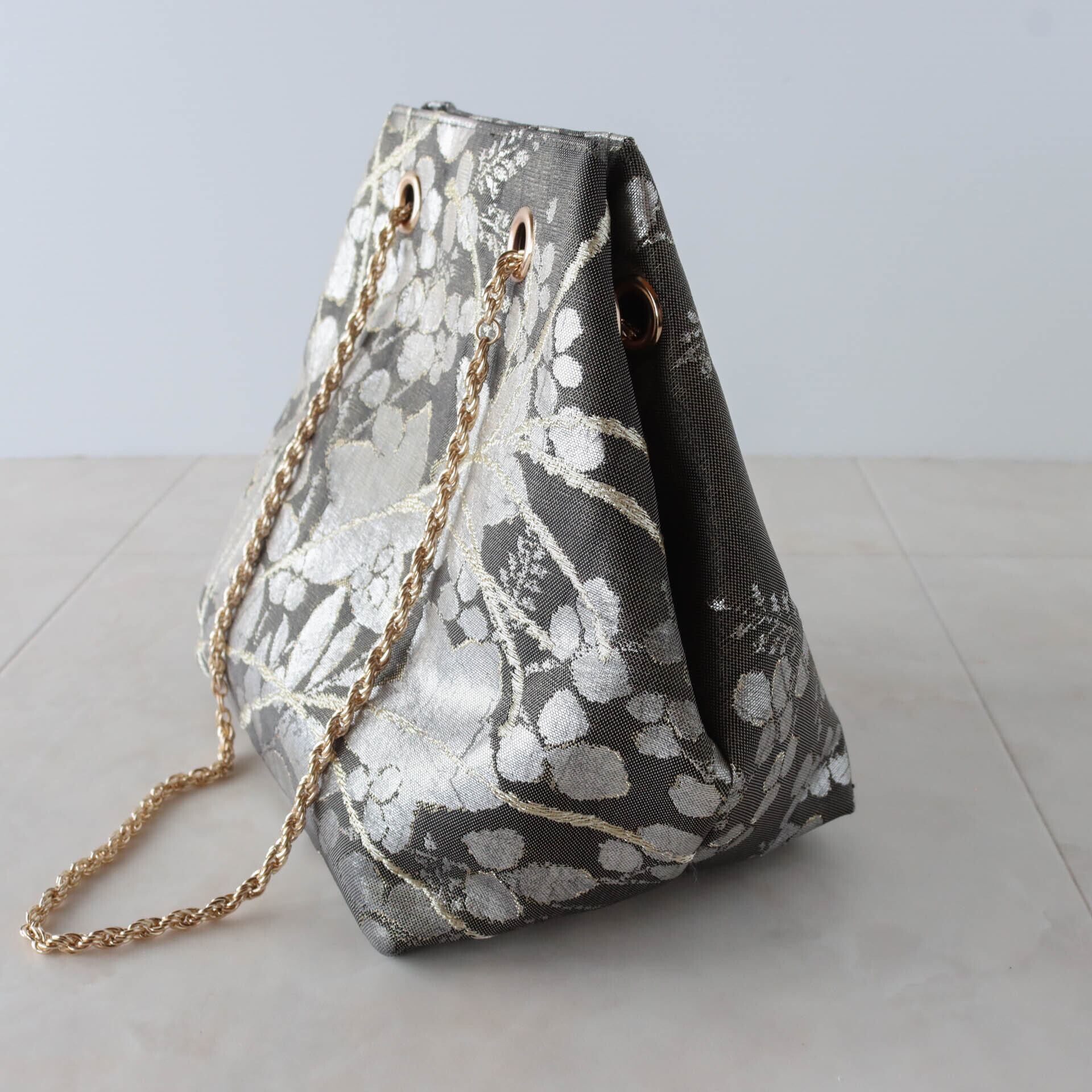 チャコールグレーの地色にシルバーの花模様、ホワイトゴールドの枝模様が描かれたシックな雰囲気のバッグです。