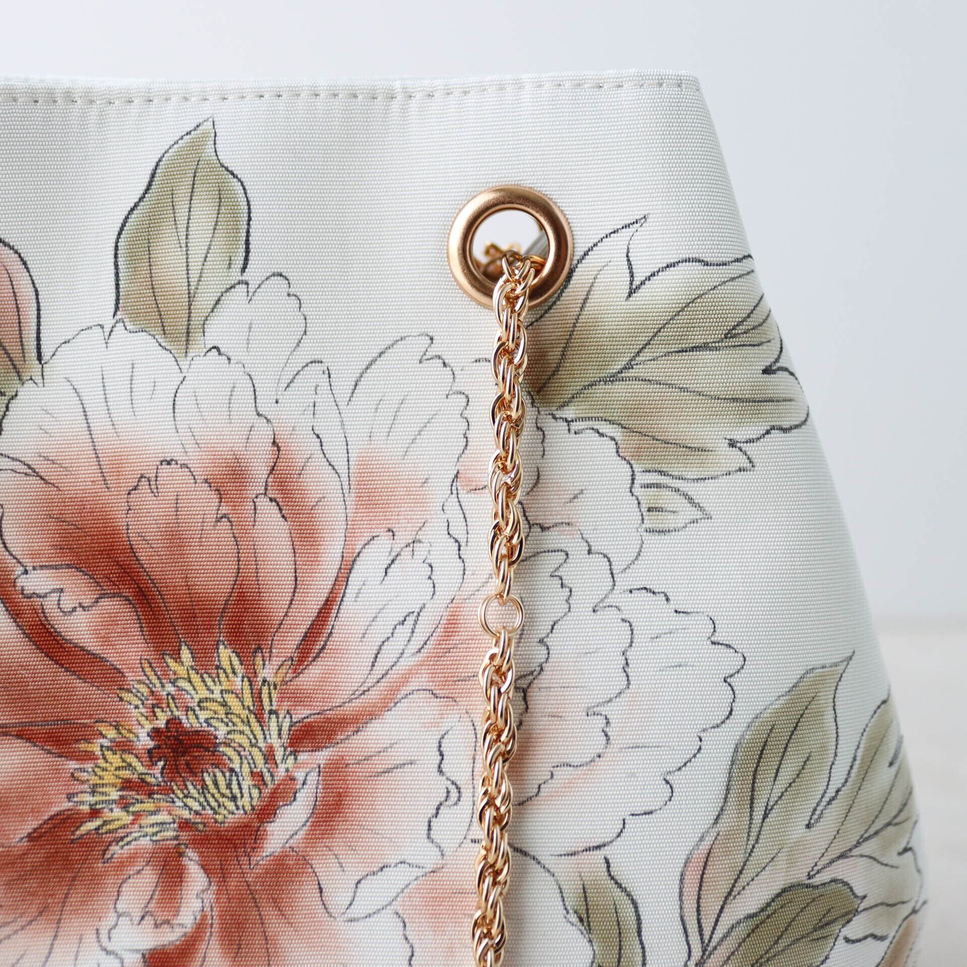 オフホワイト地に落ち着いたトーンで描かれた牡丹が優雅で優しい雰囲気です。