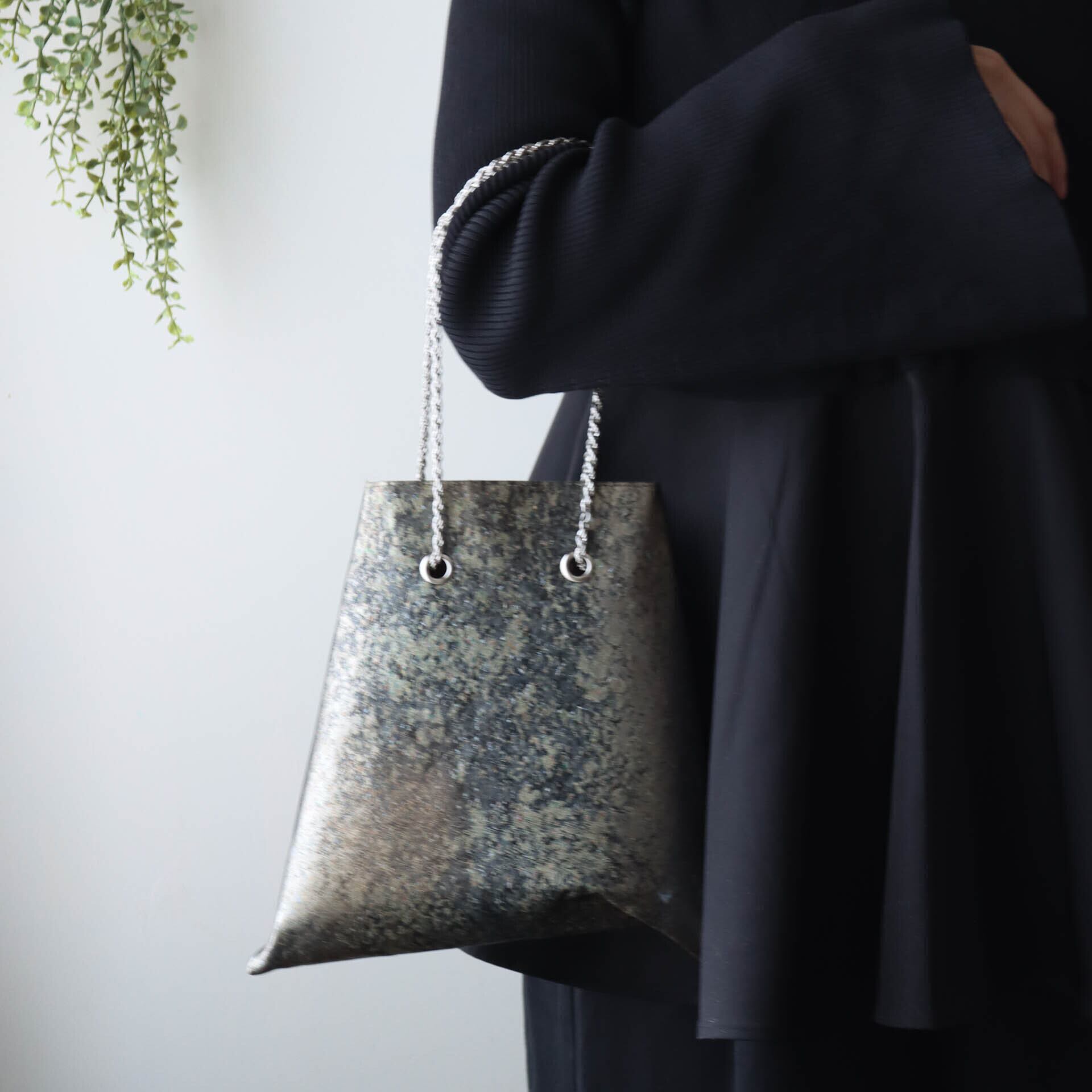 ダークシルバーとブラック、ブロンズのような色が混ざりあったかっこいい雰囲気のバッグです。
