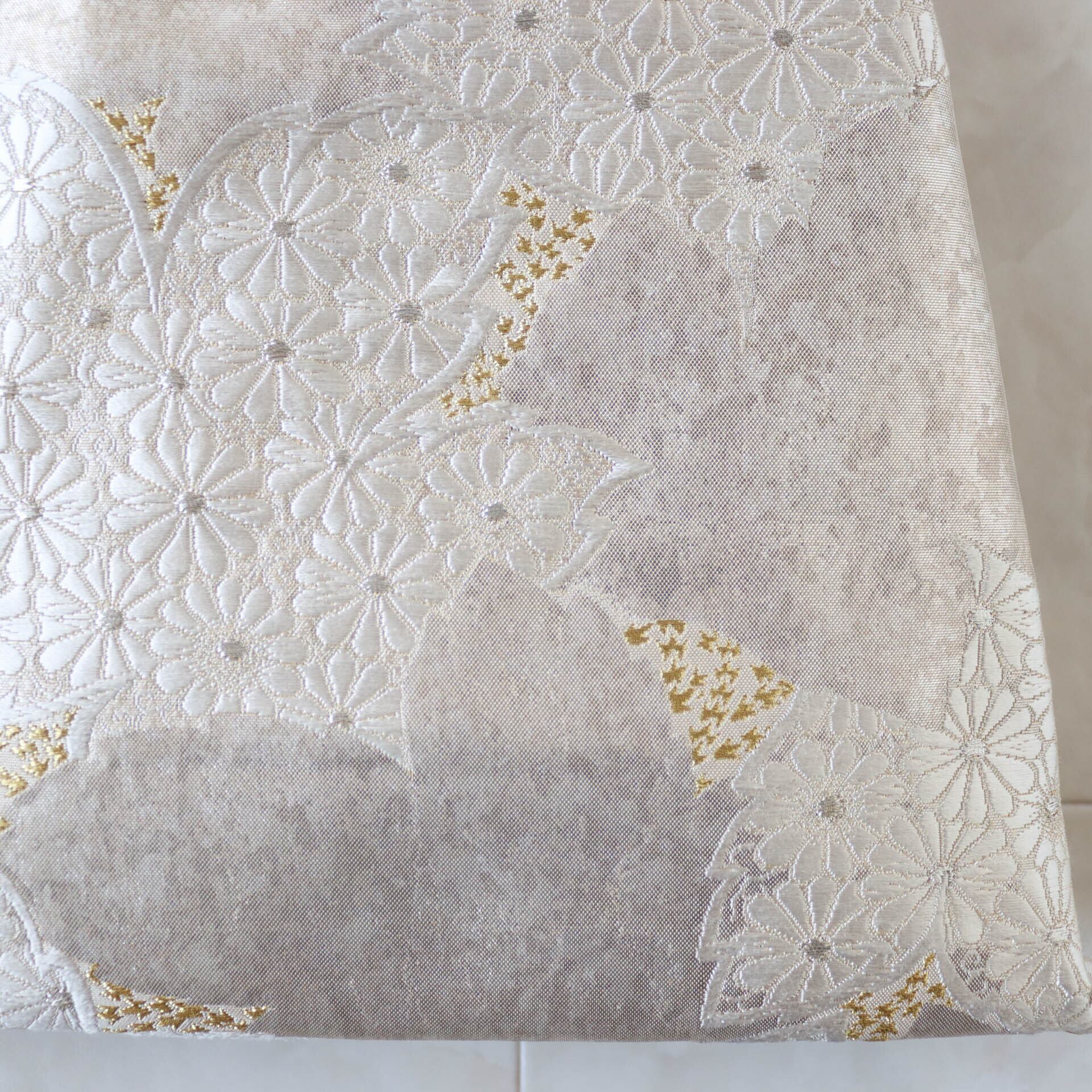 ベージュシルバー地に大きな楓模様、その中に白の小菊が織られている素敵な模様です。