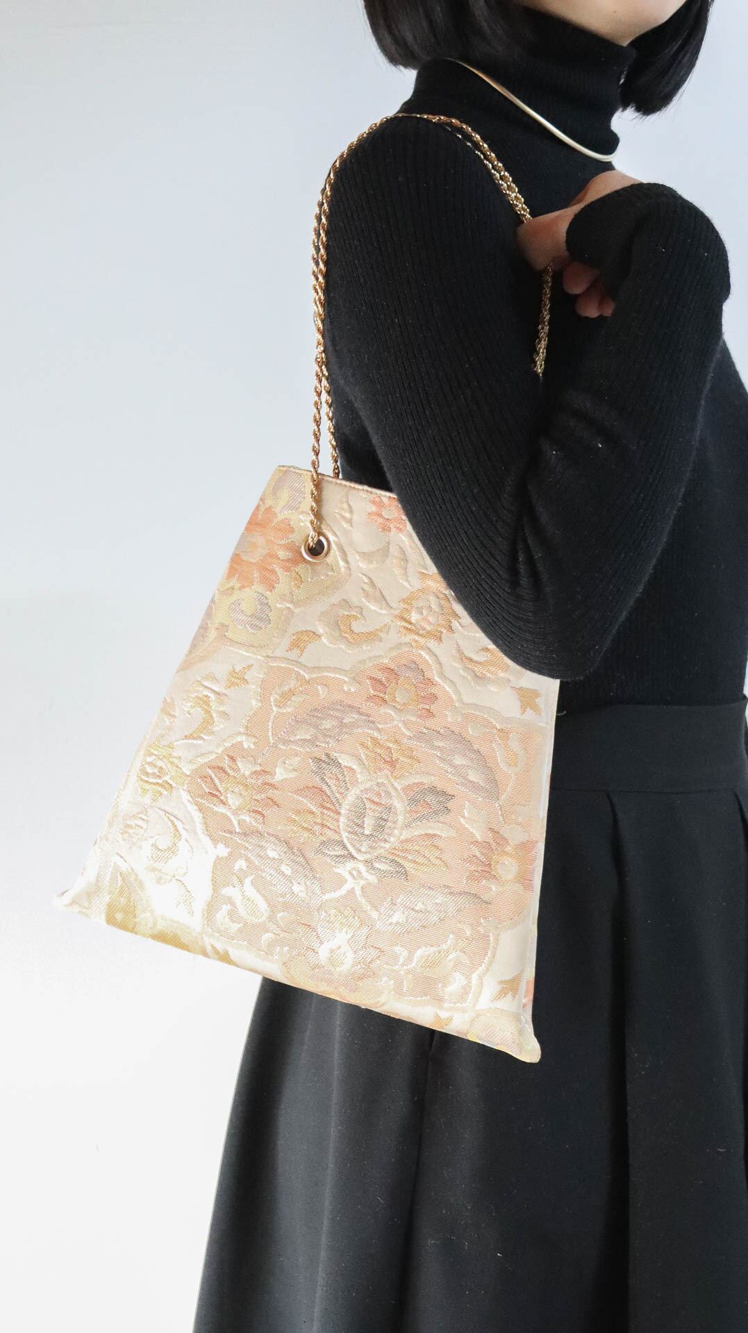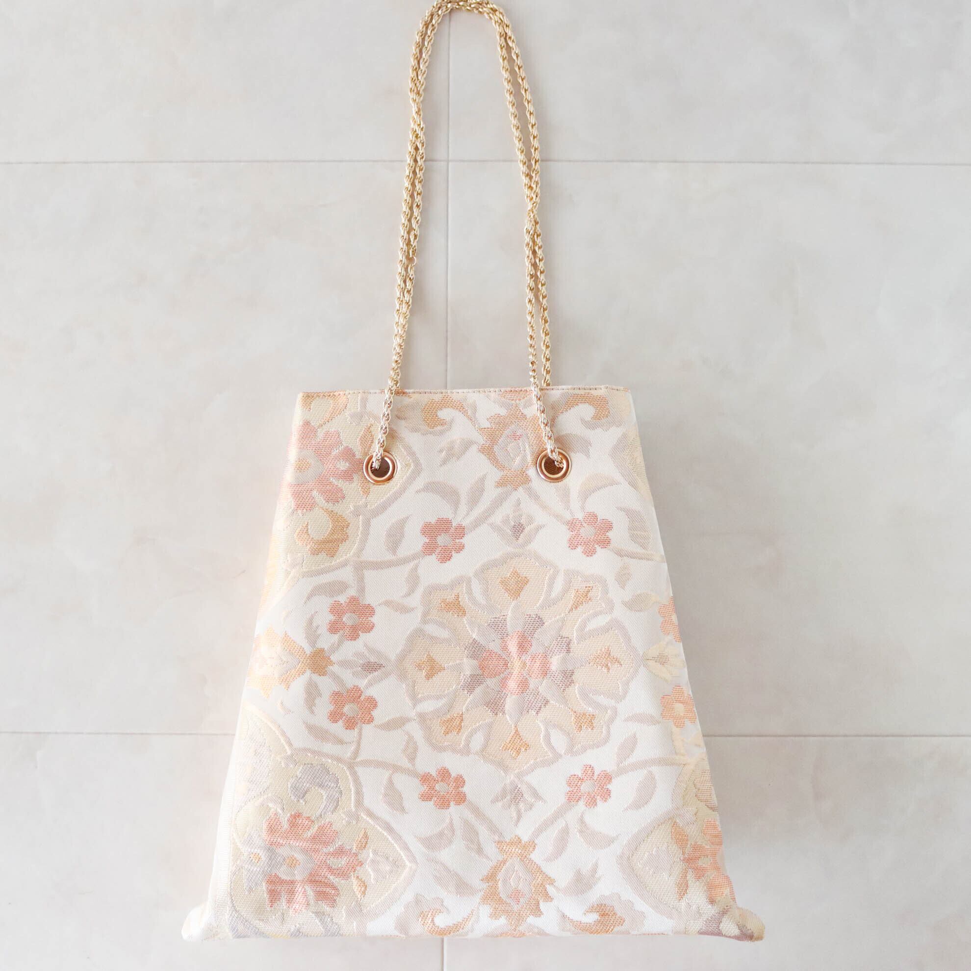 淡いベージュ地に、大胆にかかれた更紗紋が美しいバッグです。